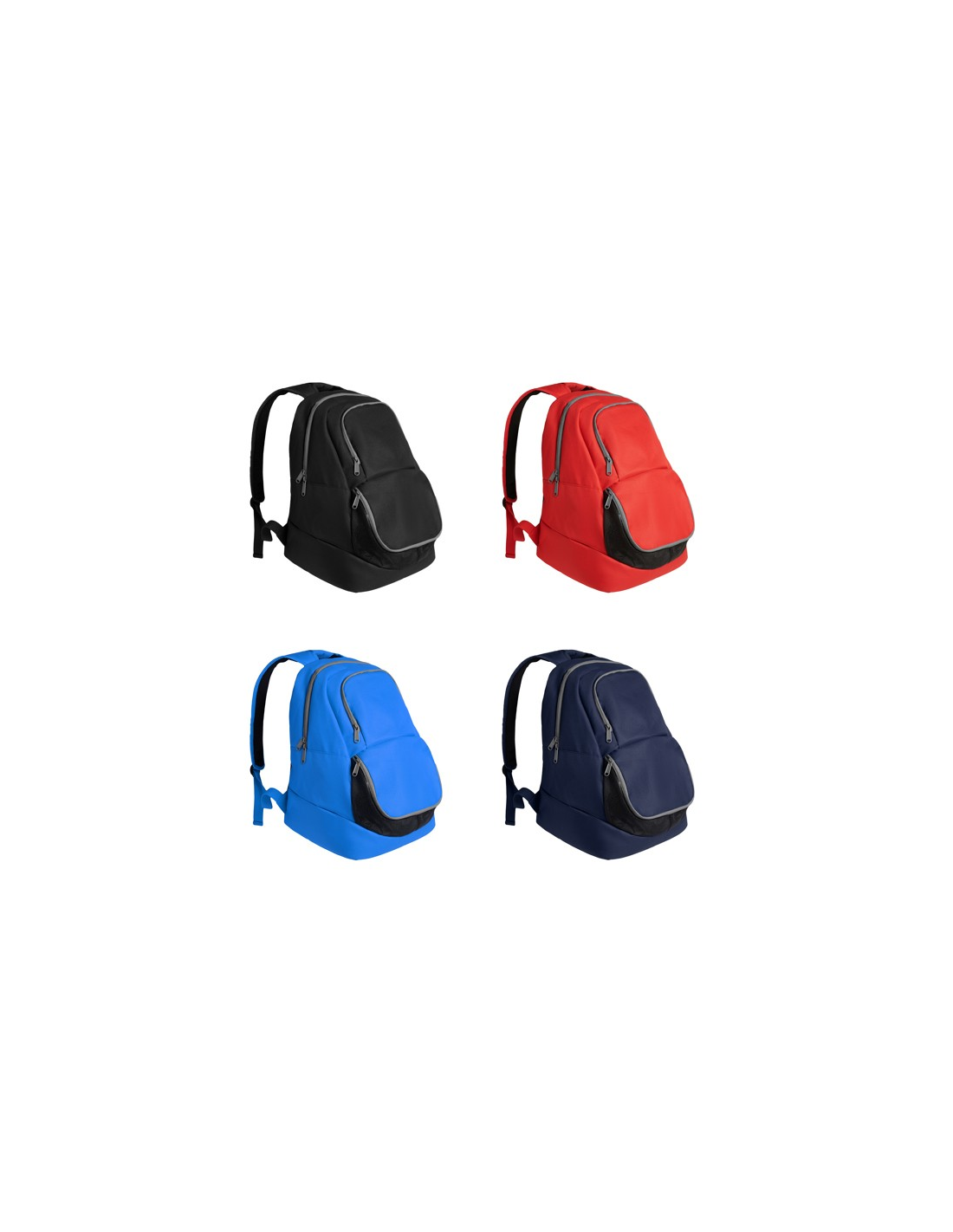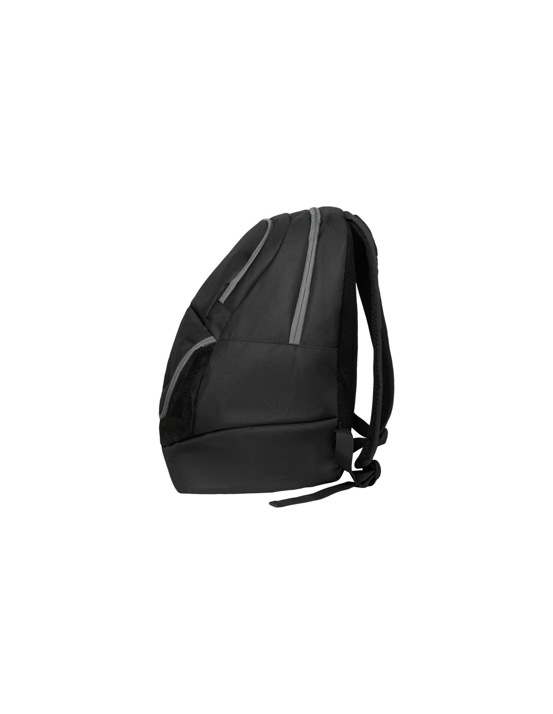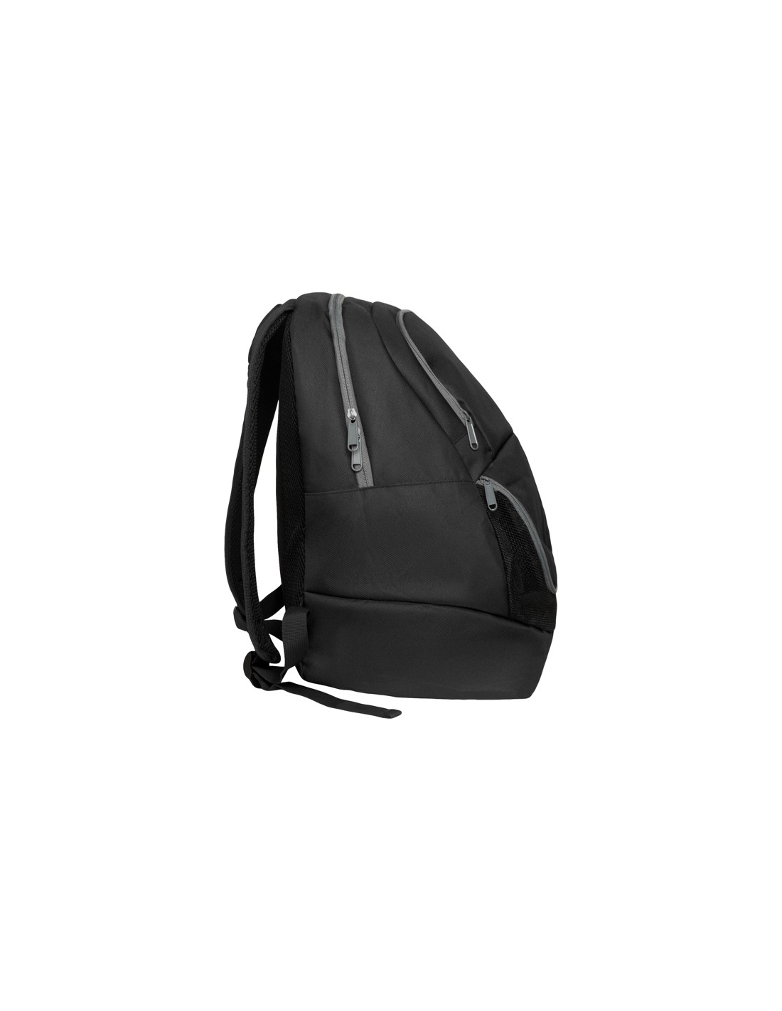 Plecak sportowy o ergonomicznym kształcie i łatwej personalizacji: - Podwójnie wzmocnione paski na ramiona i specjalny pasek na rękę. - Wyściełane oparcie. - Z przodu kieszeń na buty. - Jedna główna kieszeń z podwójnym ściągaczem oraz zewnętrzna przednia kieszeń o mniejszej pojemności. - Kontrastowe szare zamki błyskawiczne. - Czarne detale.