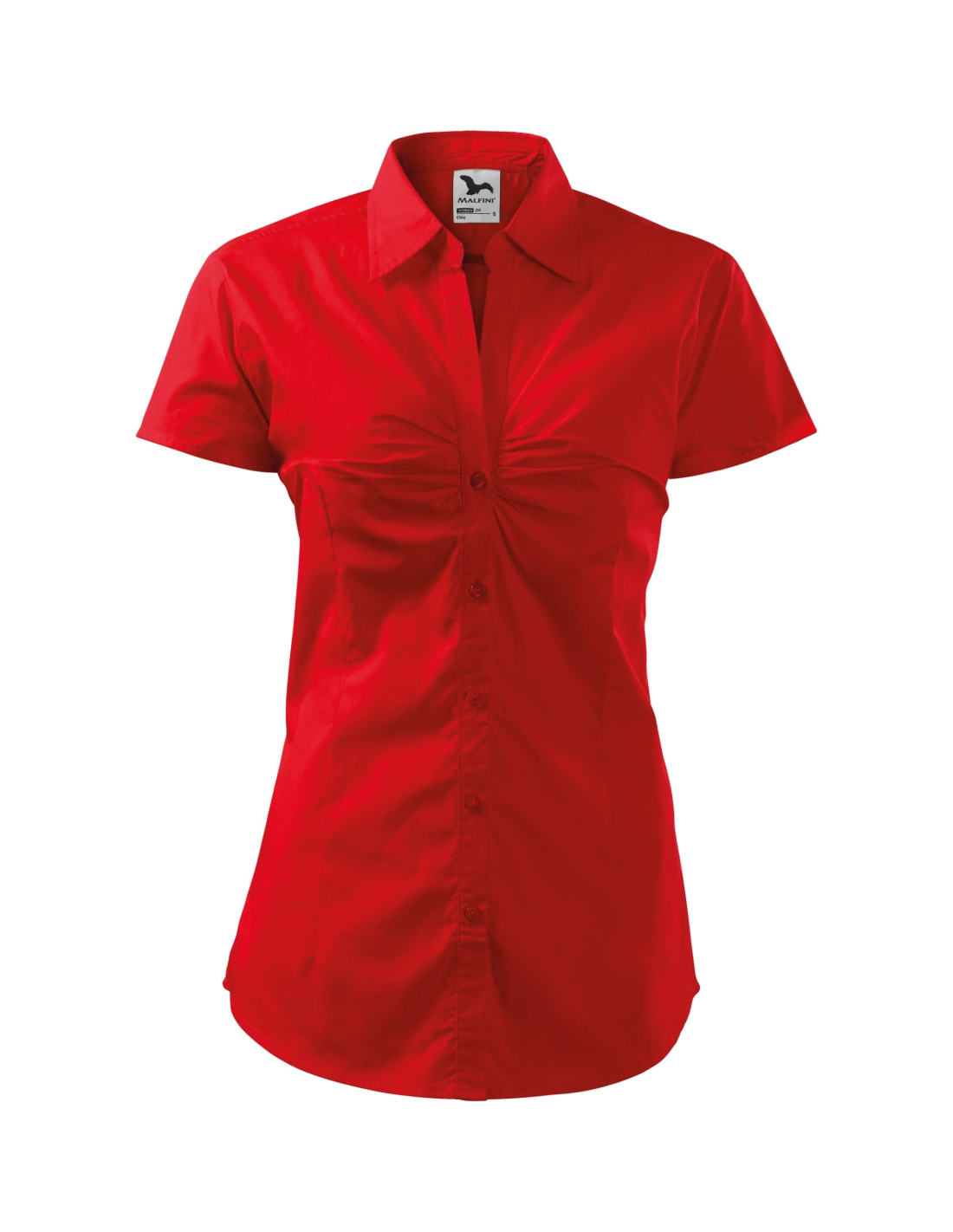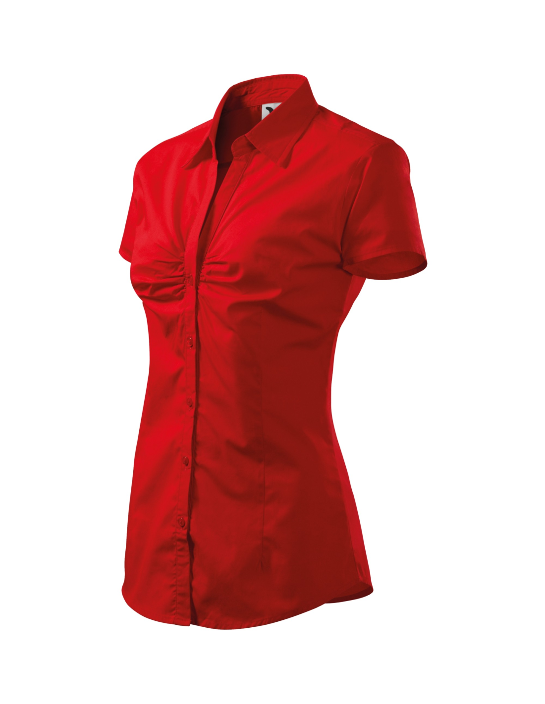 pojedynczy karczek i zaszewki z tyłu, zaszewki w pasie, ozdobne falbanki na klatce piersiowej, dwuczęściowy kołnierzyk koszuli w szpicę, części przednie wykończone plisą, guziki w kolorze materiału (1 zapasowy), zaokrąglony dół