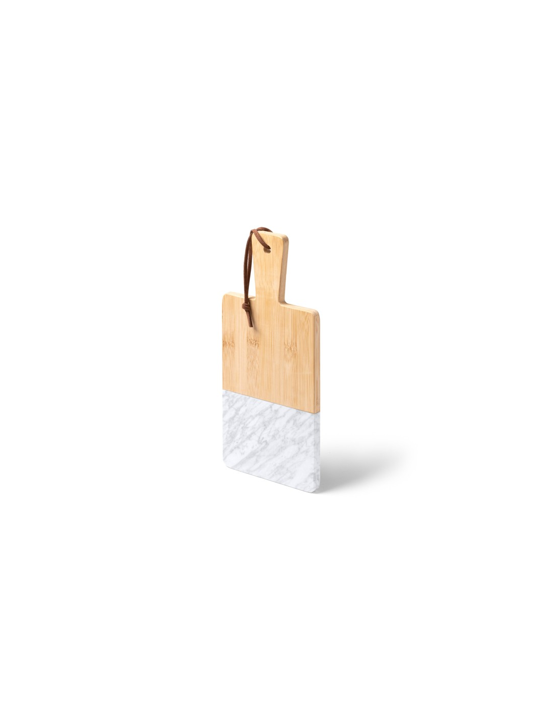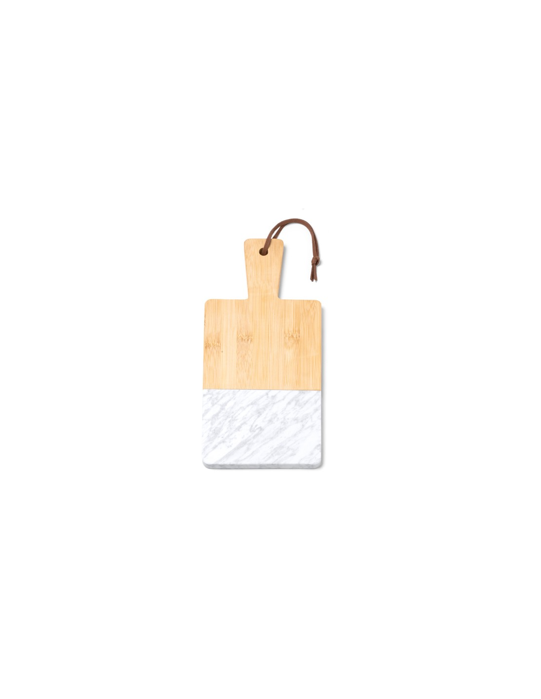 Deska do krojenia wykonana z naturalnego marmuru i bambusa. Pasek na ramię wykonany ze sztucznej skóry w zestawie. Zapakowana w pudełku zaprojektowanym z myślą o środowisku.