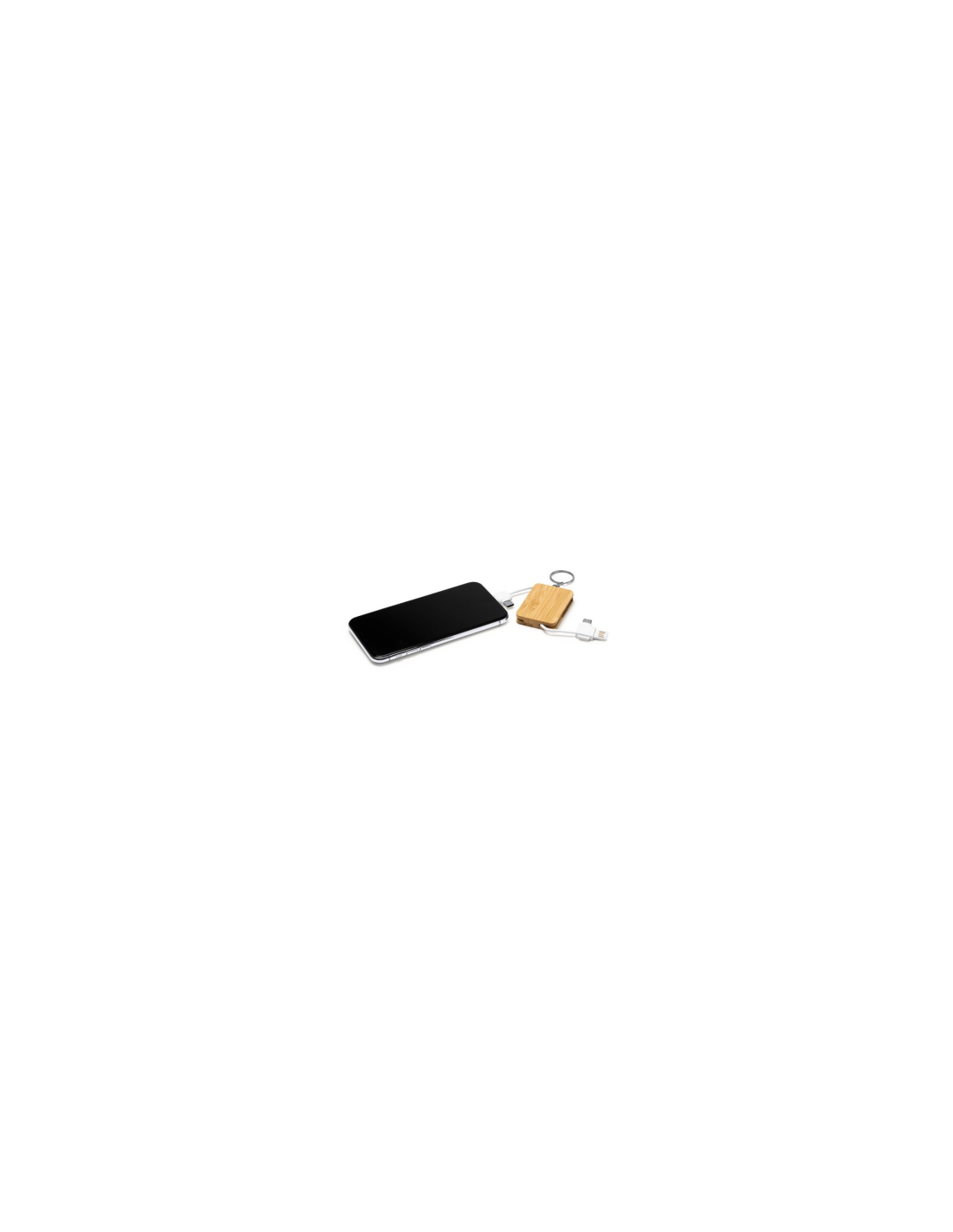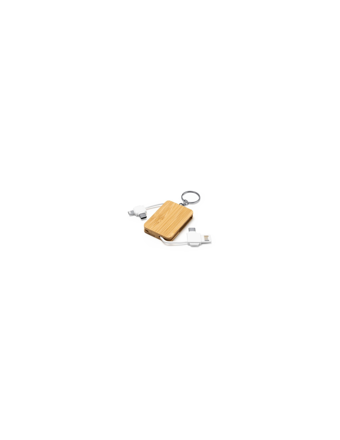 Brelok z kablem ładującym 3 w 1. Główna konstrukcja wykonana z bambusa. Złącze mikro USB, USB typu C i Lightning. Zapakowany w pudełku z okienkiem zaprojektowanym z myślą o środowisku.