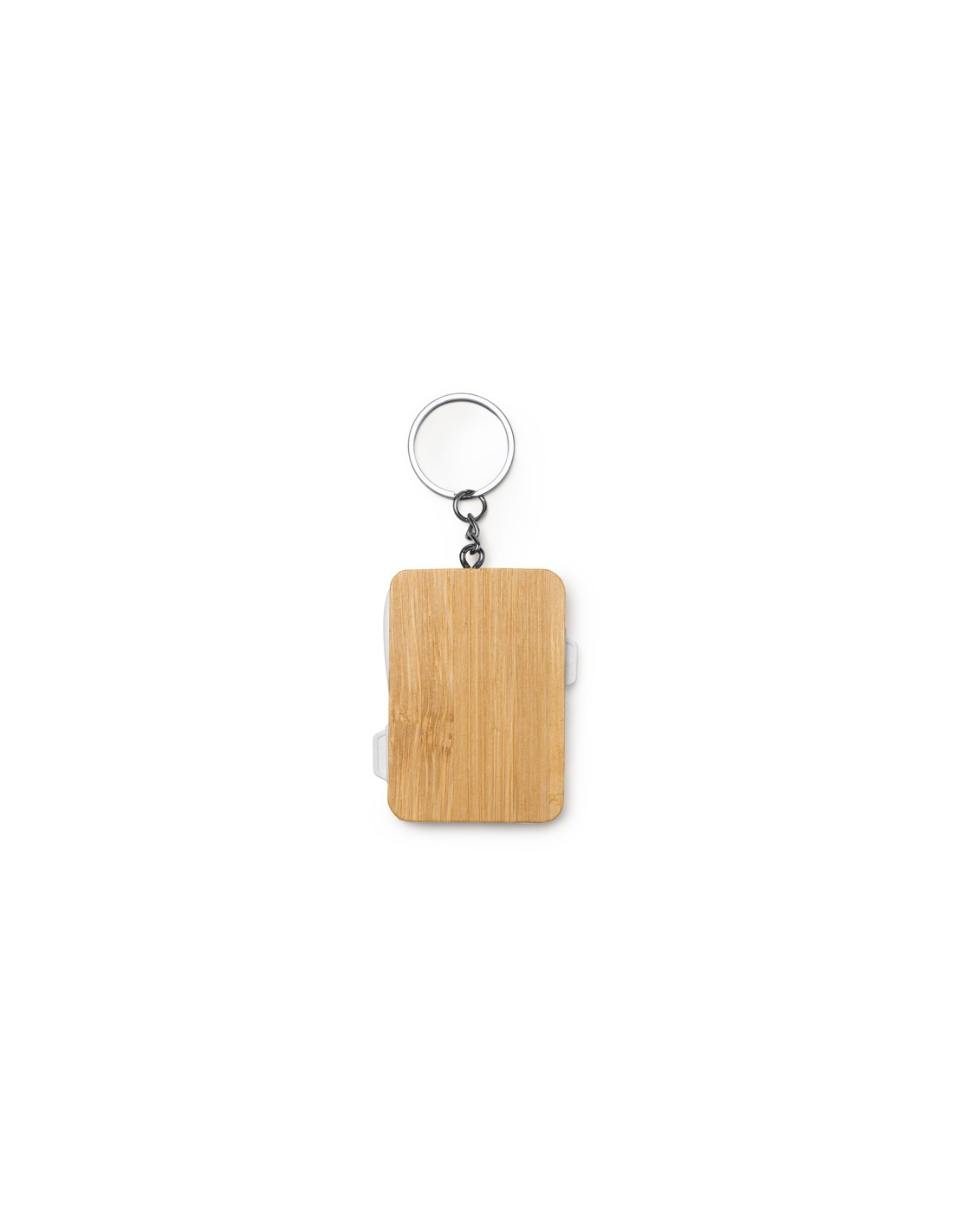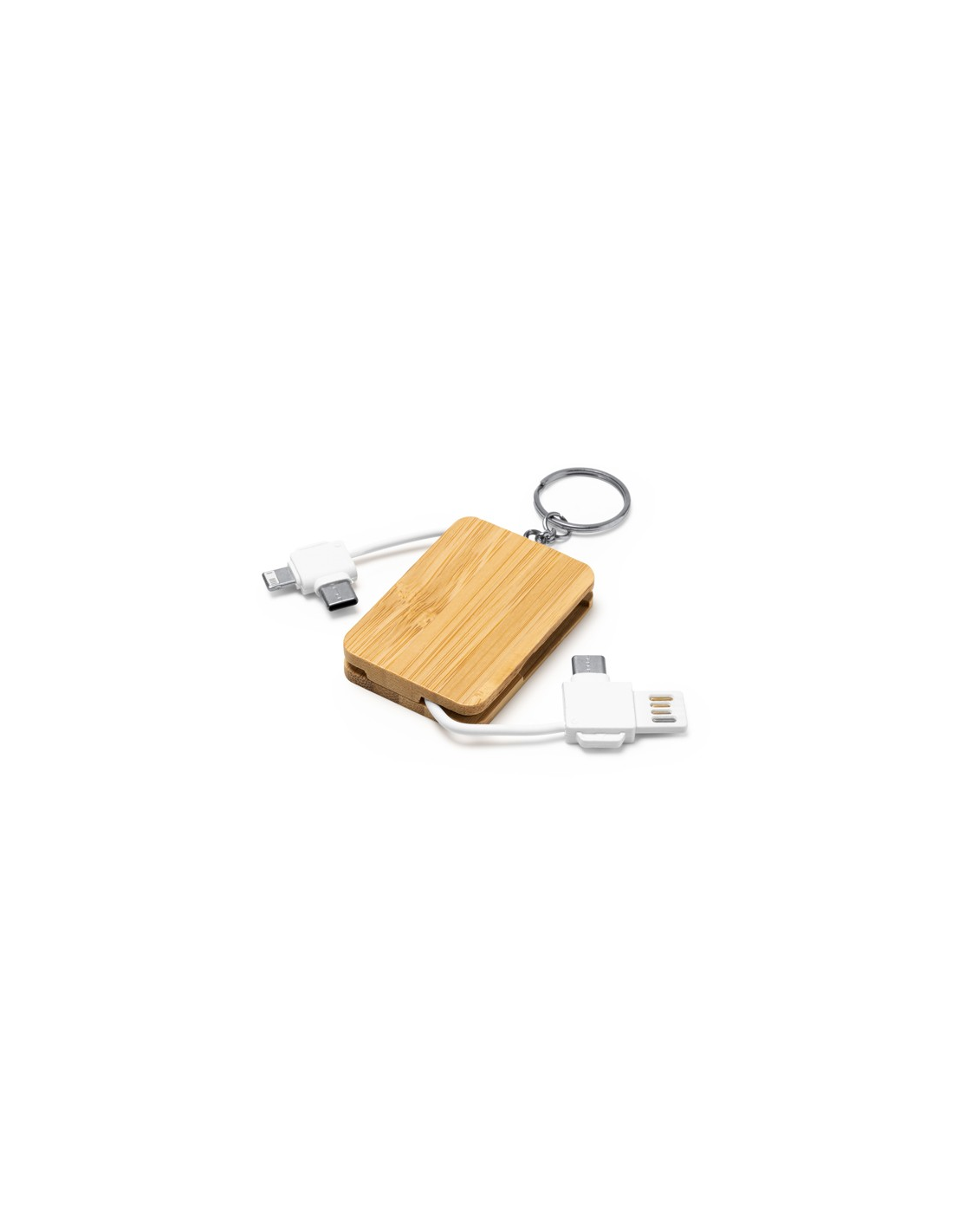 Brelok z kablem ładującym 3 w 1. Główna konstrukcja wykonana z bambusa. Złącze mikro USB, USB typu C i Lightning. Zapakowany w pudełku z okienkiem zaprojektowanym z myślą o środowisku.