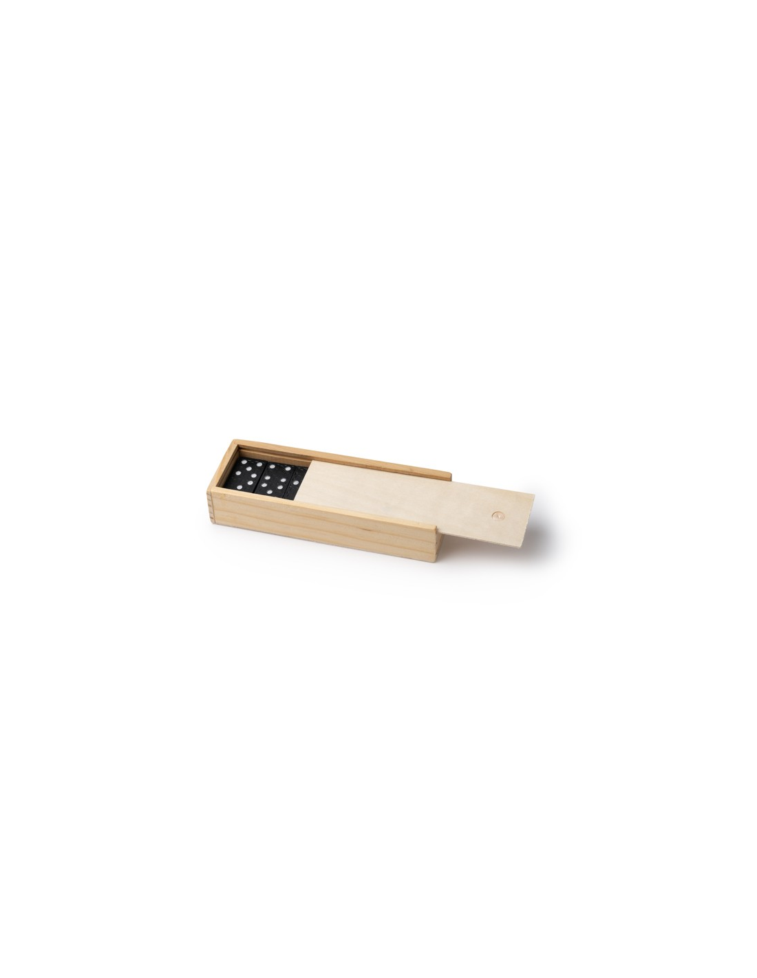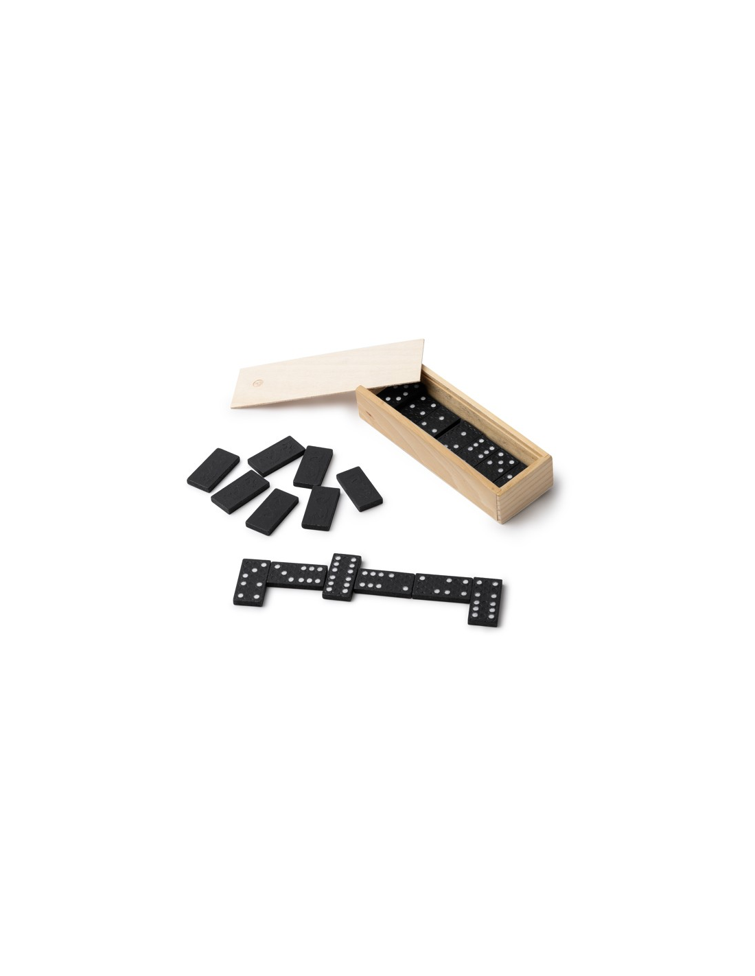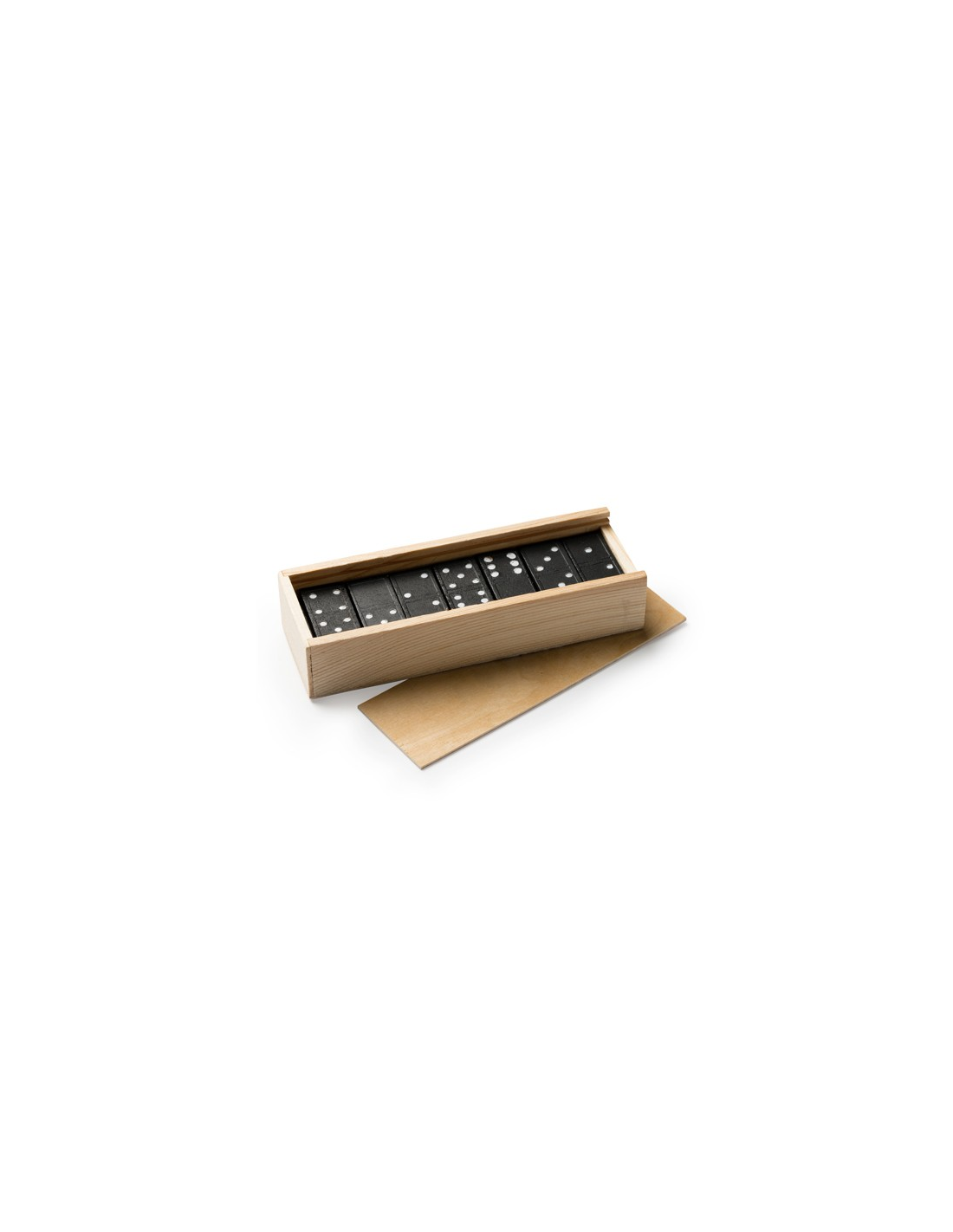 Gra domino wykonana z drewna. 28 elementów prezentowanych w pudełku z przesuwanym wieczkiem.