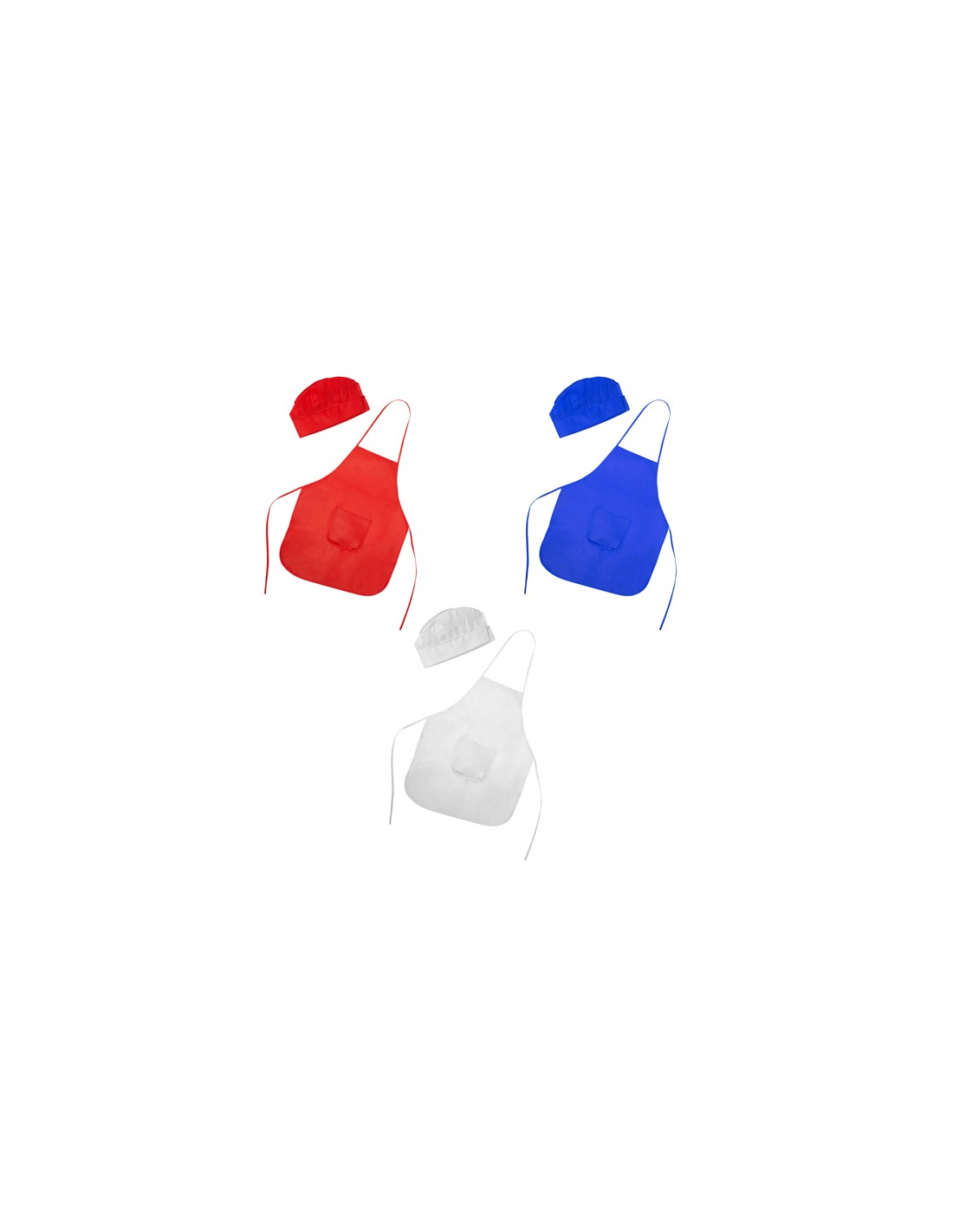 Zestaw kolorowego fartuszka z włókniny i czapeczki dla dzieci. Jeden rozmiar dla wszystkich, regulowany za pomocą rzepa na czapce.