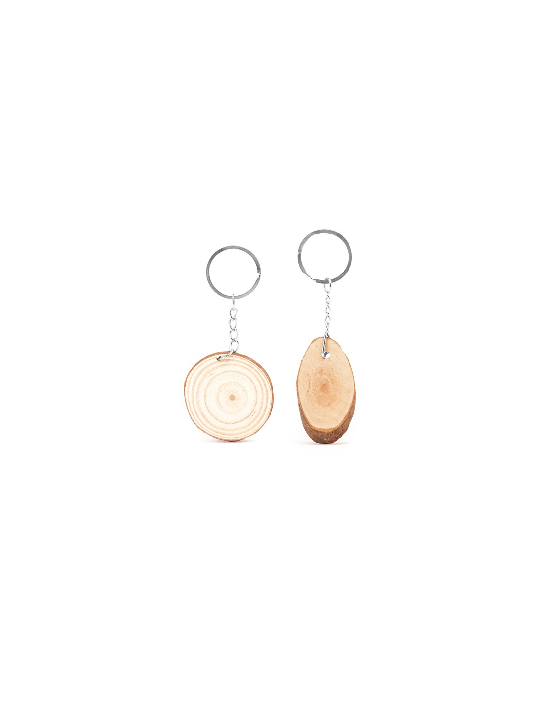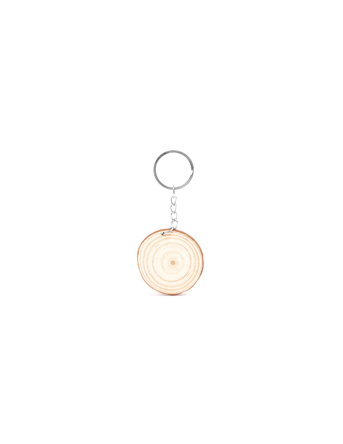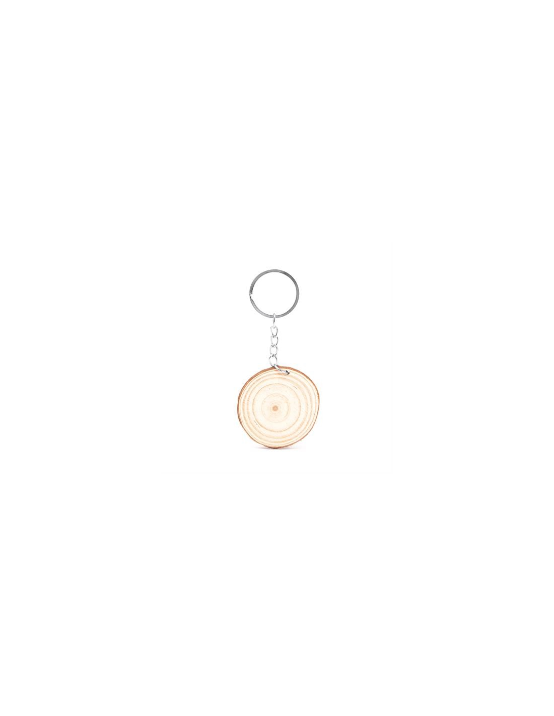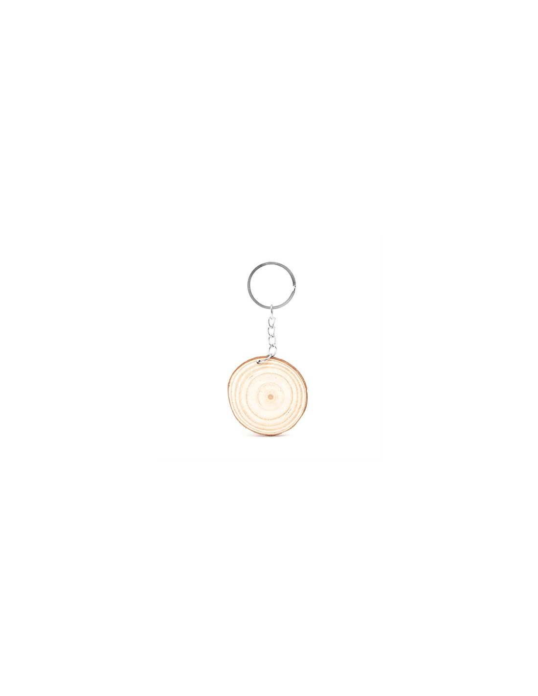 Cięty brelok wykonany z naturalnego drewna z metalowym kółkiem.