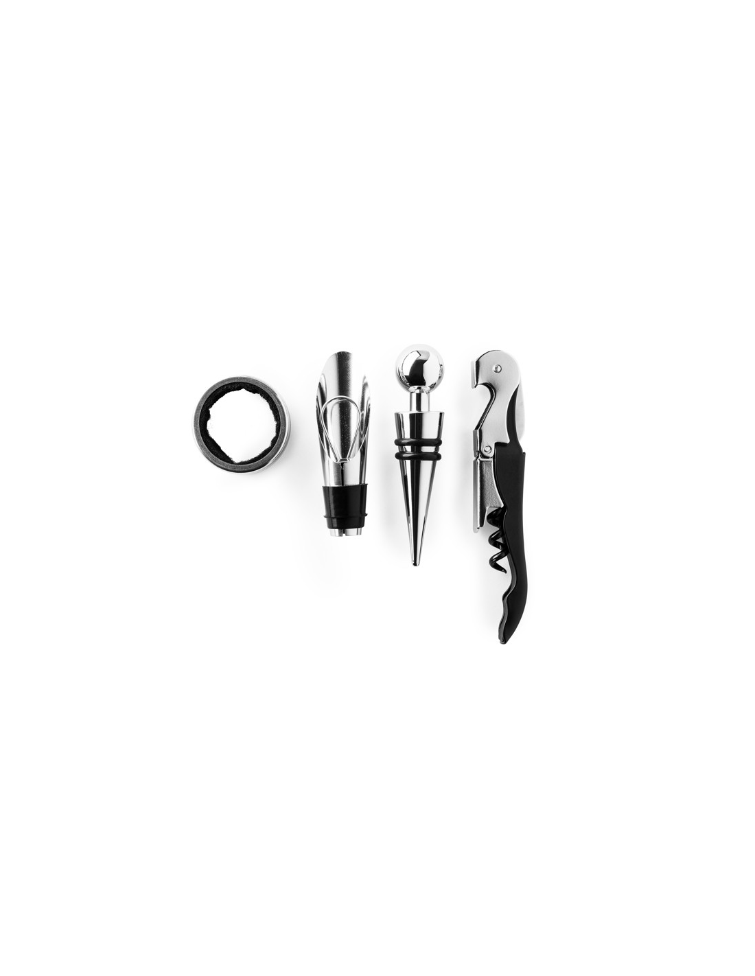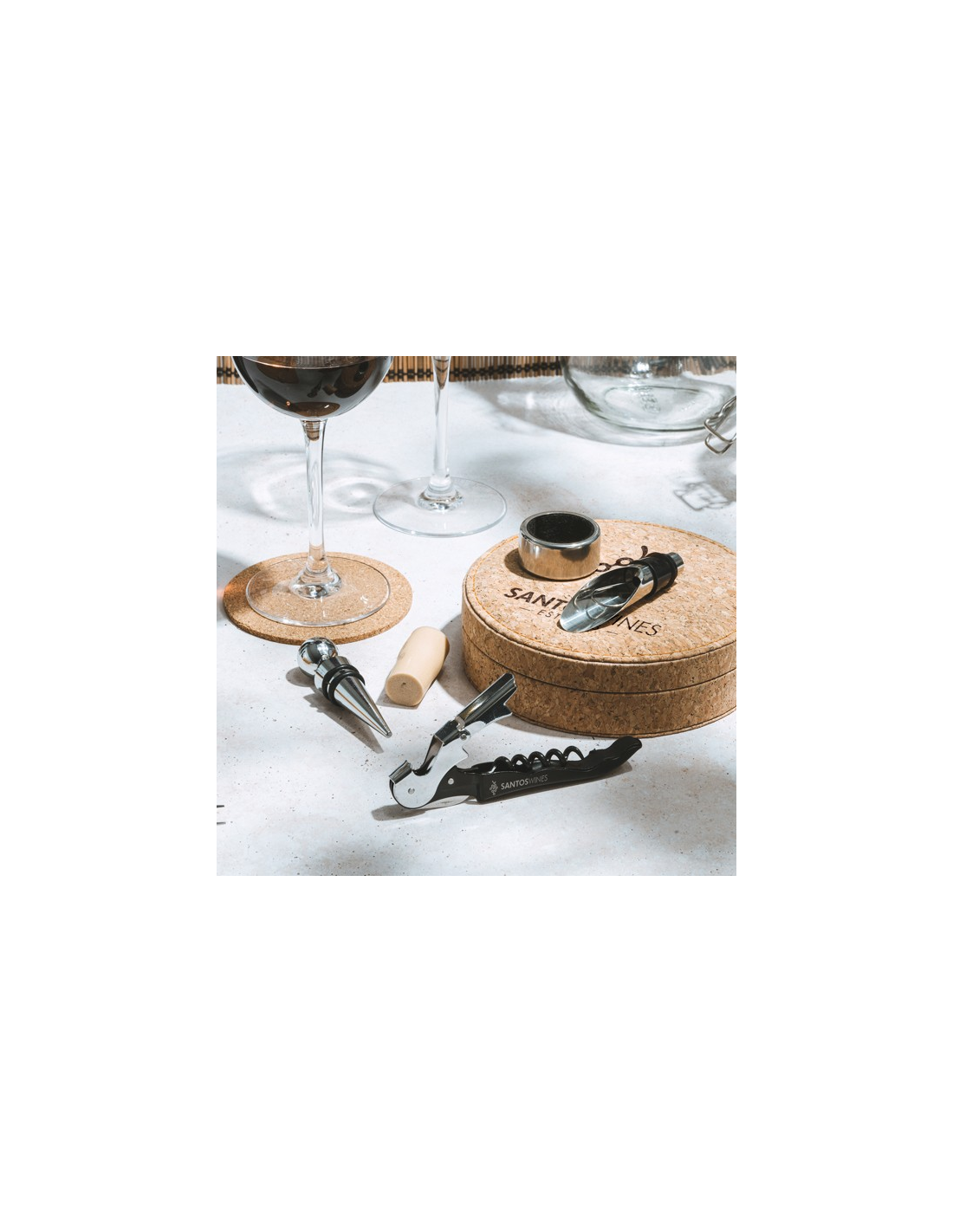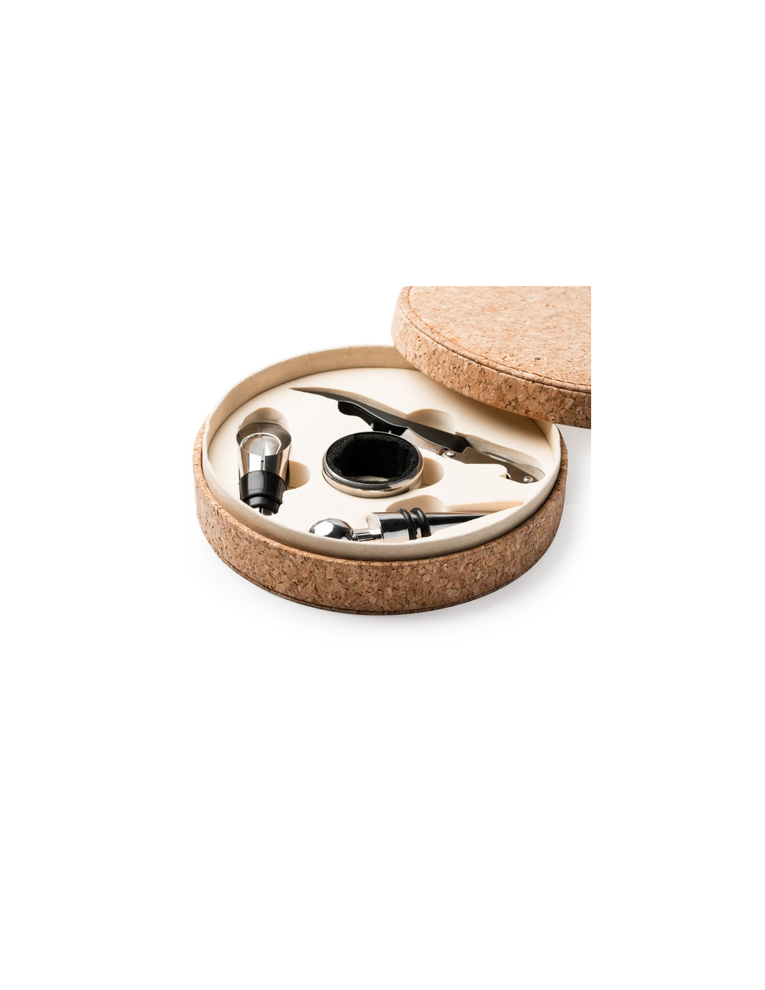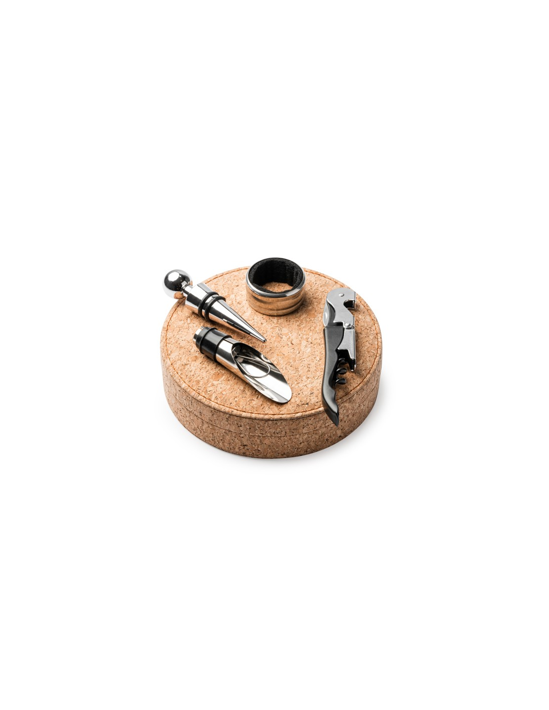 Zestaw do wina z akcesoriami ze stali nierdzewnej, korkociąg dwusuwowy z obcinaczem do kapsli, kroplomierzem i dozownikiem. Prezentowany w etui z naturalnego korka z wyściełanym wnętrzem.