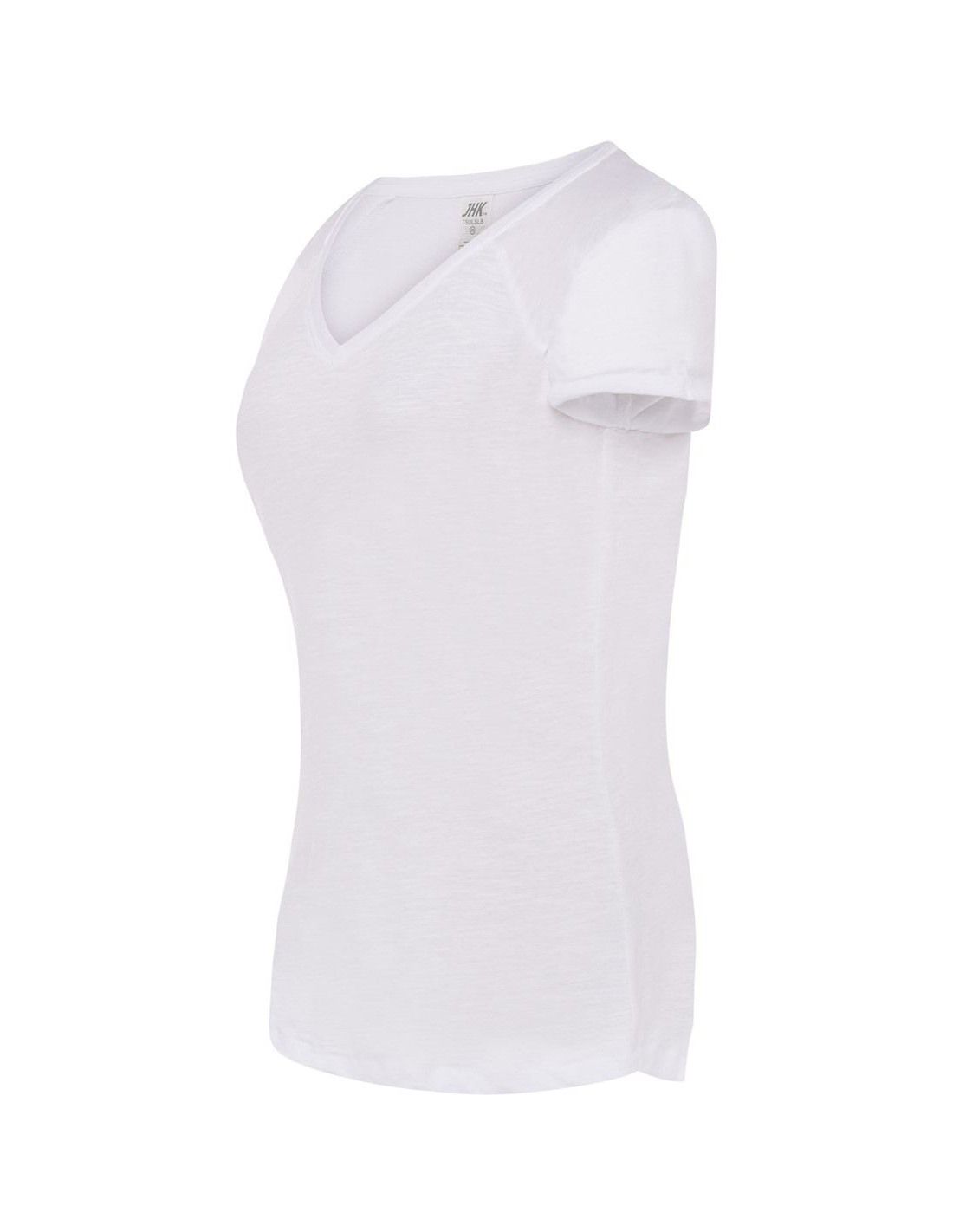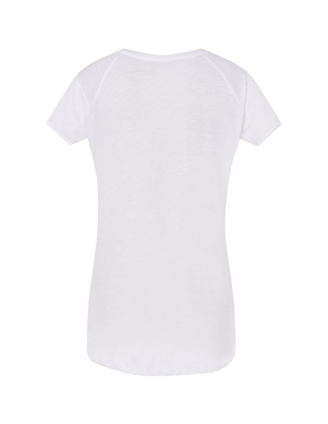 Damski Tshirt z rękawkami typu reglan. Single jersey, rękawki zawinięte. Modny niski ściągacz typu V-Neck. 100% bawełna.