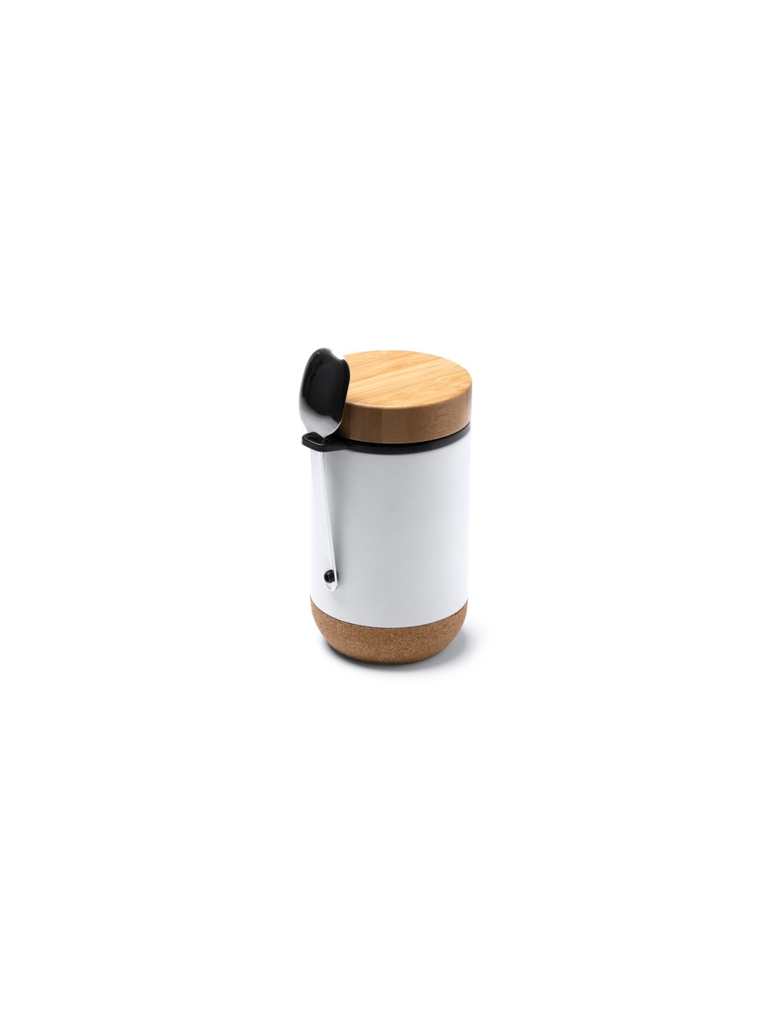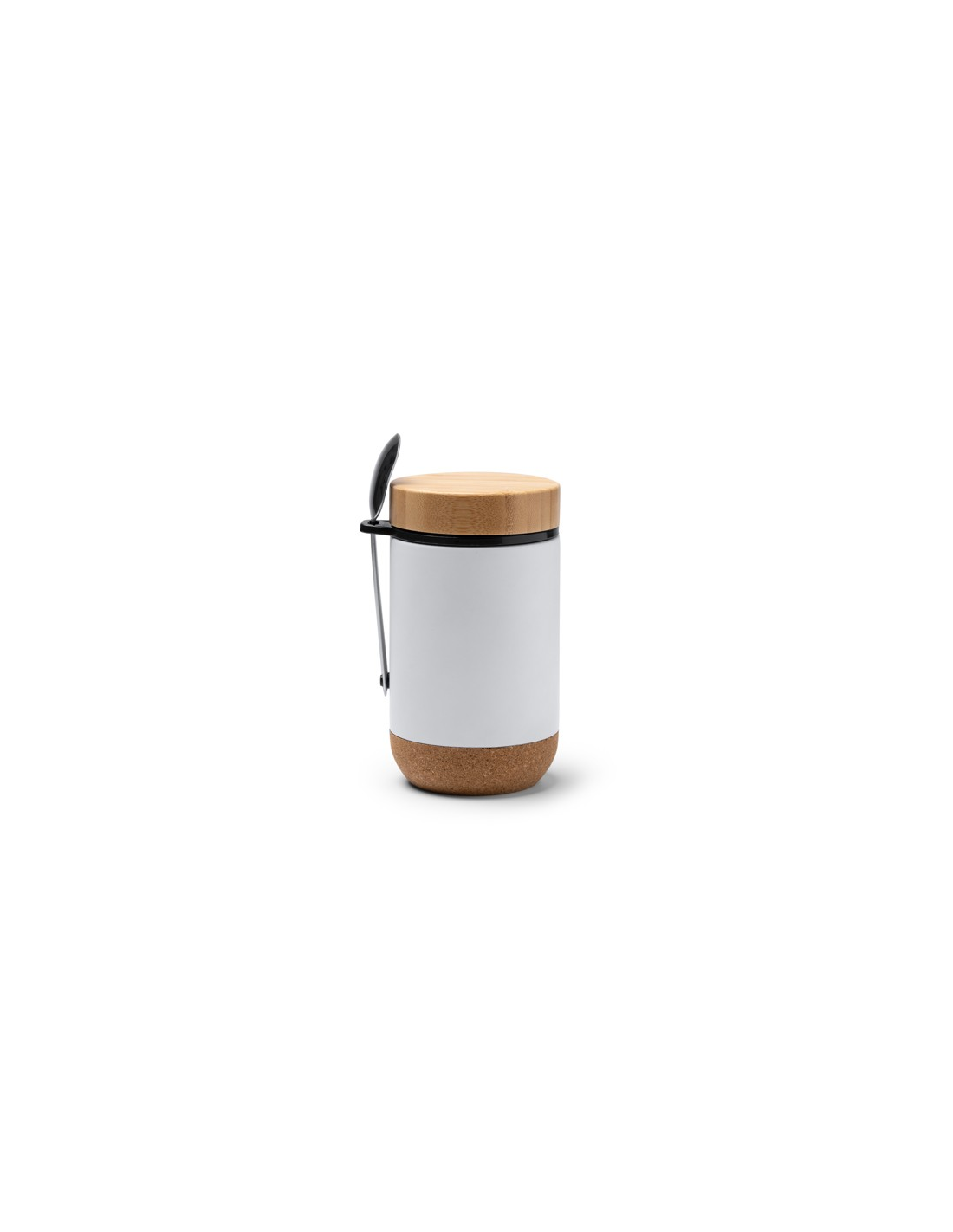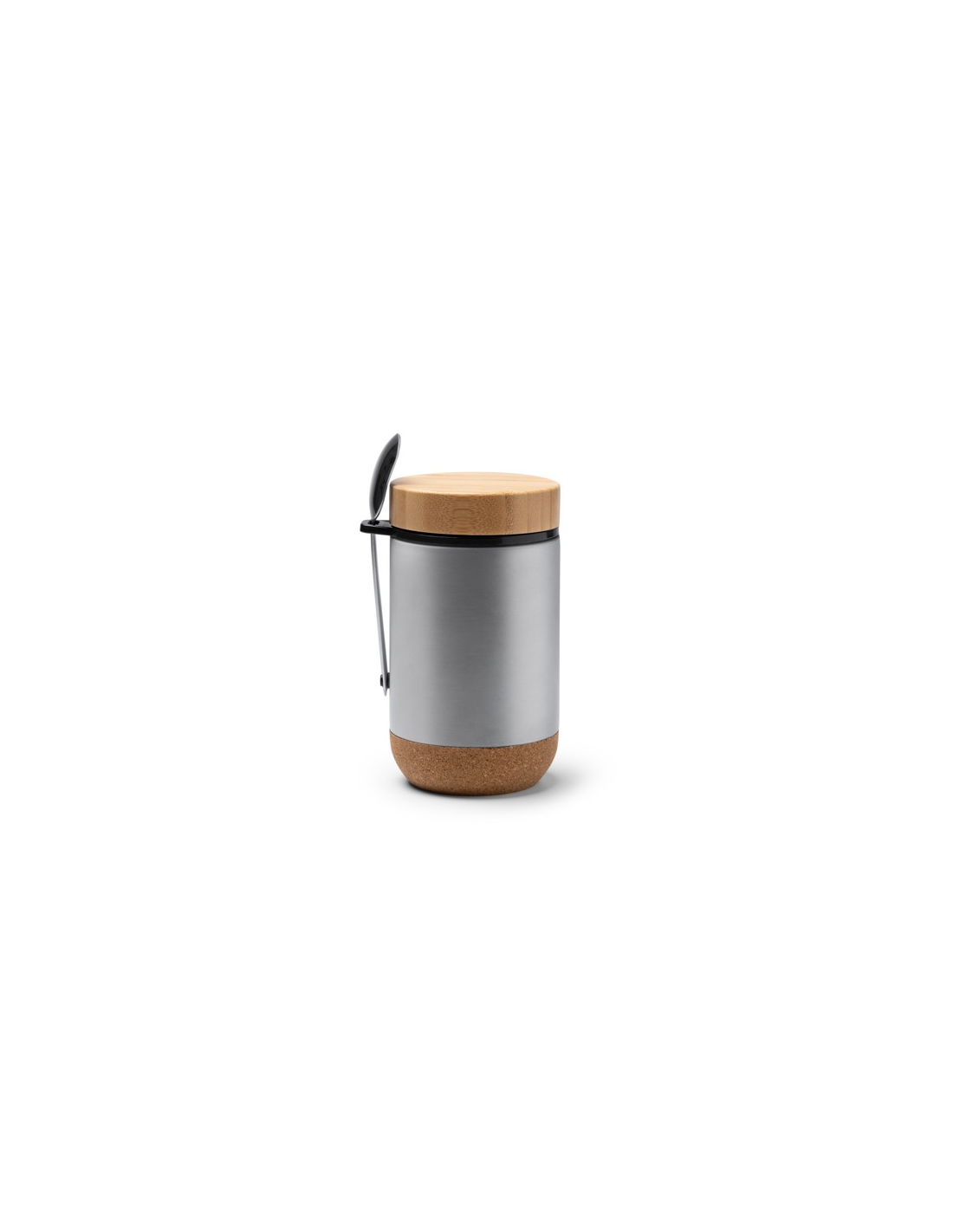 Wielofunkcyjny termos wykonany ze stali nierdzewnej 304, idealny do przechowywania żywności. Bambusowa pokrywka i korkowe dno. Łyżka w zestawie. Pojemność: 400 ml. Zapakowany w pudełku zaprojektowanym z myślą o środowisku.