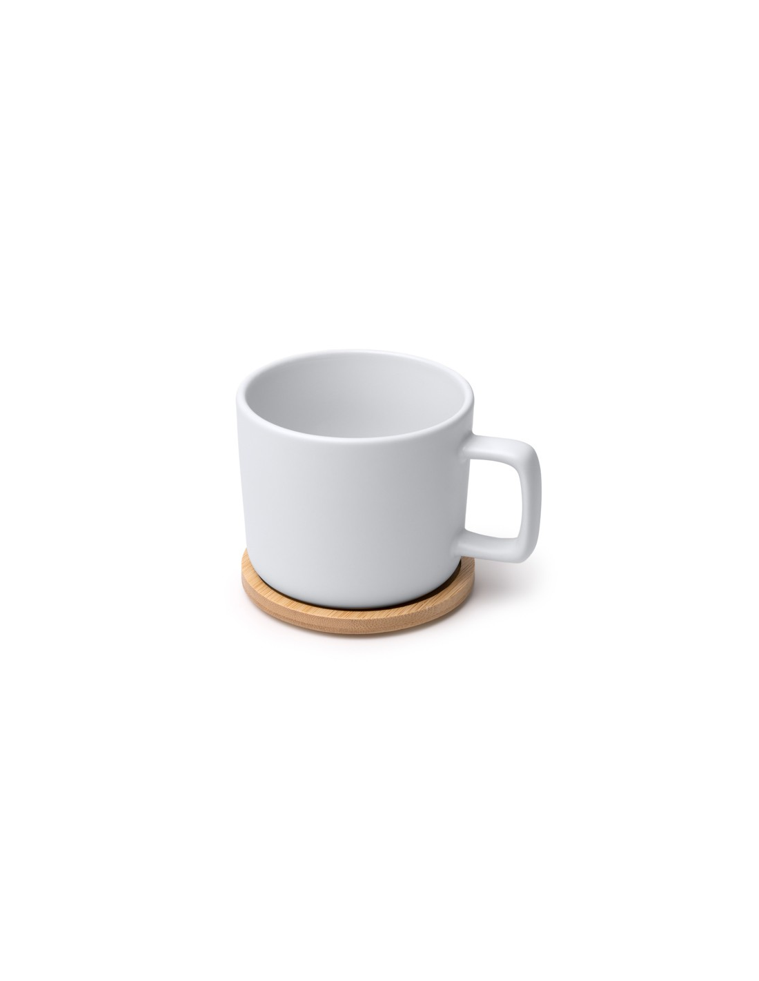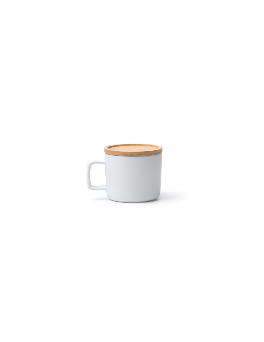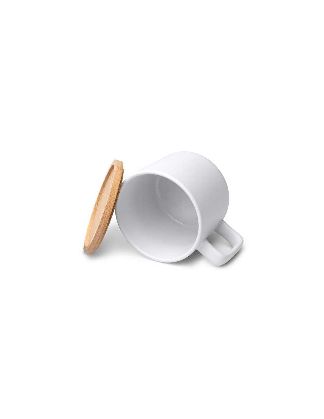 Kubek ceramiczny o matowym wykończeniu z kwadratowym uchwytem. Pojemność: 350 ml. Bambusowa pokrywka, która pełni również rolę podkładki. Jego wnętrze charakteryzuje się błyszczącym wykończeniem, które zwiększa wytrzymałość i trwałość. Konstrukcja przeznaczona specjalnie do sublimacji.