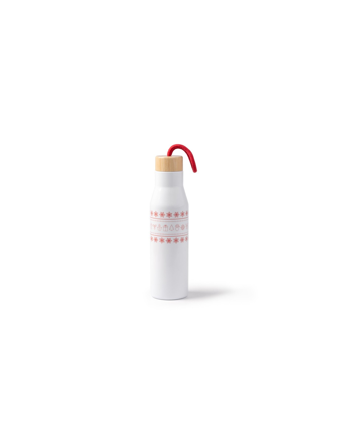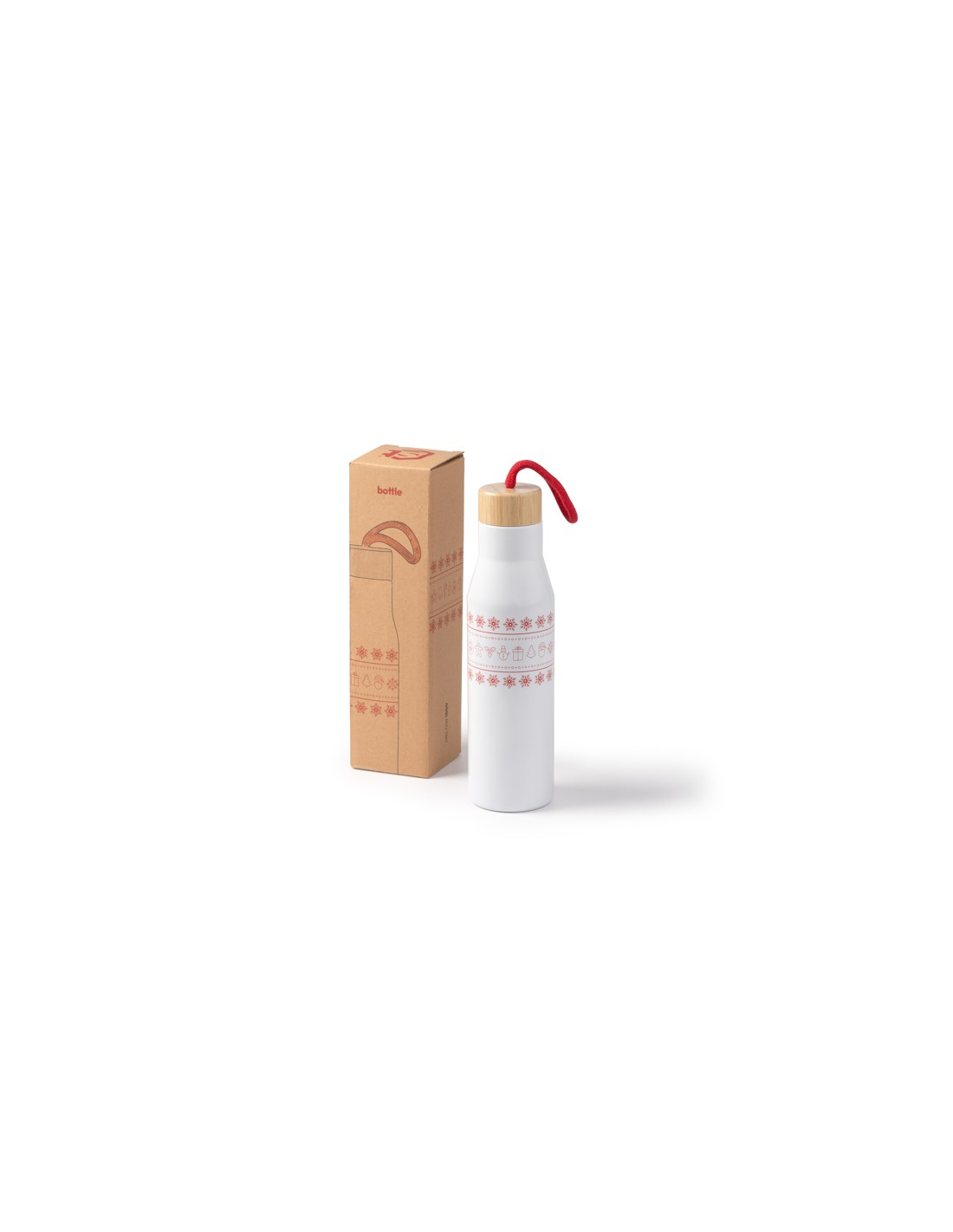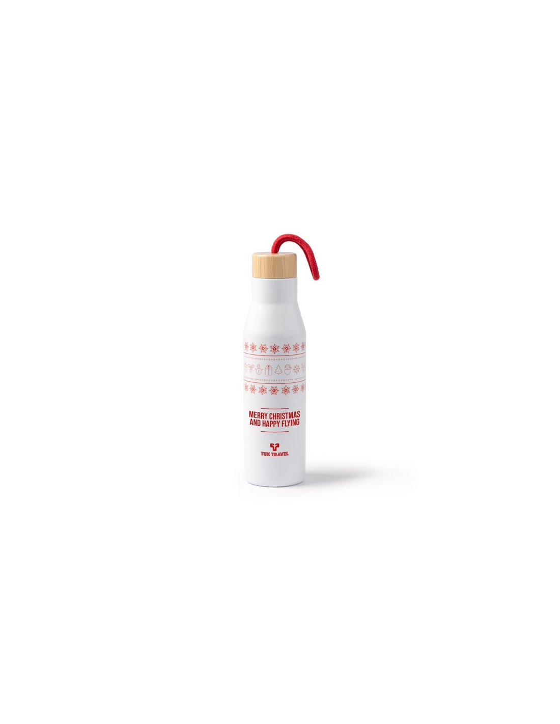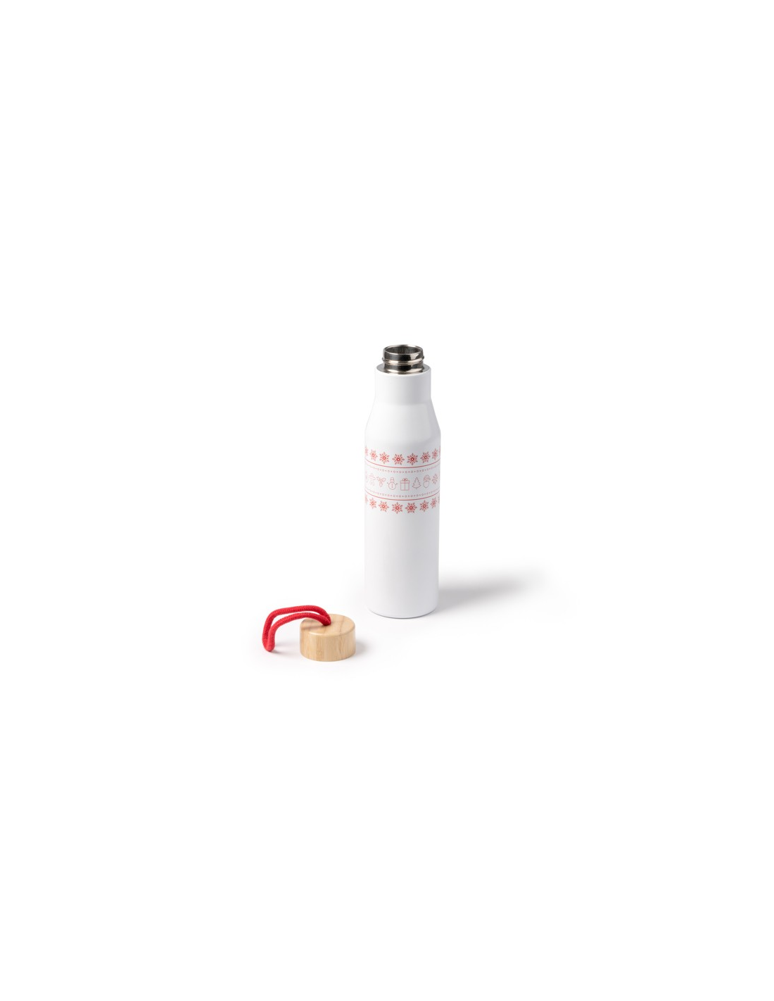Dwuścienna puszka ze stali nierdzewnej ma bambusową pokrywkę i świąteczny wzór wokół korpusu. Dzięki bawełnianemu uchwytowi do przenoszenia i pojemności 500 ml idealnie nadaje się do przechowywania gorących lub zimnych napojów.