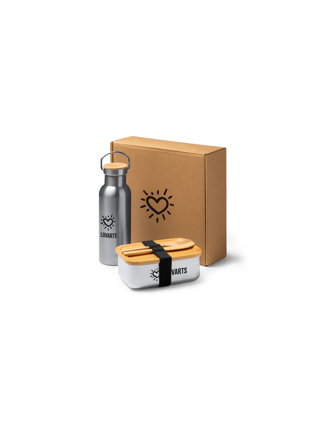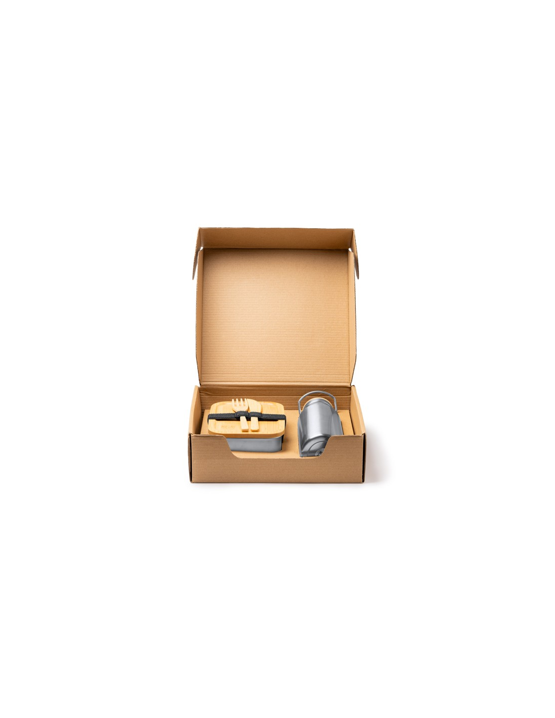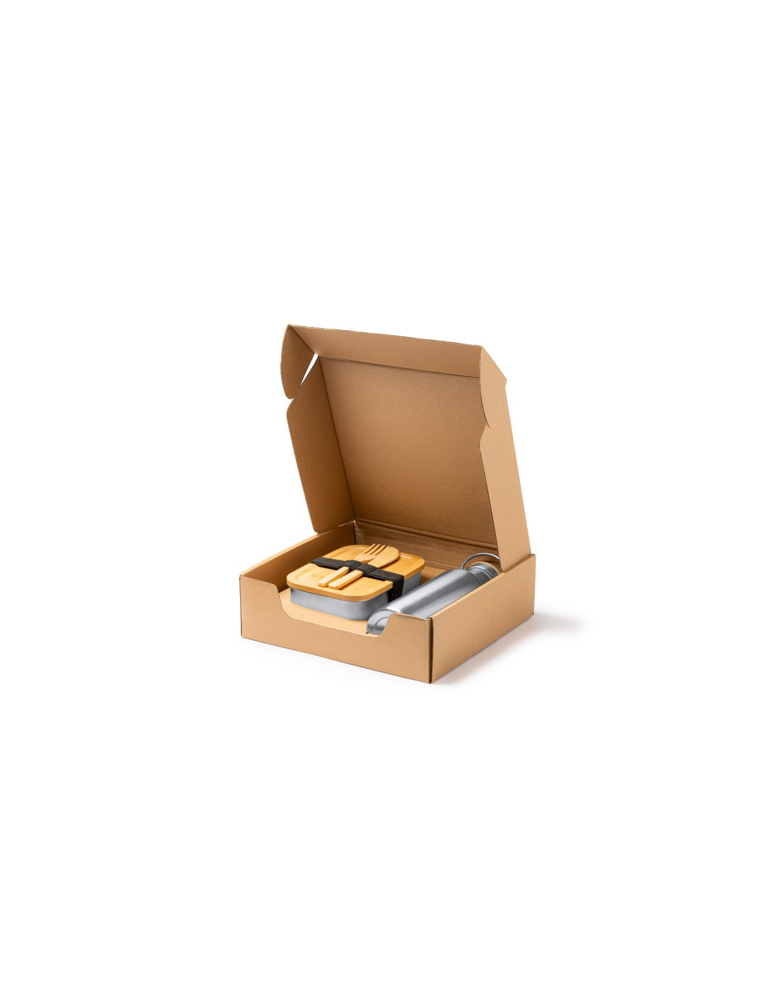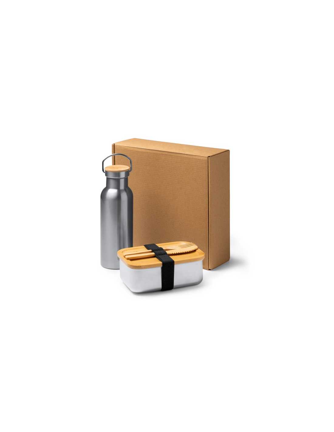 Pudełko na lunch ze sztućcami i butelką. Pudełko na lunch wykonane ze stali nierdzewnej 304 o pojemności 800 ml z bambusową pokrywką i elastyczną opaską zabezpieczającą. Sztućce wykonane z bambusa w zestawie. Butelka wykonana ze stali nierdzewnej 304 o pojemności 500 ml. Zapakowane w pudełku zaprojektowanym z myślą o środowisku.