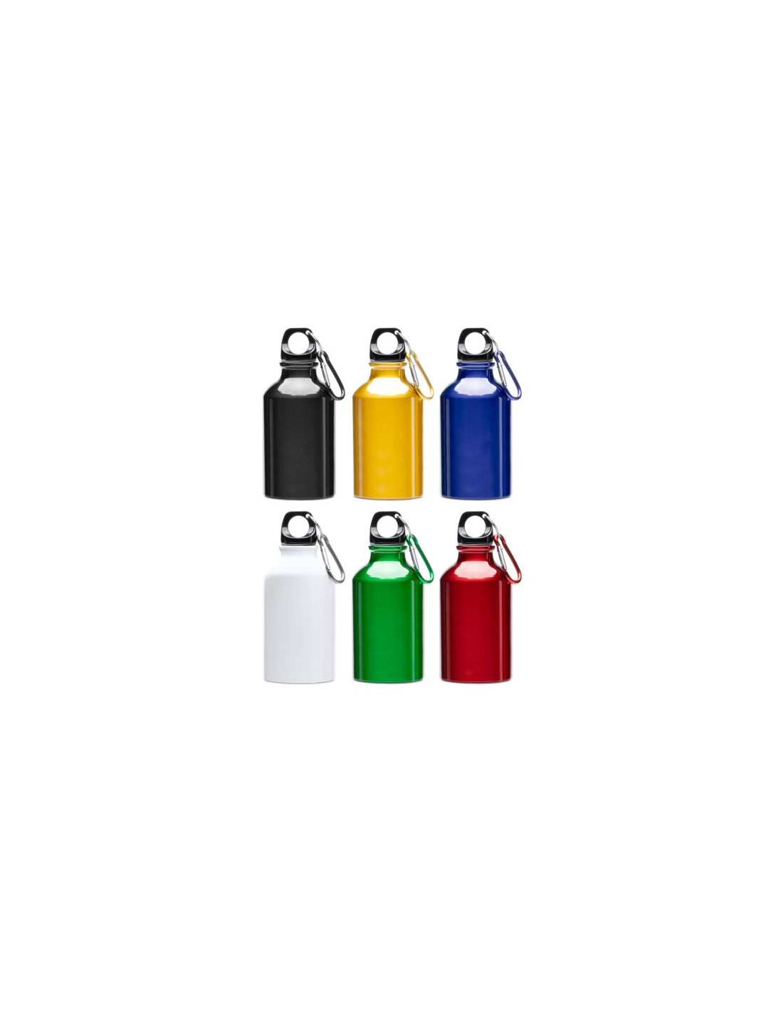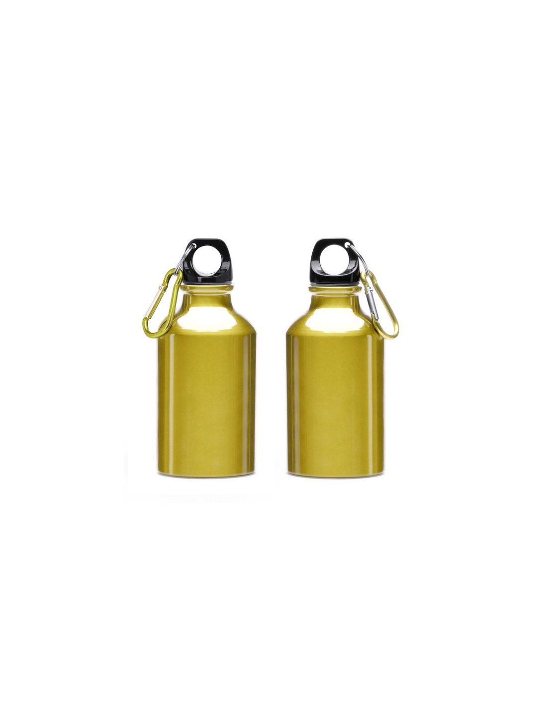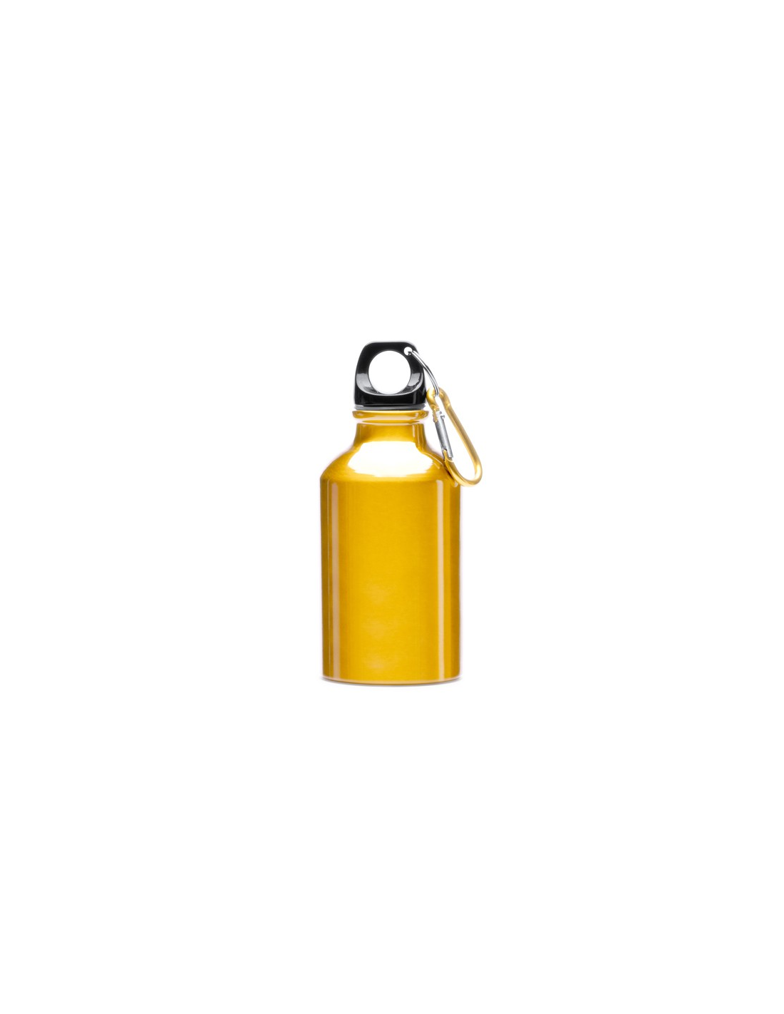 Aluminiowa butelka z karabińczykiem. Czarny korek i karabińczyk w tym samym metalicznym kolorze, jak butelka. Pojemność: 330 ml. Jej rozmiar ułatwia noszenie jej ze sobą przez cały czas.