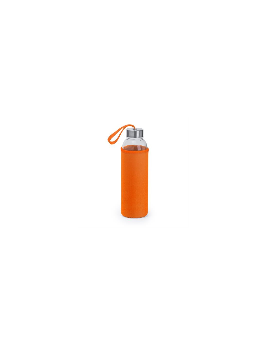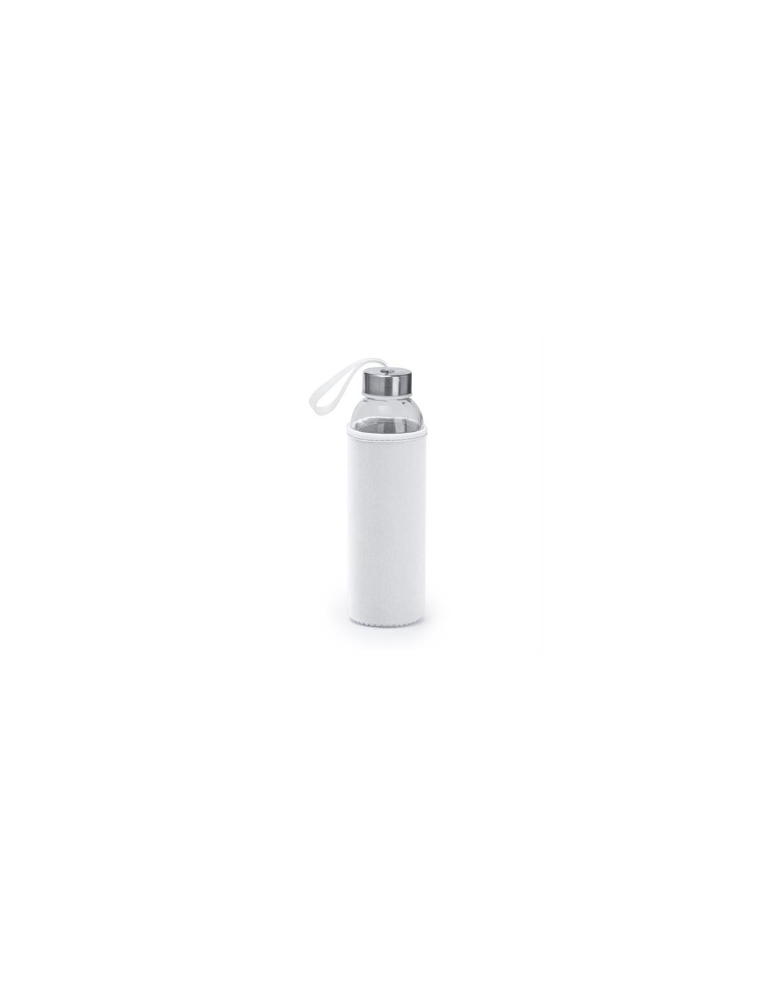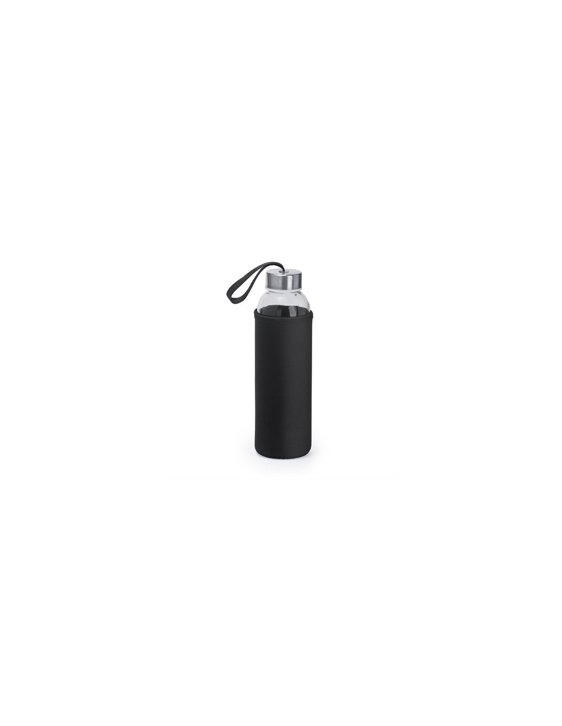 Szklana butelka o pojemności 500 ml. Etui wykonane z neoprenu, połączone z kolorowym paskiem do przenoszenia.