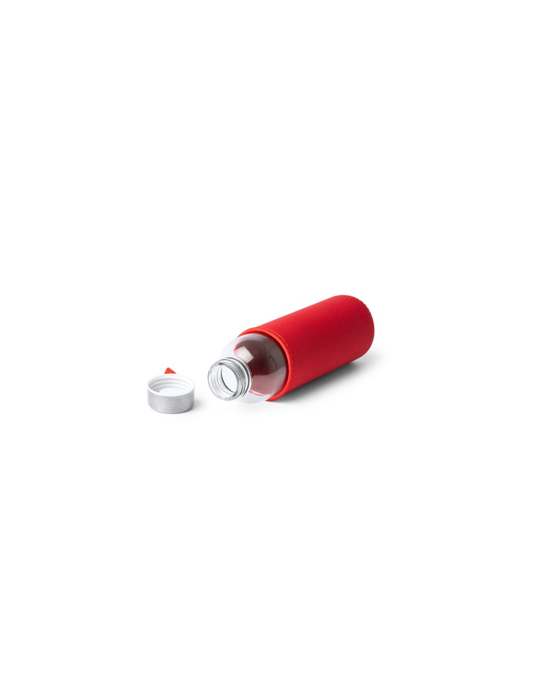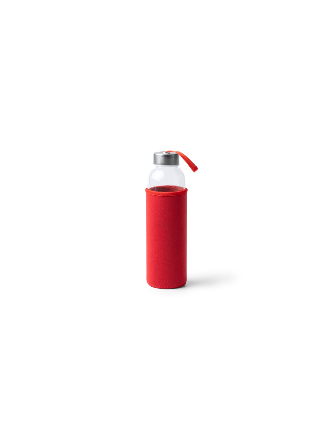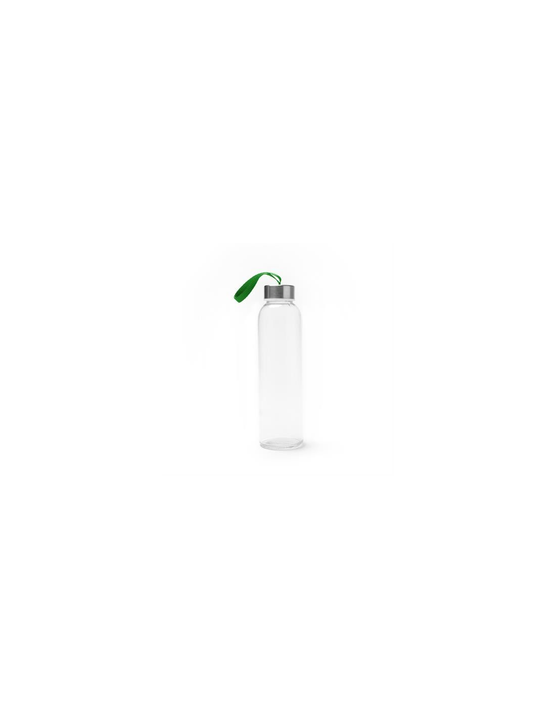 Szklana butelka o pojemności 500 ml. Etui wykonane z neoprenu, połączone z kolorowym paskiem do przenoszenia.