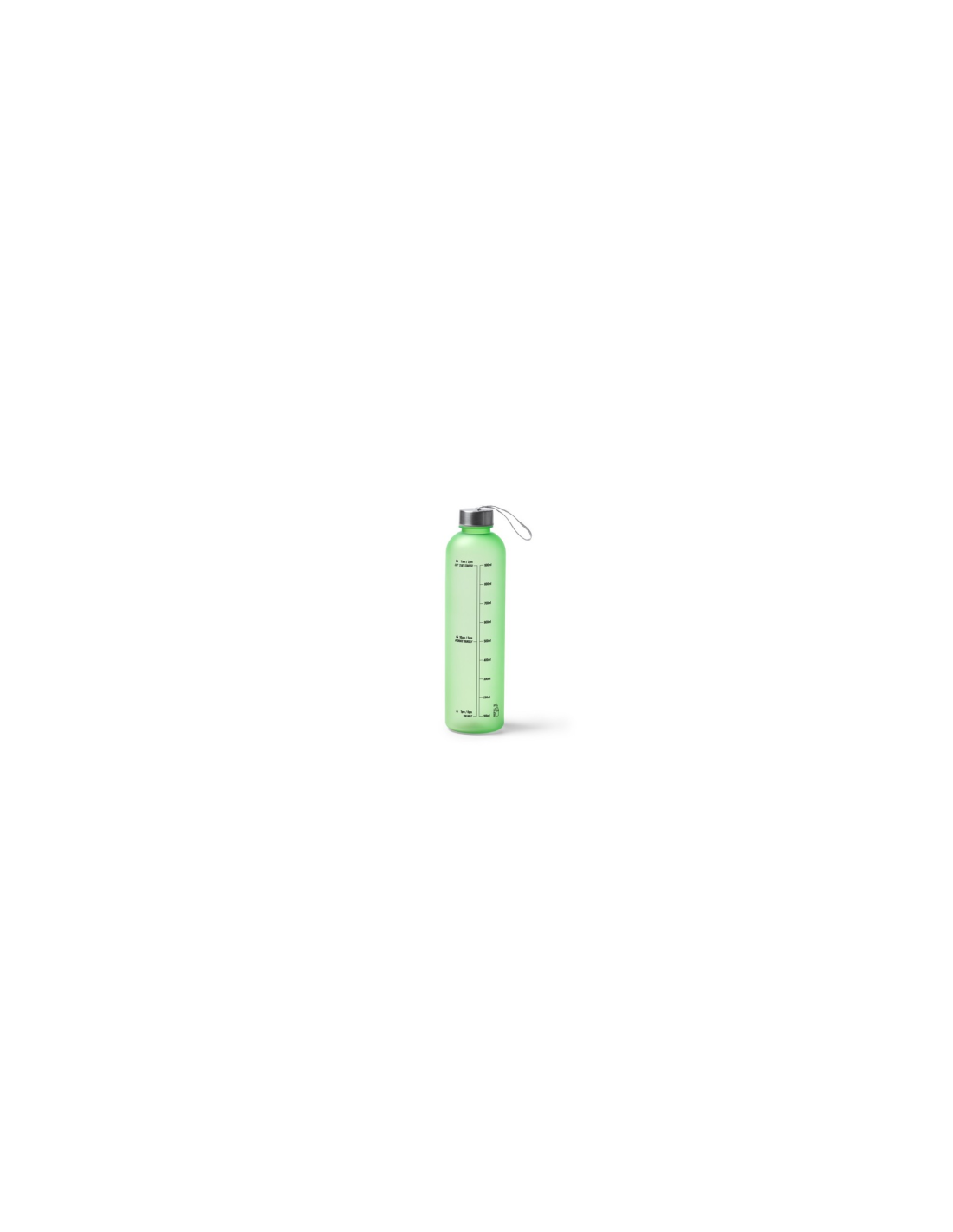Butelka wykonana z PCTG z półprzezroczystym korpusem, zakrętką i uchwytem do przenoszenia. Zawiera zalecenia dotyczące nawadniania i wskaźnik wydajności. Pojemność: 1 l. Zapakowana w eleganckim pudełku.