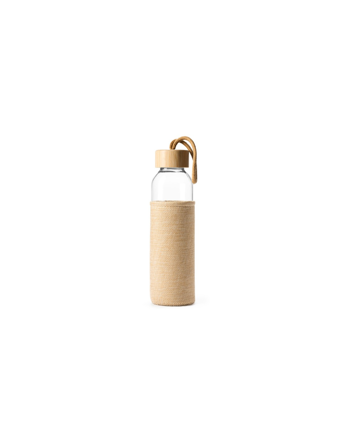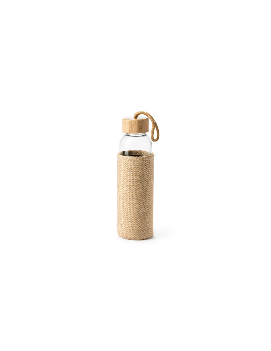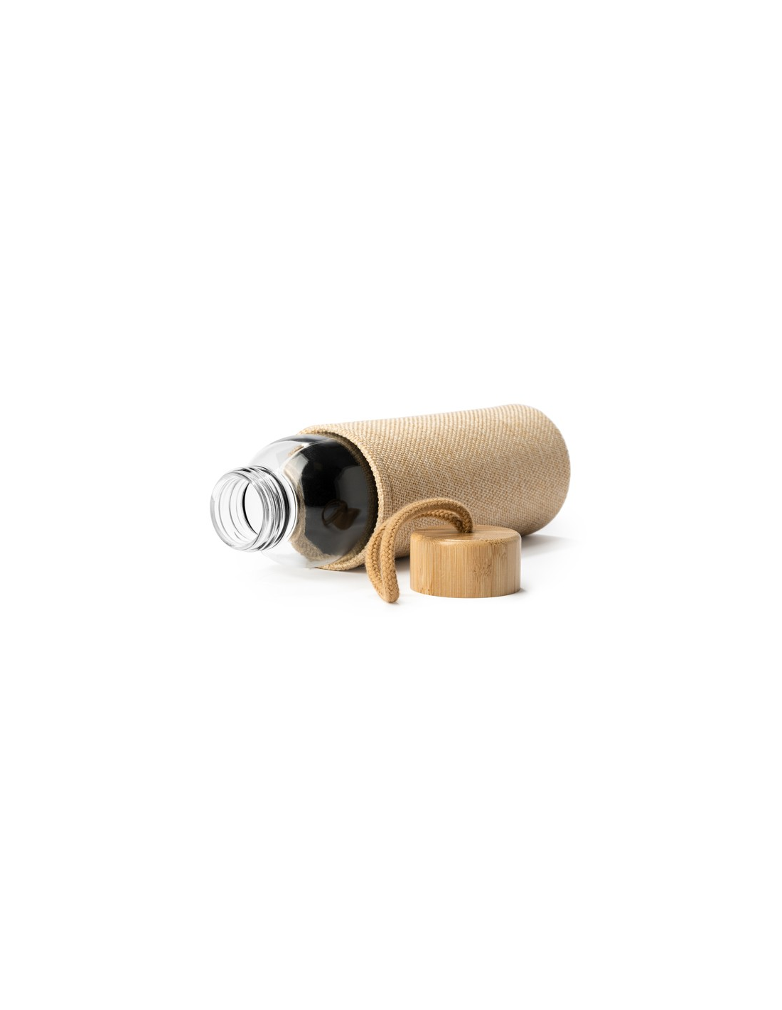 Szklana butelka z woreczkiem wykonanym ze sztucznej juty i bambusową nakrętką z praktycznym uchwytem do przenoszenia. Pojemność: 500 ml.