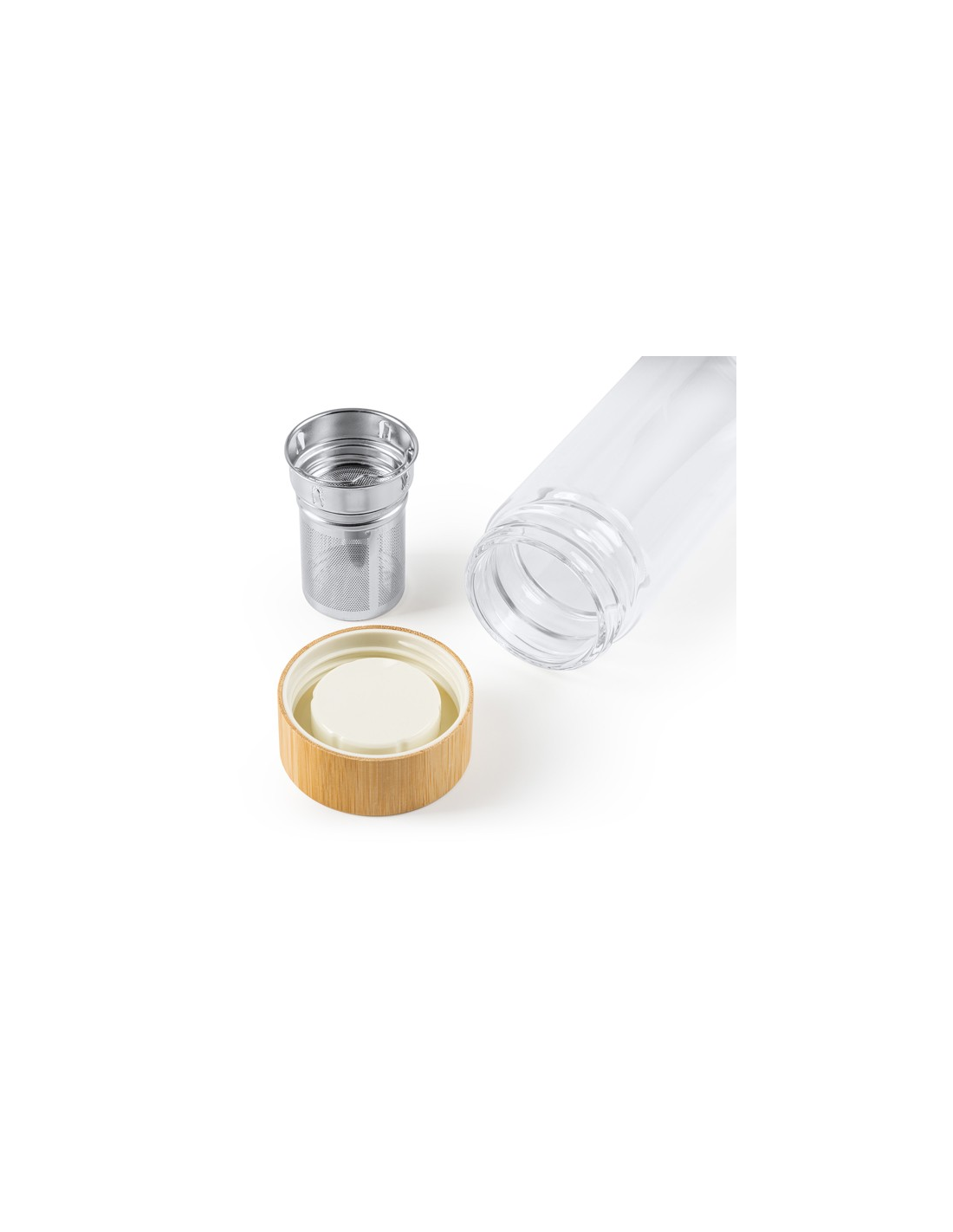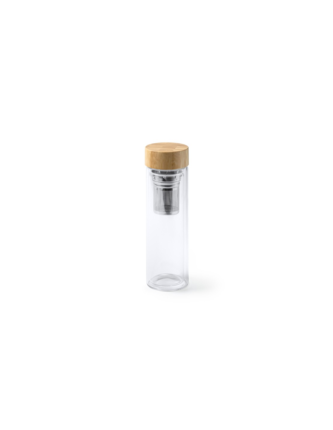 Butelka o podwójnych ściankach wykonana ze szkła borokrzemianowego z bambusową pokrywką. Zaparzacz do herbaty w zestawie, dzięki czemu można z niej pić w dowolnym miejscu. Pojemność: 420 ml.