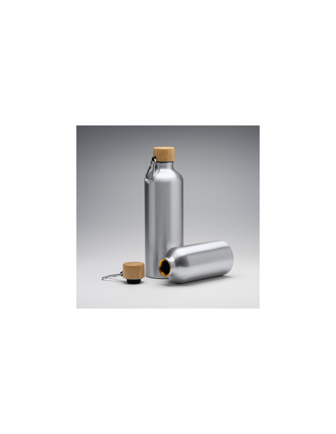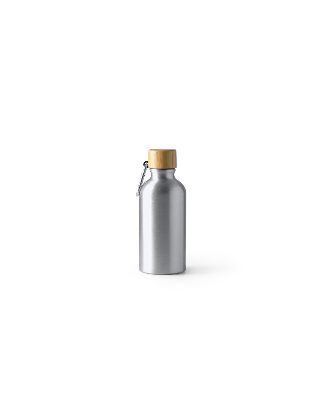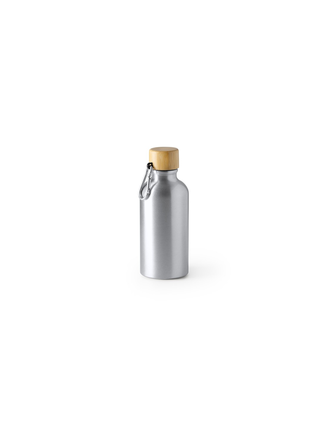 Aluminiowa butelka z karabińczykiem i bambusową pokrywką. Pojemność 400 ml.