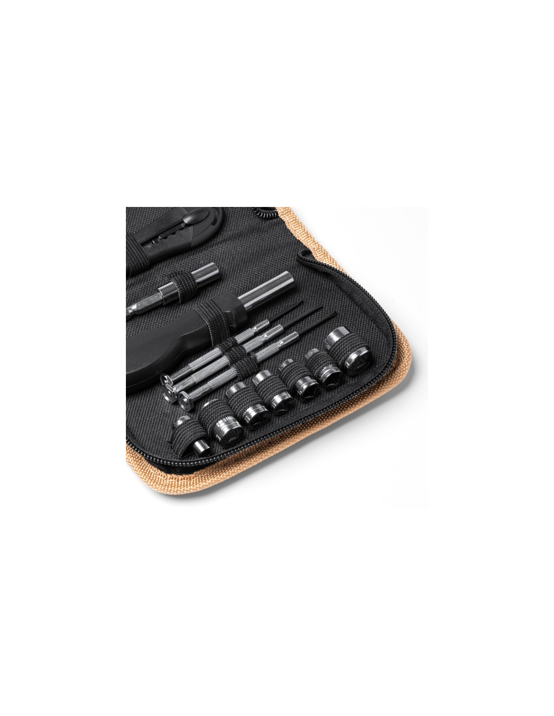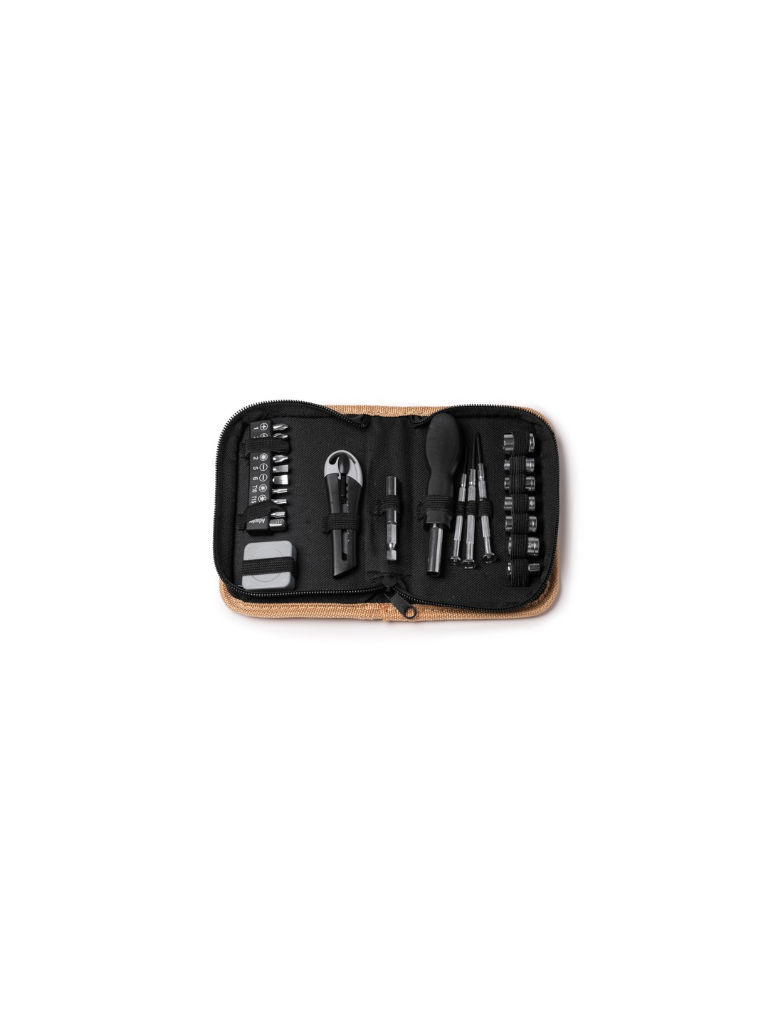 Zestaw narzędzi zawierający 25 elementów. Nóż, klucz sześciokątny, śrubokręt gwiazdkowy i płaski, narzędzie mocujące i miara o długości 100 cm. Zapakowany korkowe etui i pudełko zaprojektowane z myślą o środowisku.