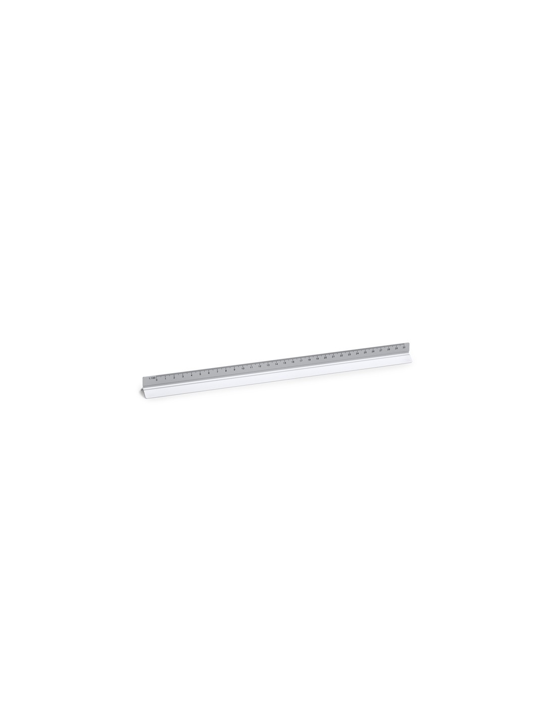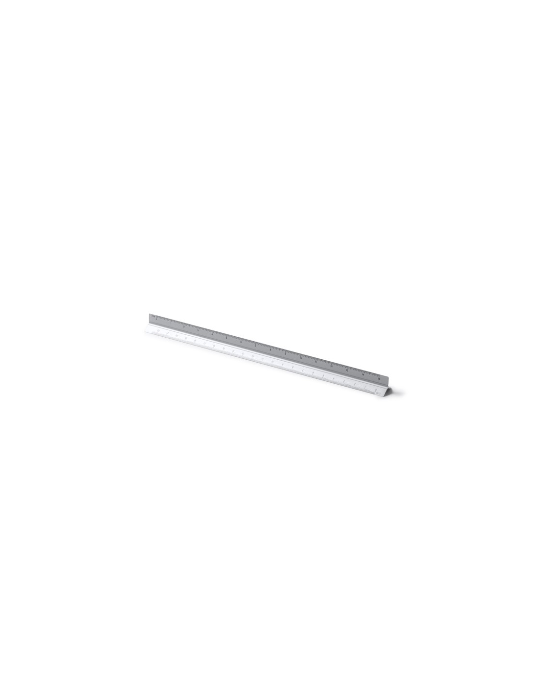Aluminiowa skala w kształcie trójkąta o długości 30 cm. Skale 1:20, 1:25, 1:50, 1:75 i 1:100. Płaska z jednej strony, przeznaczona specjalnie do znakowania. Zapakowana w eleganckim pudełku.