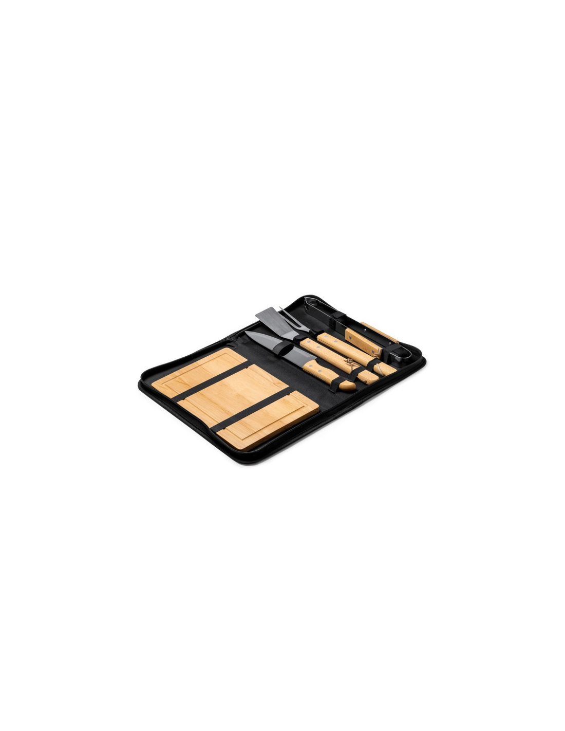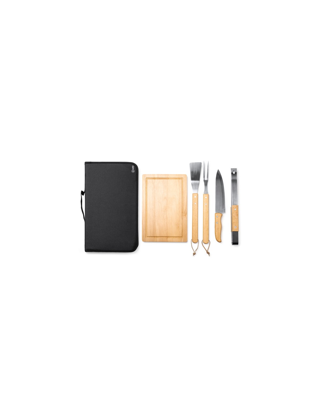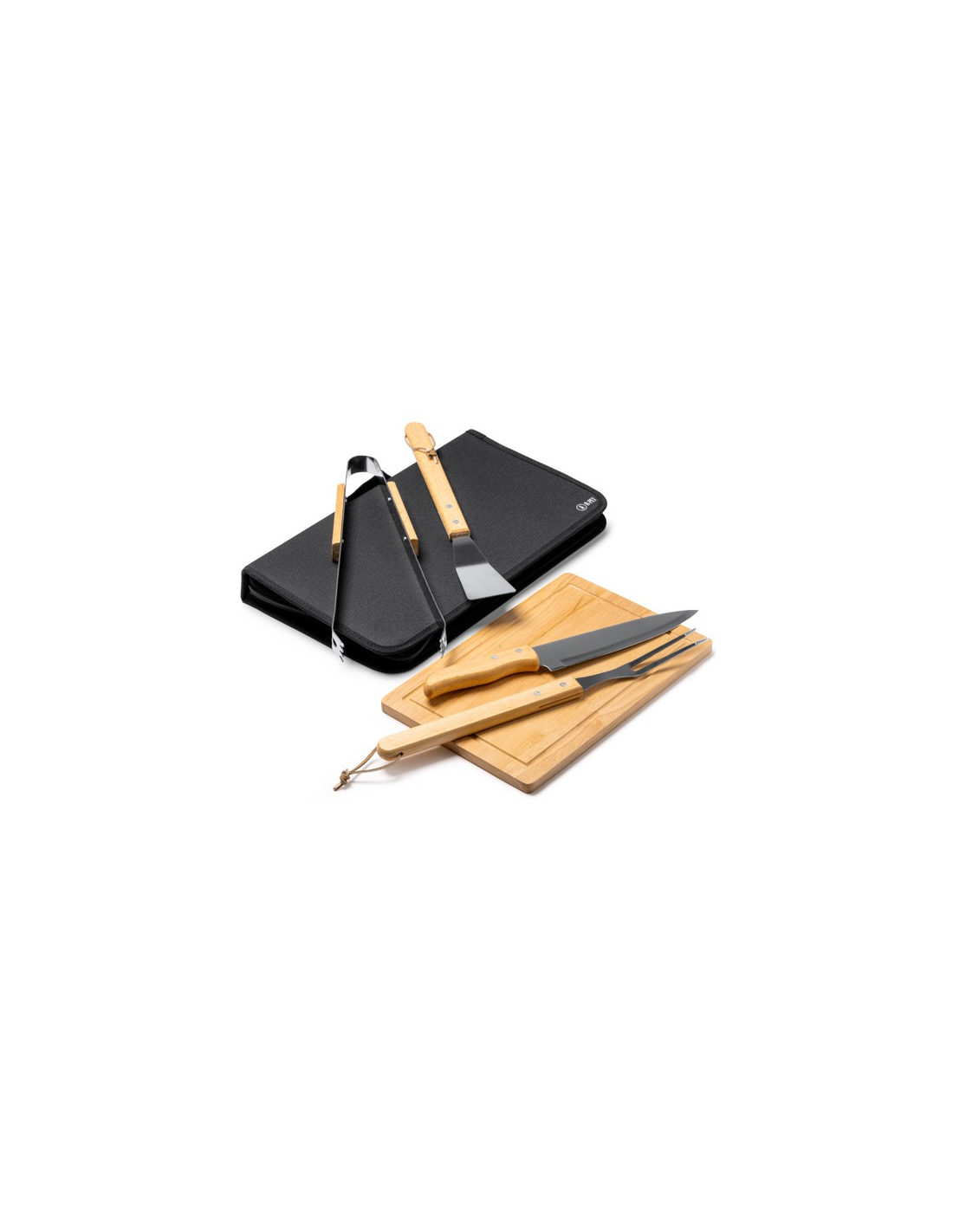 Zestaw do grillowania. 4 akcesoria ze stali nierdzewnej z drewnianą rączką w zestawie: nóż, nóż do krojenia mięsa, pęseta, łopatka i deska do krojenia wykonana z drewna. Zapakowany w etui wykonane z poliestru RPET pochodzącego z recyklingu.