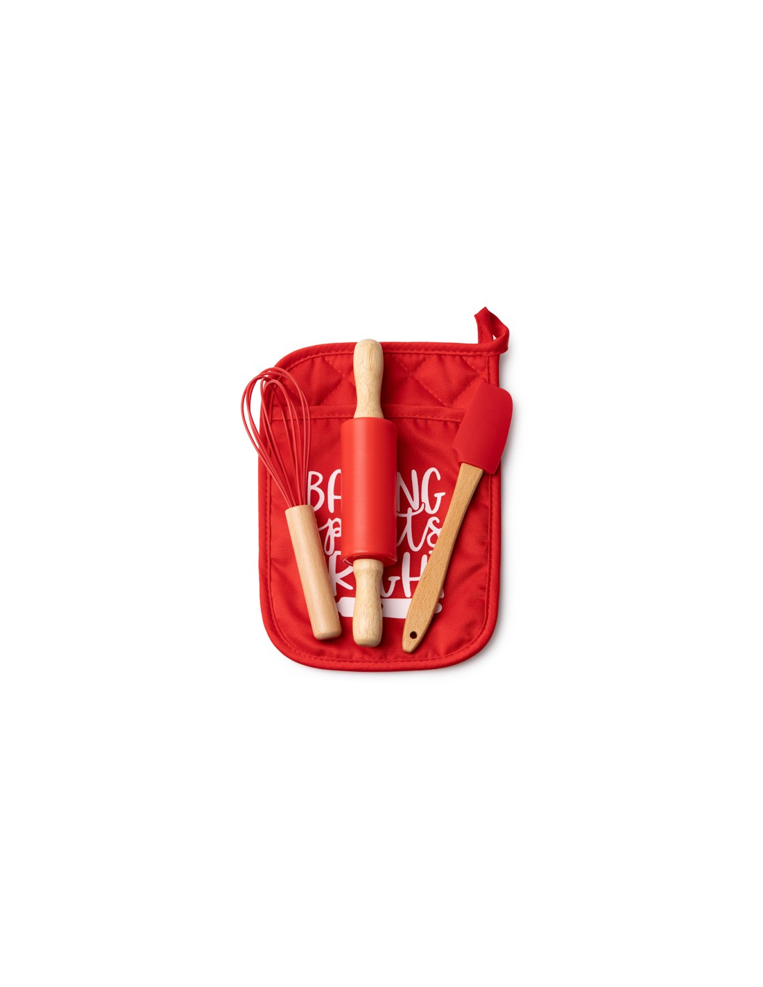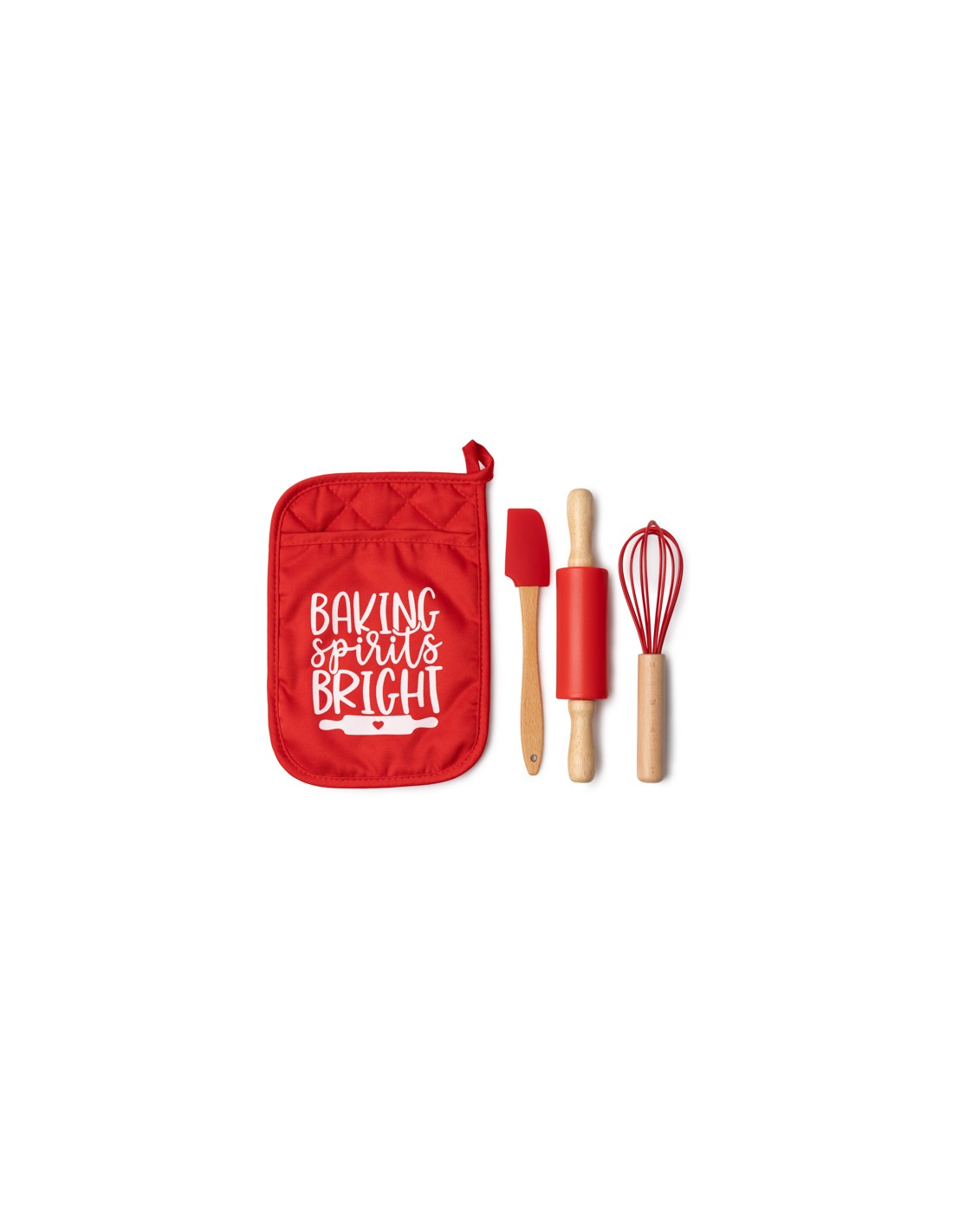 Zestaw kuchenny składający się z 3 elementów do pieczenia ciasteczek w domu. Wałek do ciasta, trzepaczka i łopatka w świątecznym stylu w zestawie. Zawiera uniwersalne etui do przechowywania elementów zestawu.