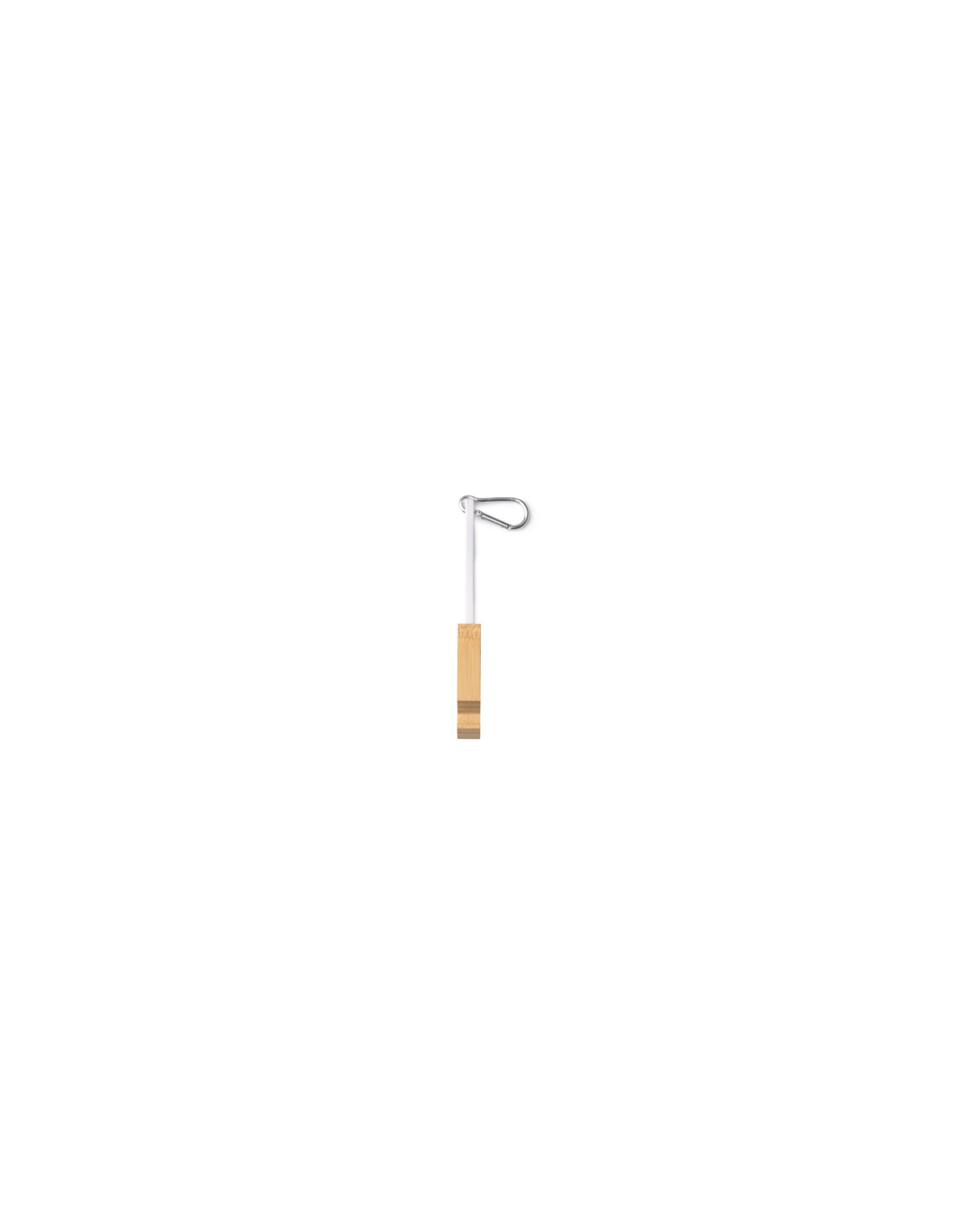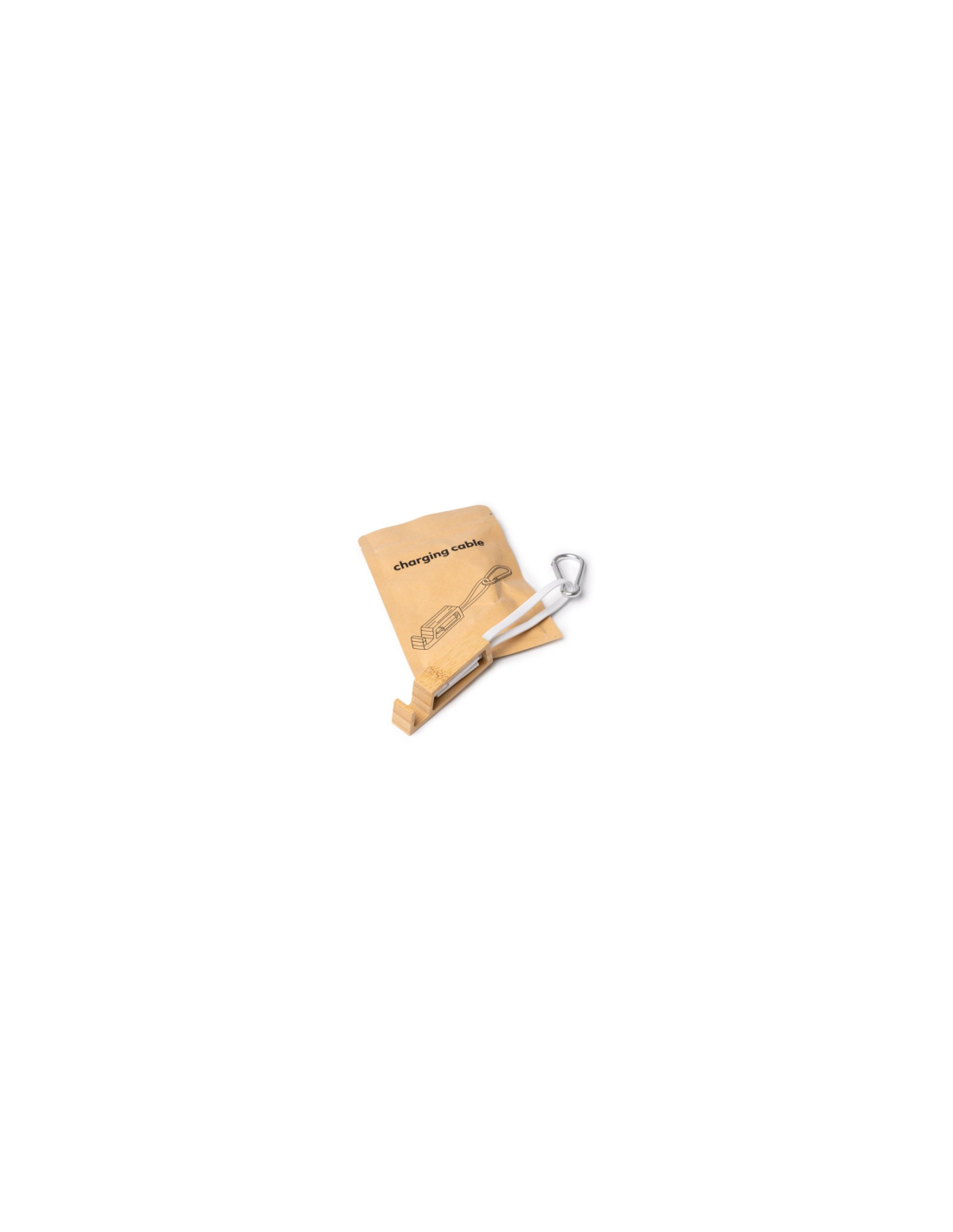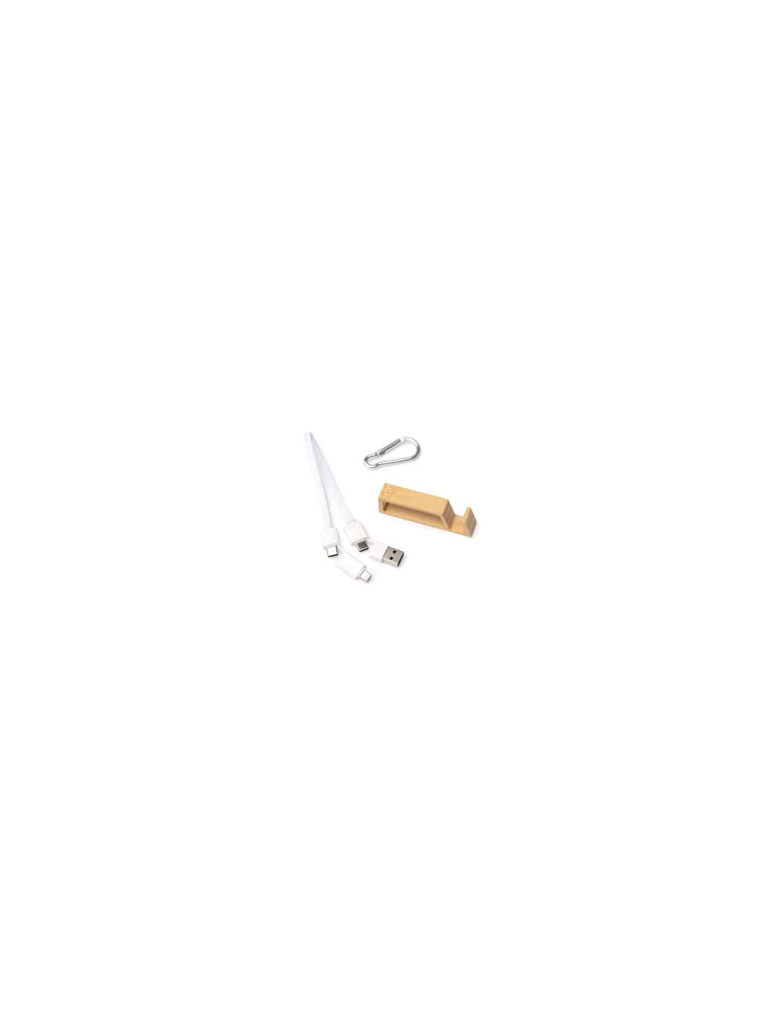 Kabel ładowarki 4 w 1 z adapterem USB typu C i Lightning, wejściem USB i USB typu C. Posiada akcesorium wykonane z bambusa z funkcją uchwytu na smartfon, które również przechowuje i chroni końcówki kabla. Karabińczyk do przenoszenia w zestawie.