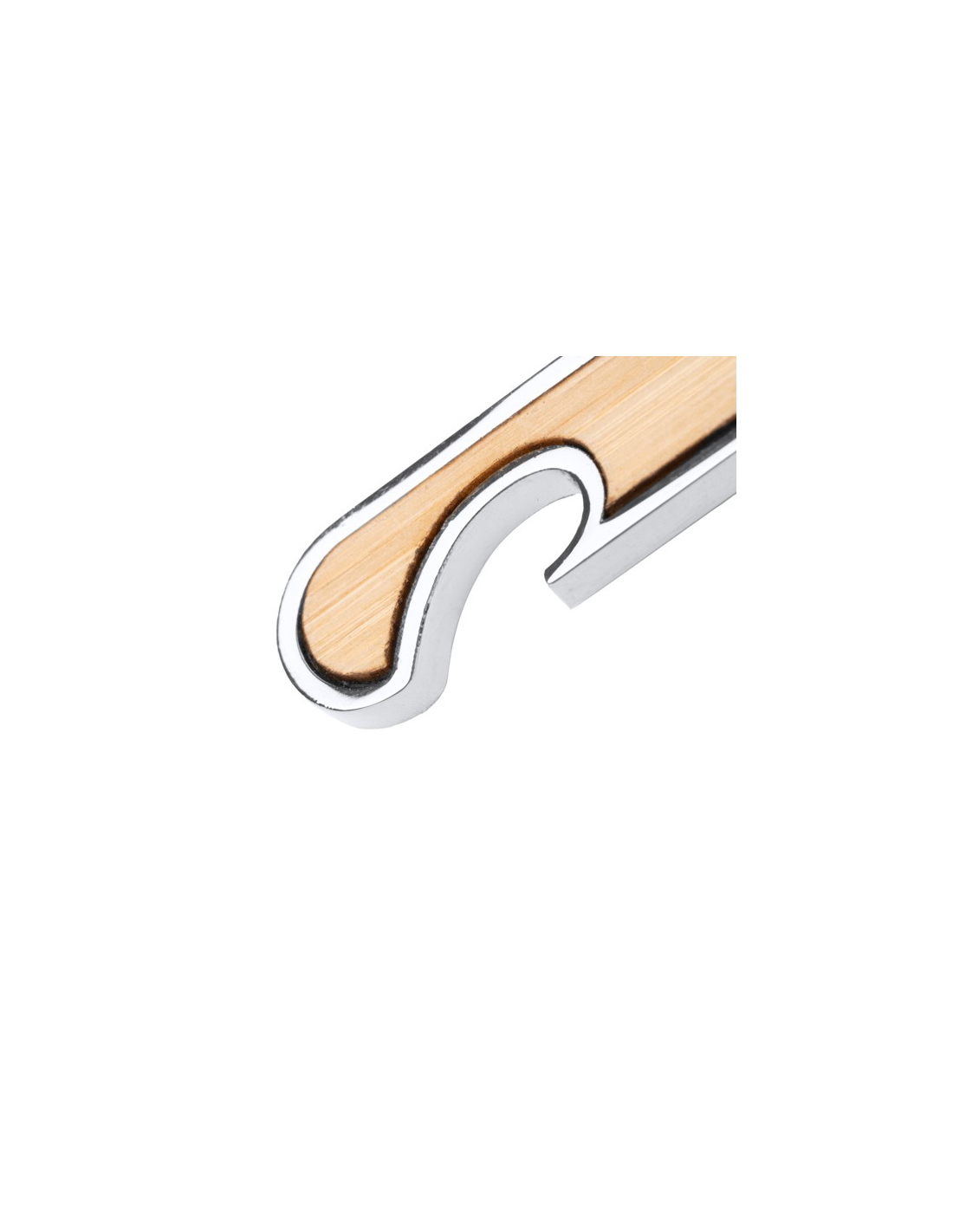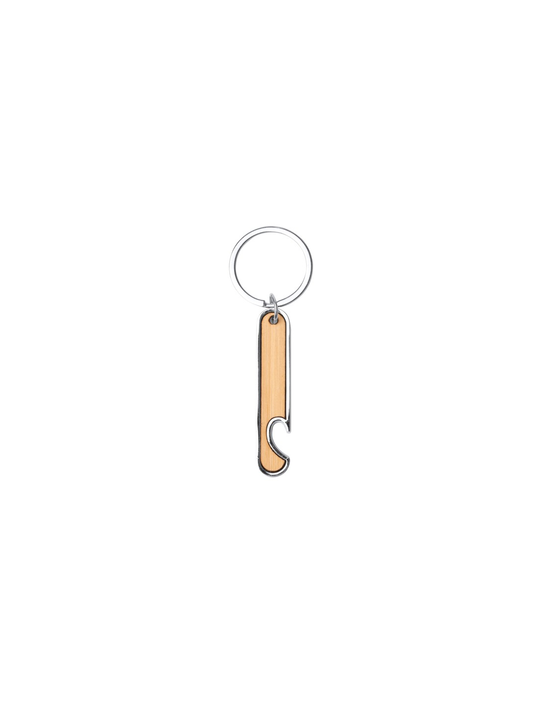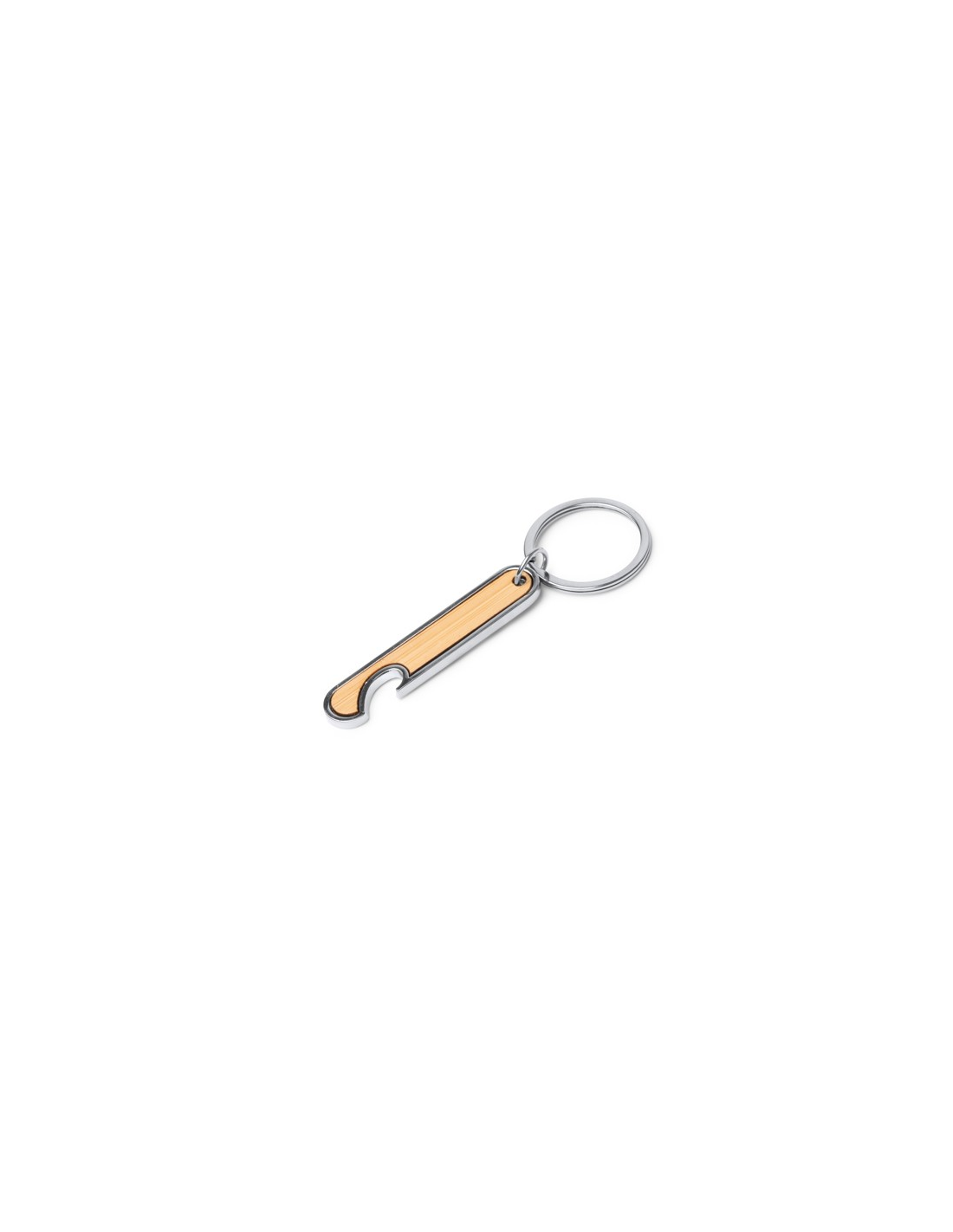 Brelok z otwieraczem do butelek wykonany ze stali z korpusem wykonanym z bambusa.