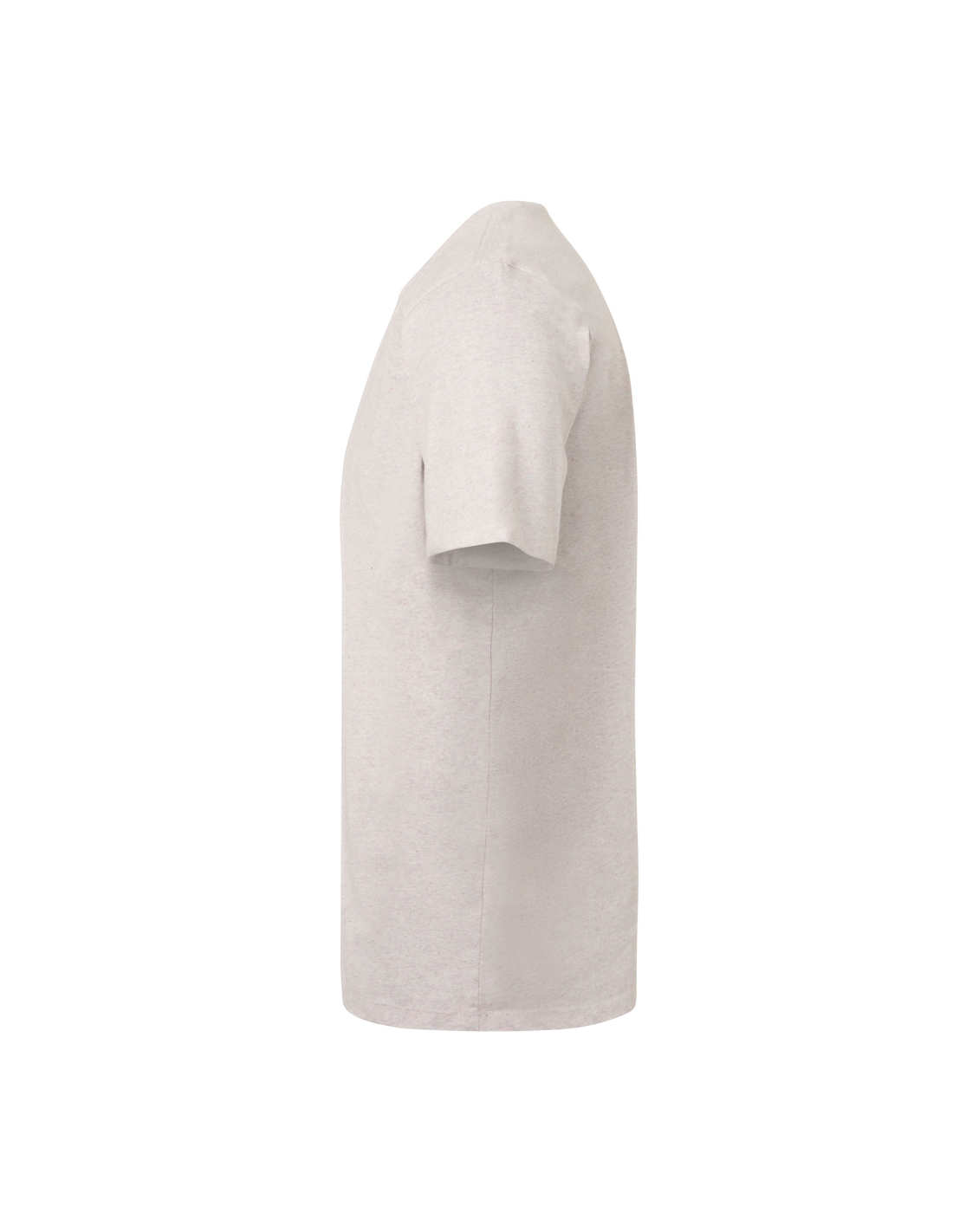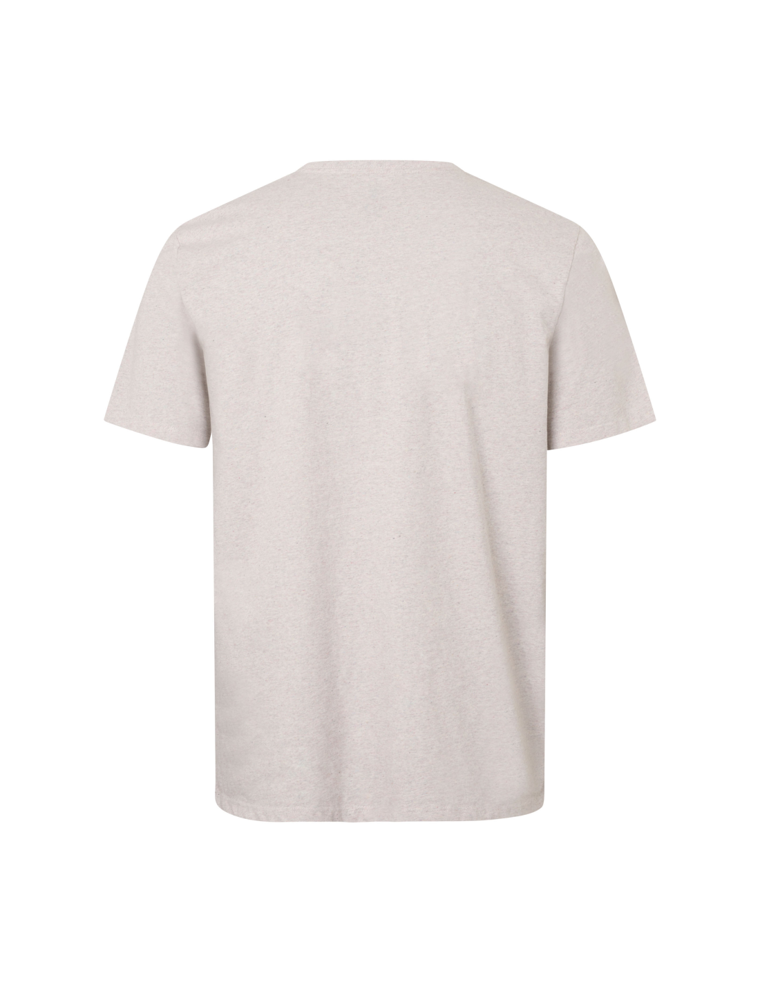 Zawsze modny T-shirt z przędzy zawierającej 20% włókna z recyklingu odpadów tekstylnych z duńskich gospodarstw domowych. Wielobarwne zużyte tekstylia składają się na stonowaną, melanżową barwę. T-shirt nie jest farbowany. Ma okrągły dekolt, czterowarstwowe ściągacze przy szyi oraz taśmowe wzmocnienia na szyi i ramionach.