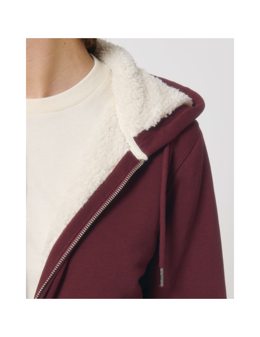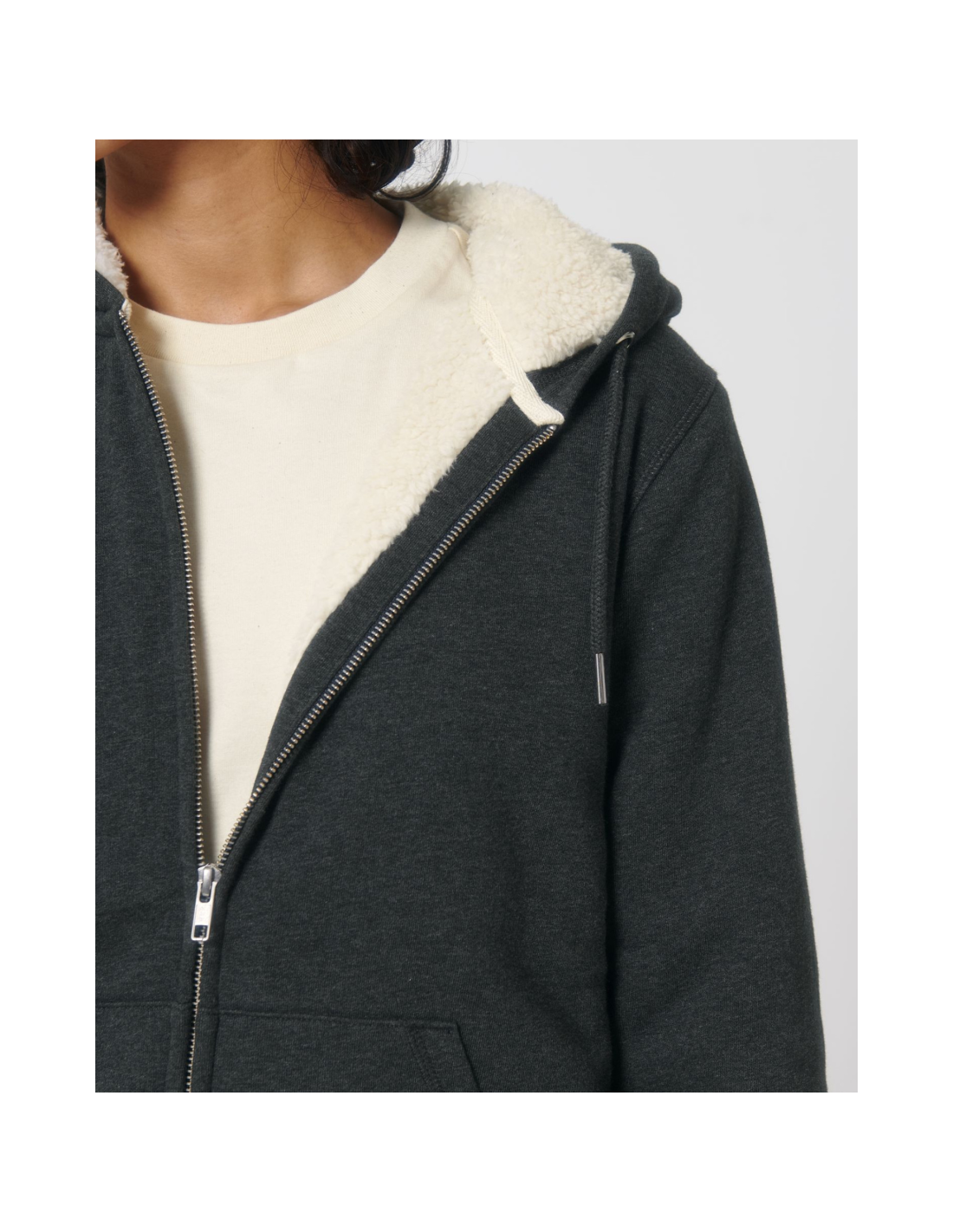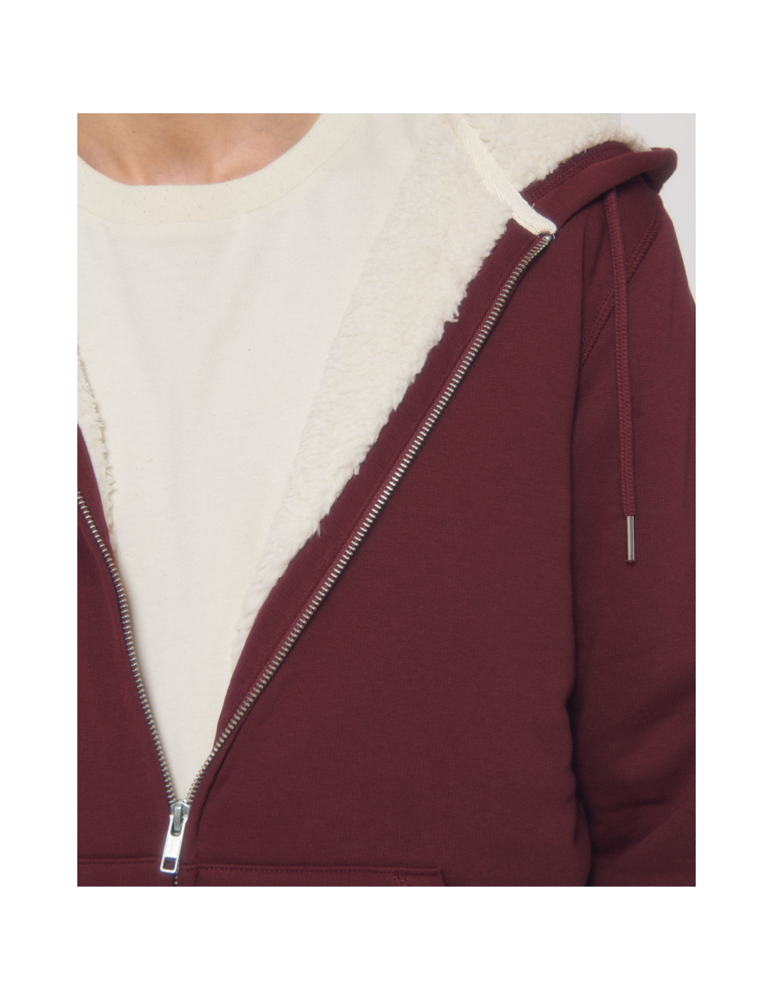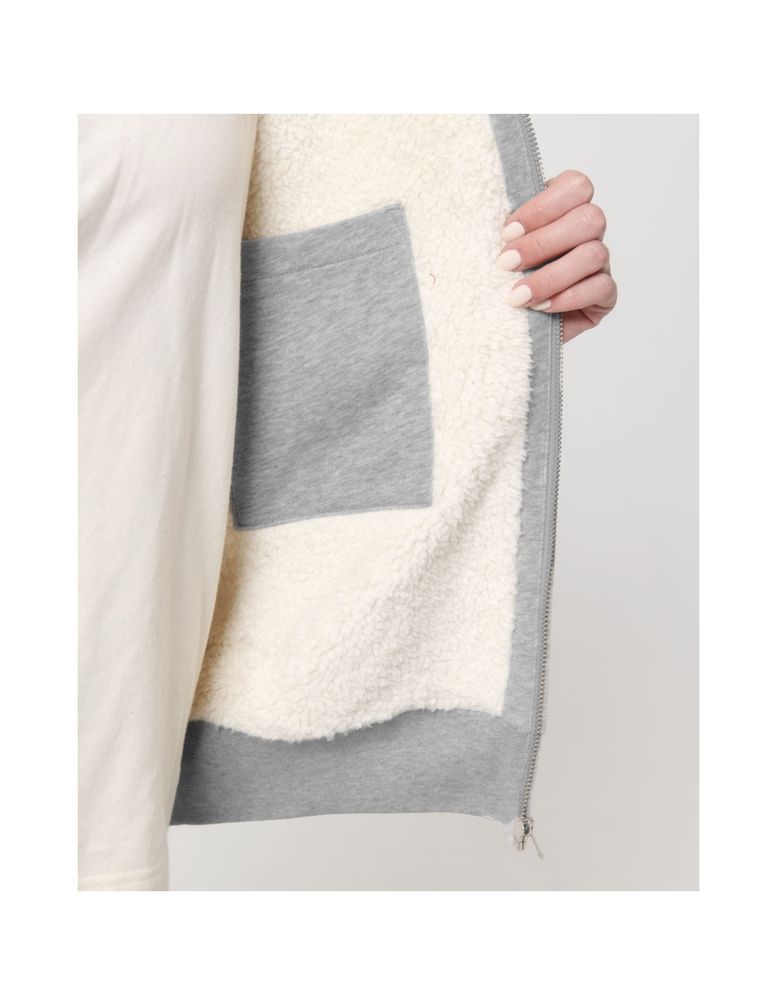 Kaptur z podszewką z szerpy z recyklingu Okrągły sznurek w kolorze materiału z metalowymi końcówkami Metalowe oczka Taśma wzmacniająca na karku w jodełkę Półksiężyc z tego samego materiału na karku Kryty metalowy zamek na środku przodu Wszywane rękawy Wewnętrzna kieszeń na piersi Kieszeń typu kangurka Ściągacz 1x1 na mankietach i u dołu Podwójne stebnowanie przy wykroju pach, na mankietach i u dołu Wewnętrzny ukryty zamek u dołu ułatwiający zdobienie Całość na podszewce z szerpy z recyklingu