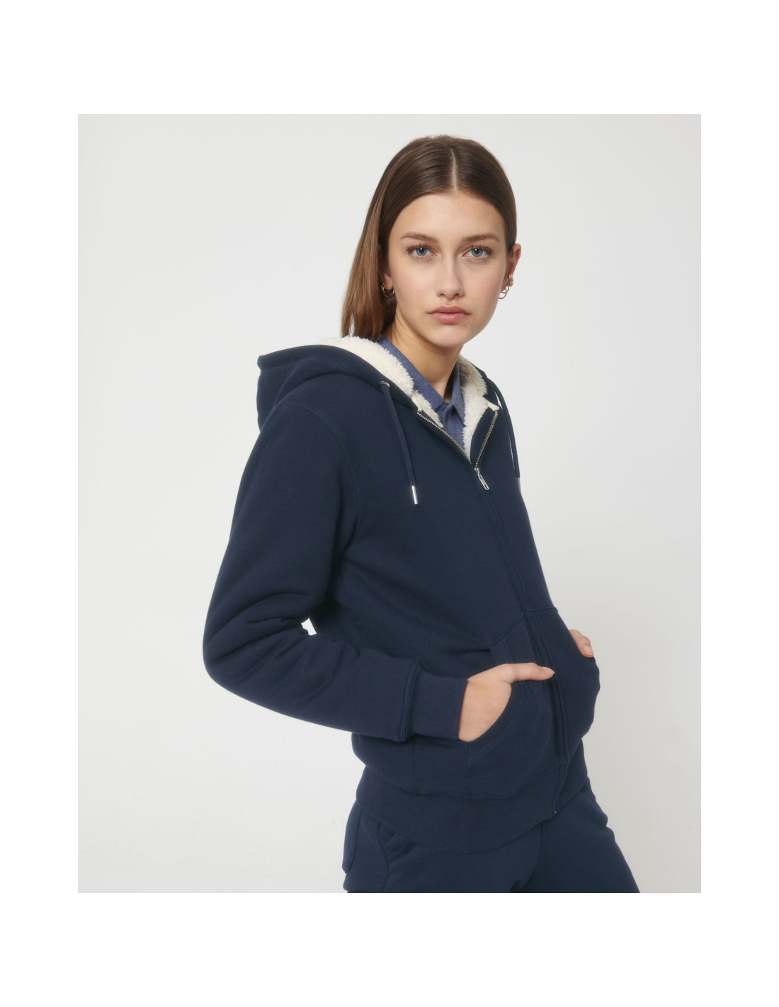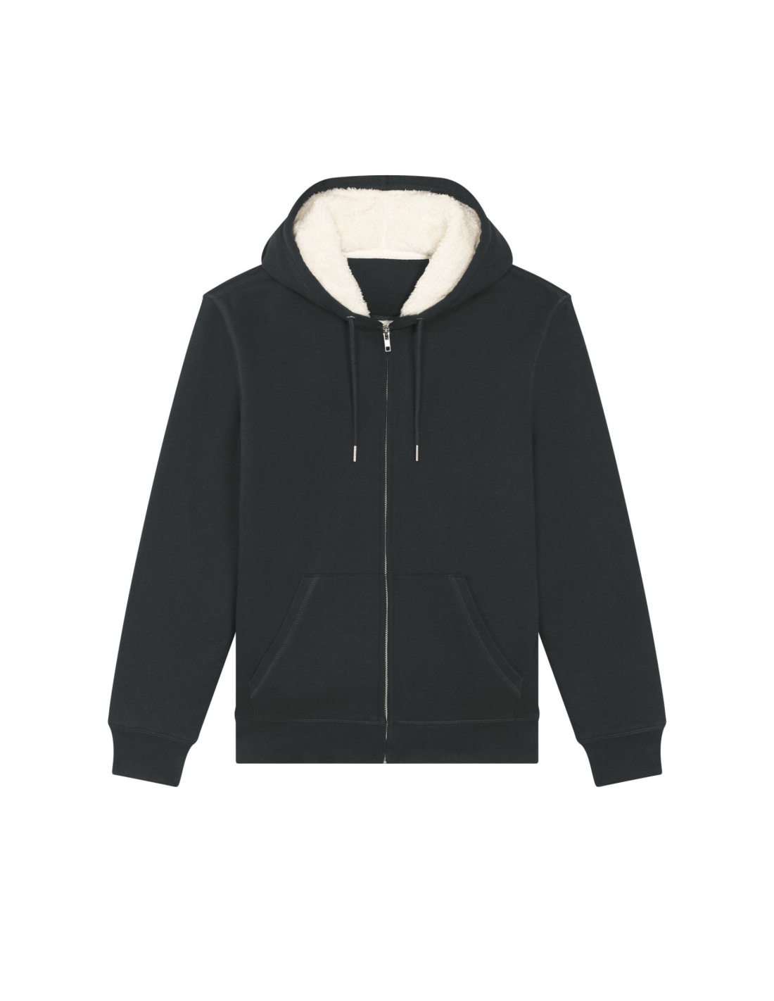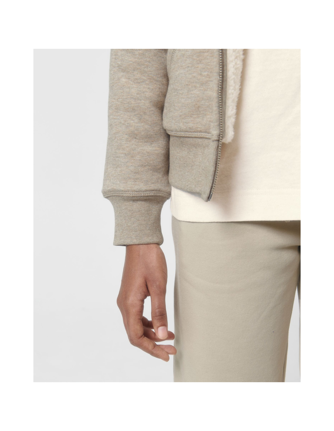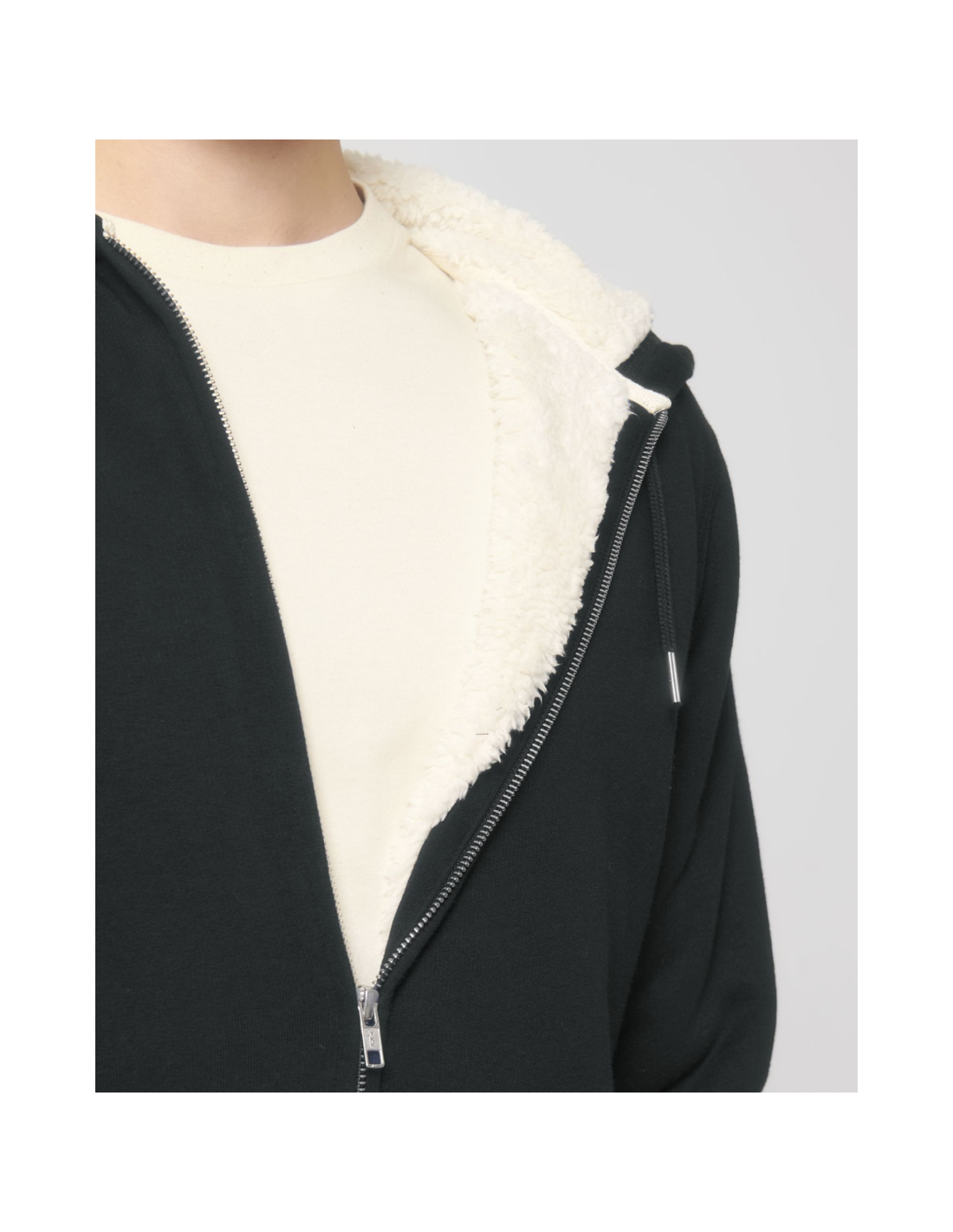 Kaptur z podszewką z szerpy z recyklingu Okrągły sznurek w kolorze materiału z metalowymi końcówkami Metalowe oczka Taśma wzmacniająca na karku w jodełkę Półksiężyc z tego samego materiału na karku Kryty metalowy zamek na środku przodu Wszywane rękawy Wewnętrzna kieszeń na piersi Kieszeń typu kangurka Ściągacz 1x1 na mankietach i u dołu Podwójne stebnowanie przy wykroju pach, na mankietach i u dołu Wewnętrzny ukryty zamek u dołu ułatwiający zdobienie Całość na podszewce z szerpy z recyklingu