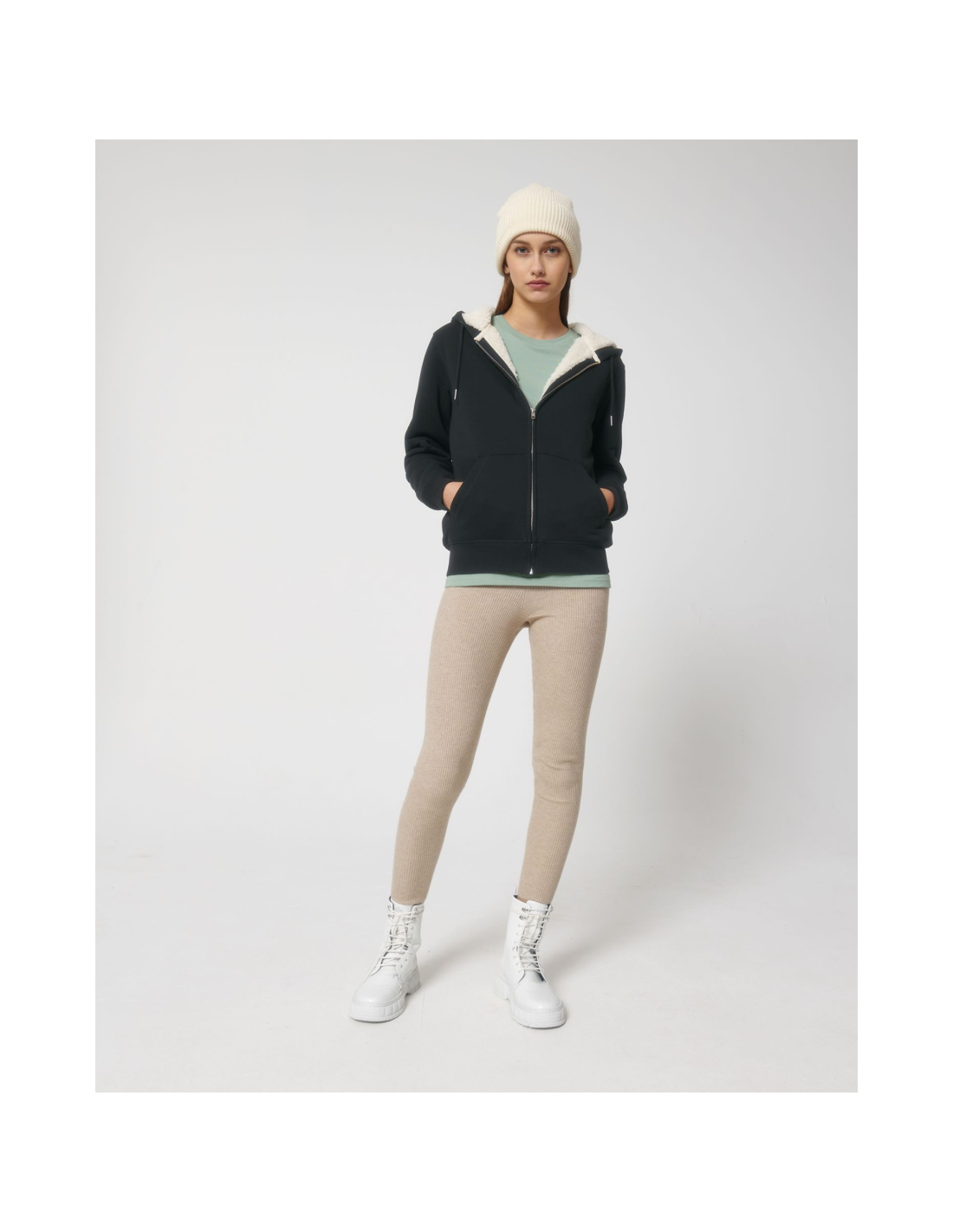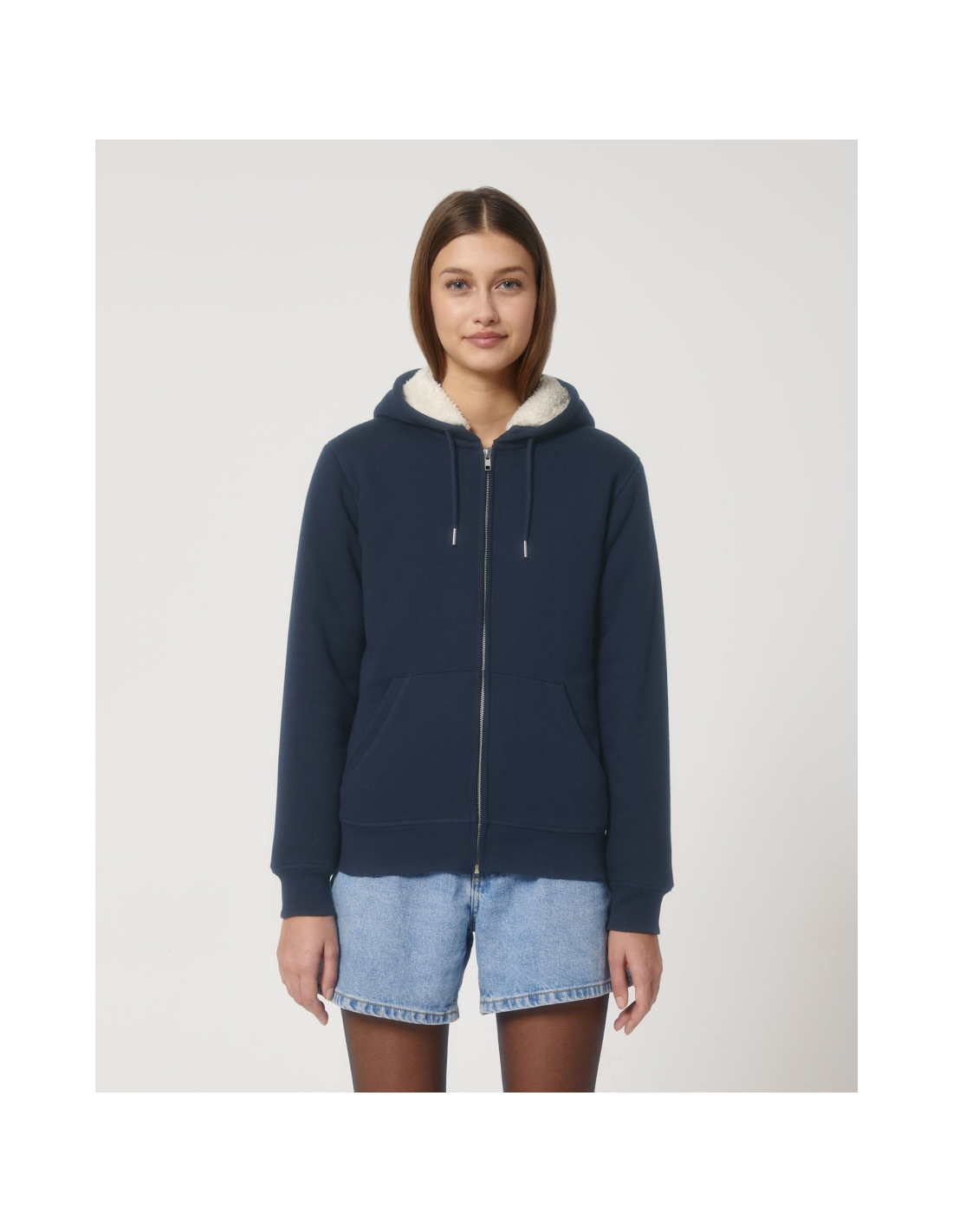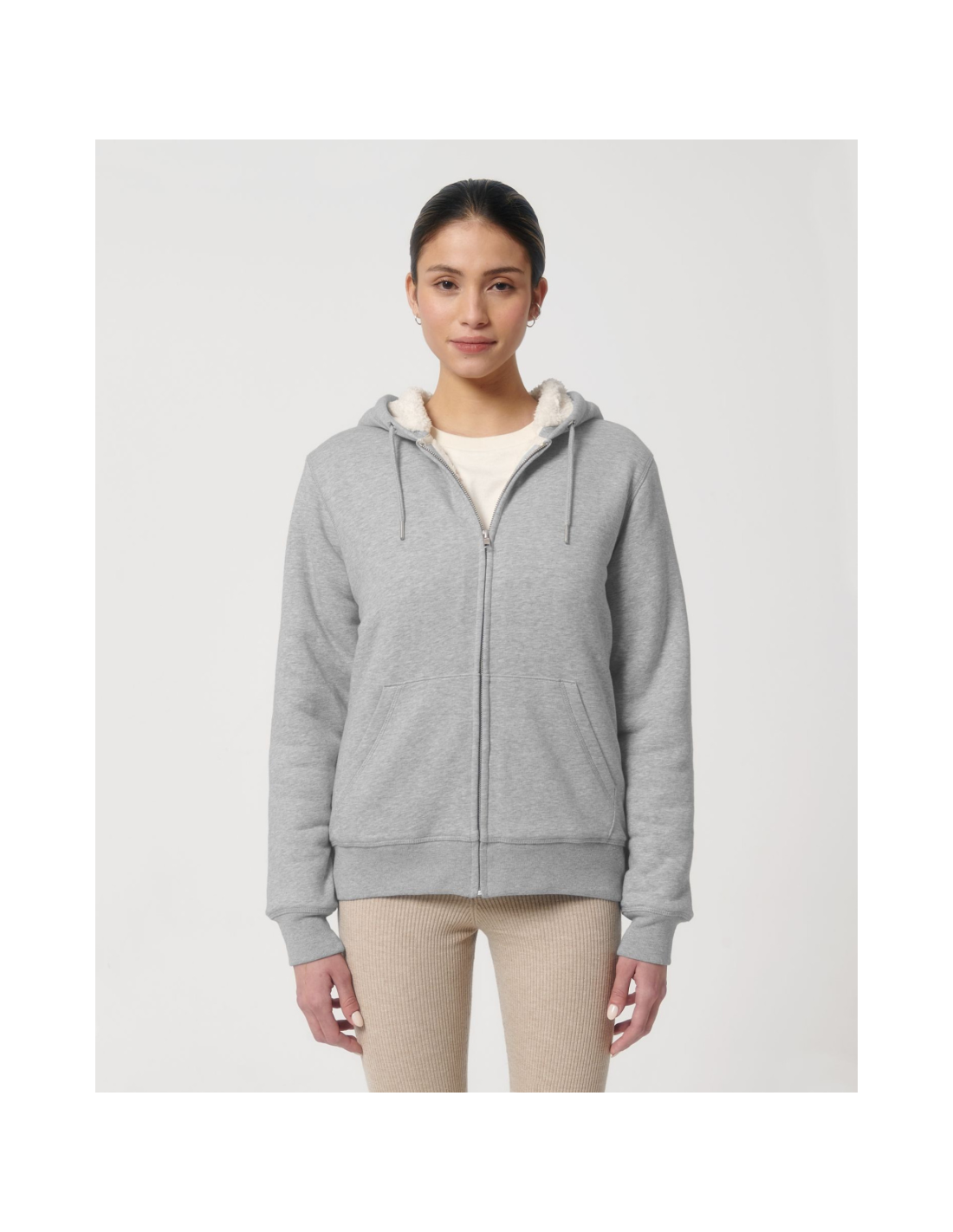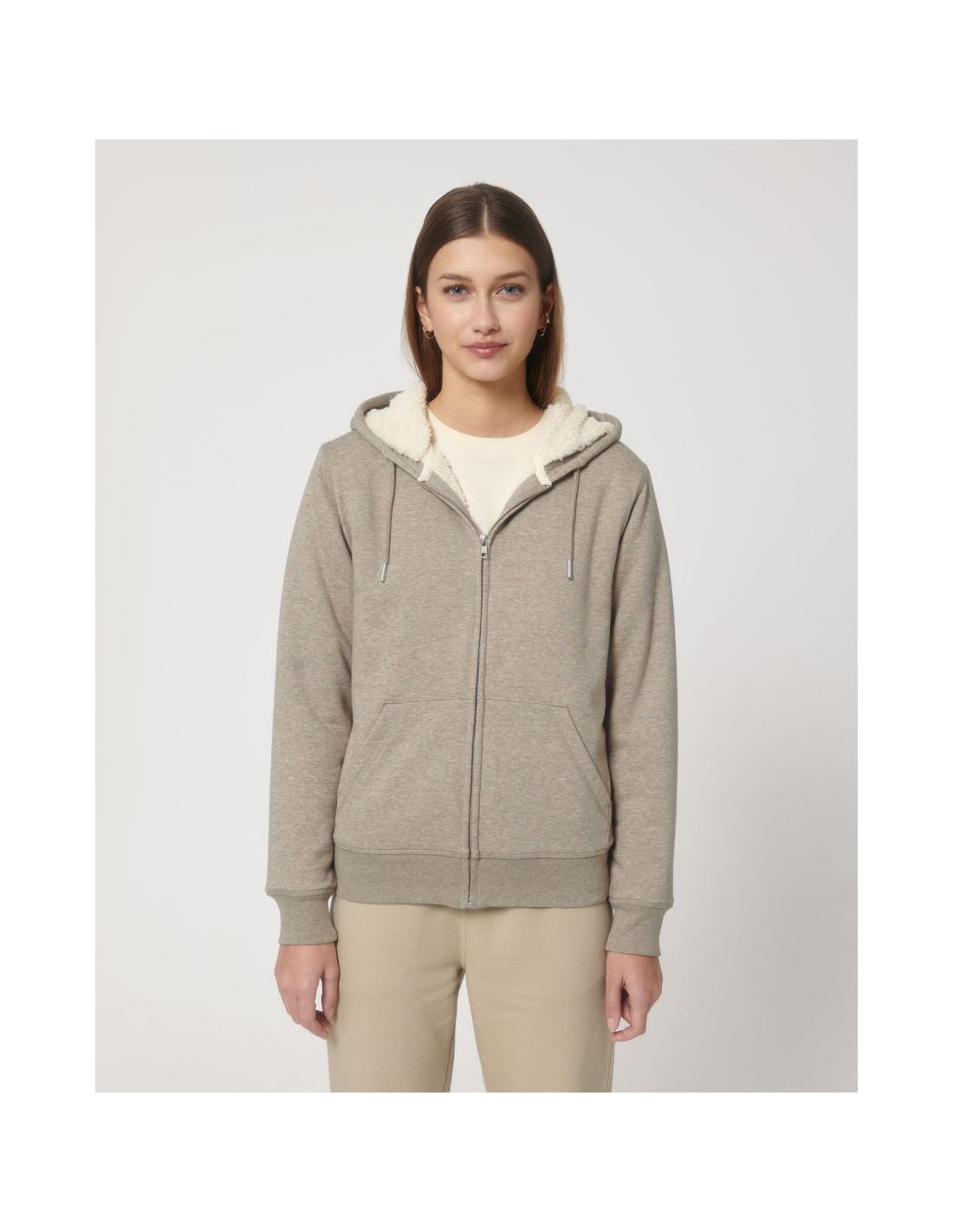 Kaptur z podszewką z szerpy z recyklingu Okrągły sznurek w kolorze materiału z metalowymi końcówkami Metalowe oczka Taśma wzmacniająca na karku w jodełkę Półksiężyc z tego samego materiału na karku Kryty metalowy zamek na środku przodu Wszywane rękawy Wewnętrzna kieszeń na piersi Kieszeń typu kangurka Ściągacz 1x1 na mankietach i u dołu Podwójne stebnowanie przy wykroju pach, na mankietach i u dołu Wewnętrzny ukryty zamek u dołu ułatwiający zdobienie Całość na podszewce z szerpy z recyklingu