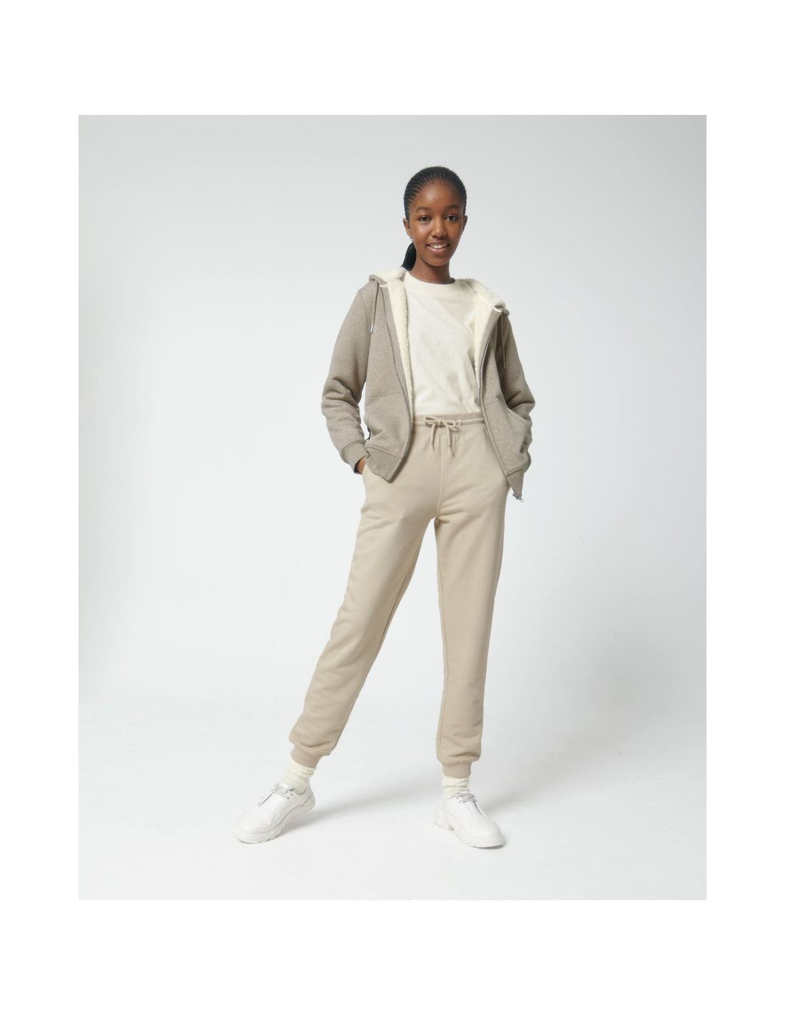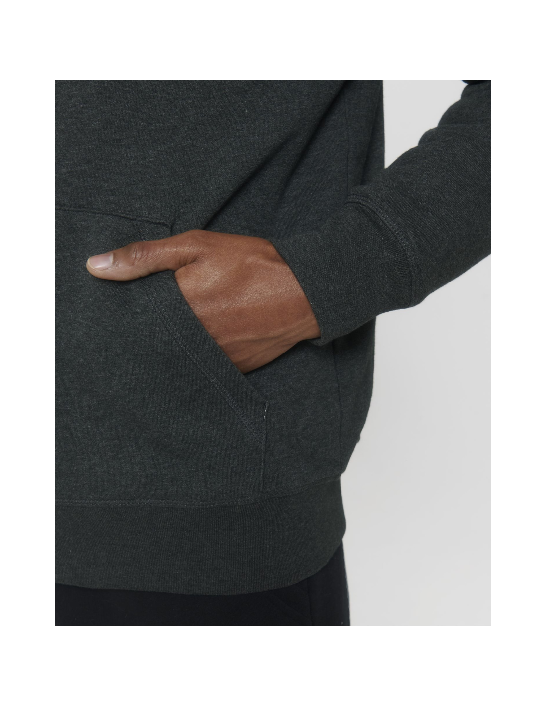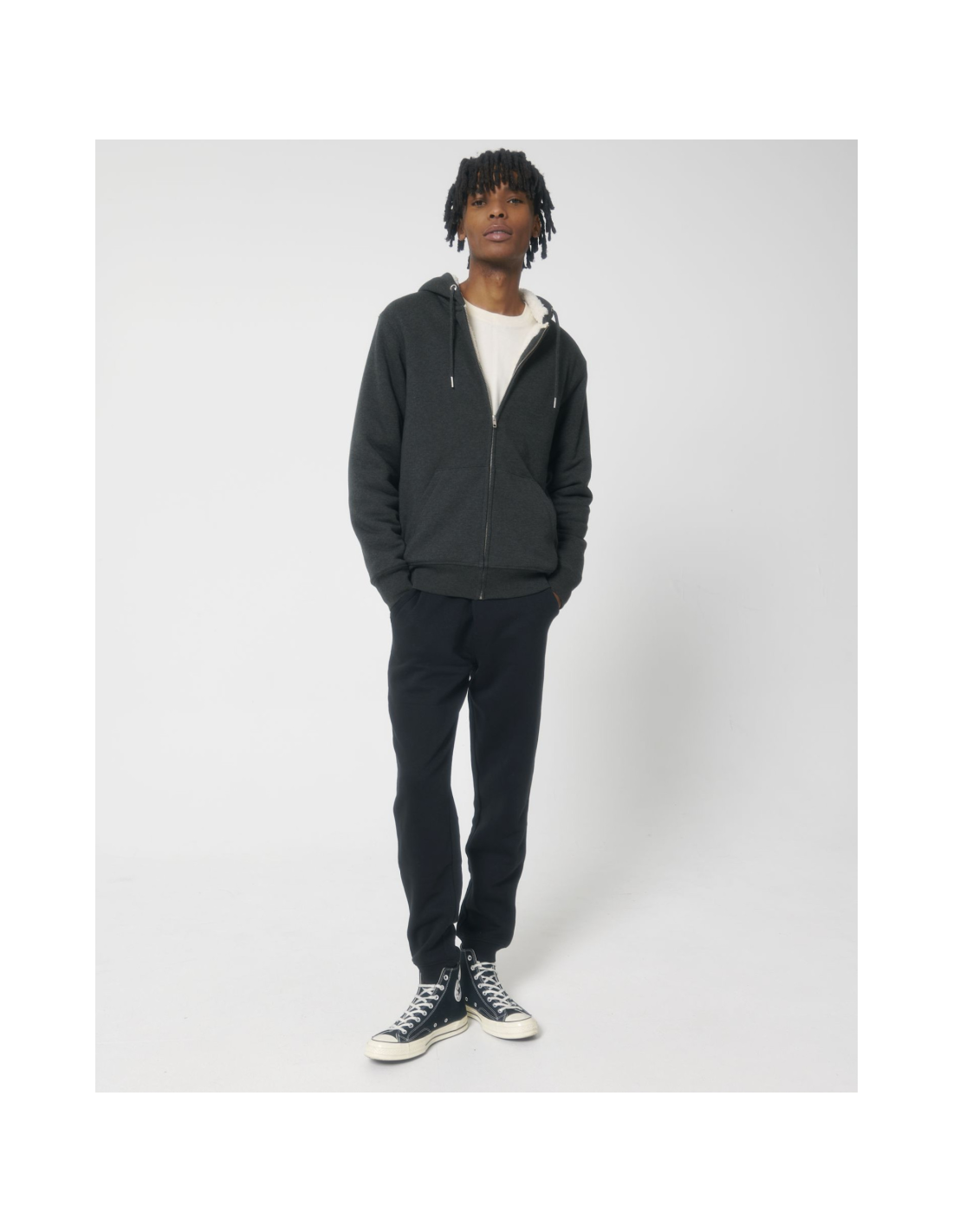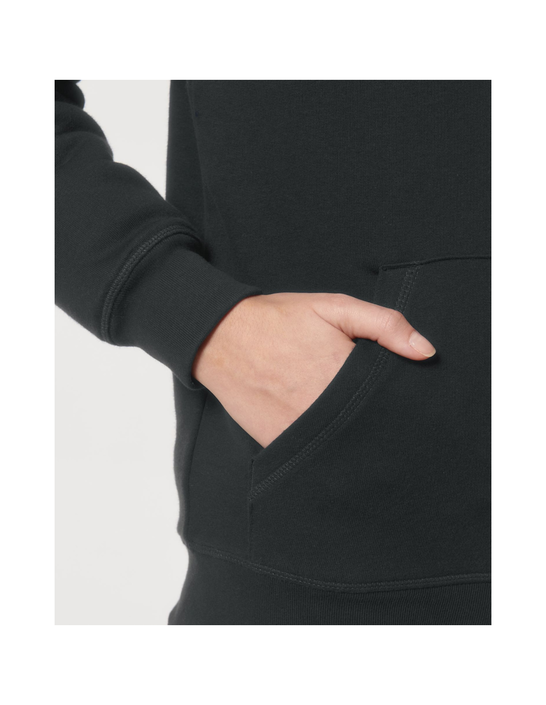 Kaptur z podszewką z szerpy z recyklingu Okrągły sznurek w kolorze materiału z metalowymi końcówkami Metalowe oczka Taśma wzmacniająca na karku w jodełkę Półksiężyc z tego samego materiału na karku Kryty metalowy zamek na środku przodu Wszywane rękawy Wewnętrzna kieszeń na piersi Kieszeń typu kangurka Ściągacz 1x1 na mankietach i u dołu Podwójne stebnowanie przy wykroju pach, na mankietach i u dołu Wewnętrzny ukryty zamek u dołu ułatwiający zdobienie Całość na podszewce z szerpy z recyklingu