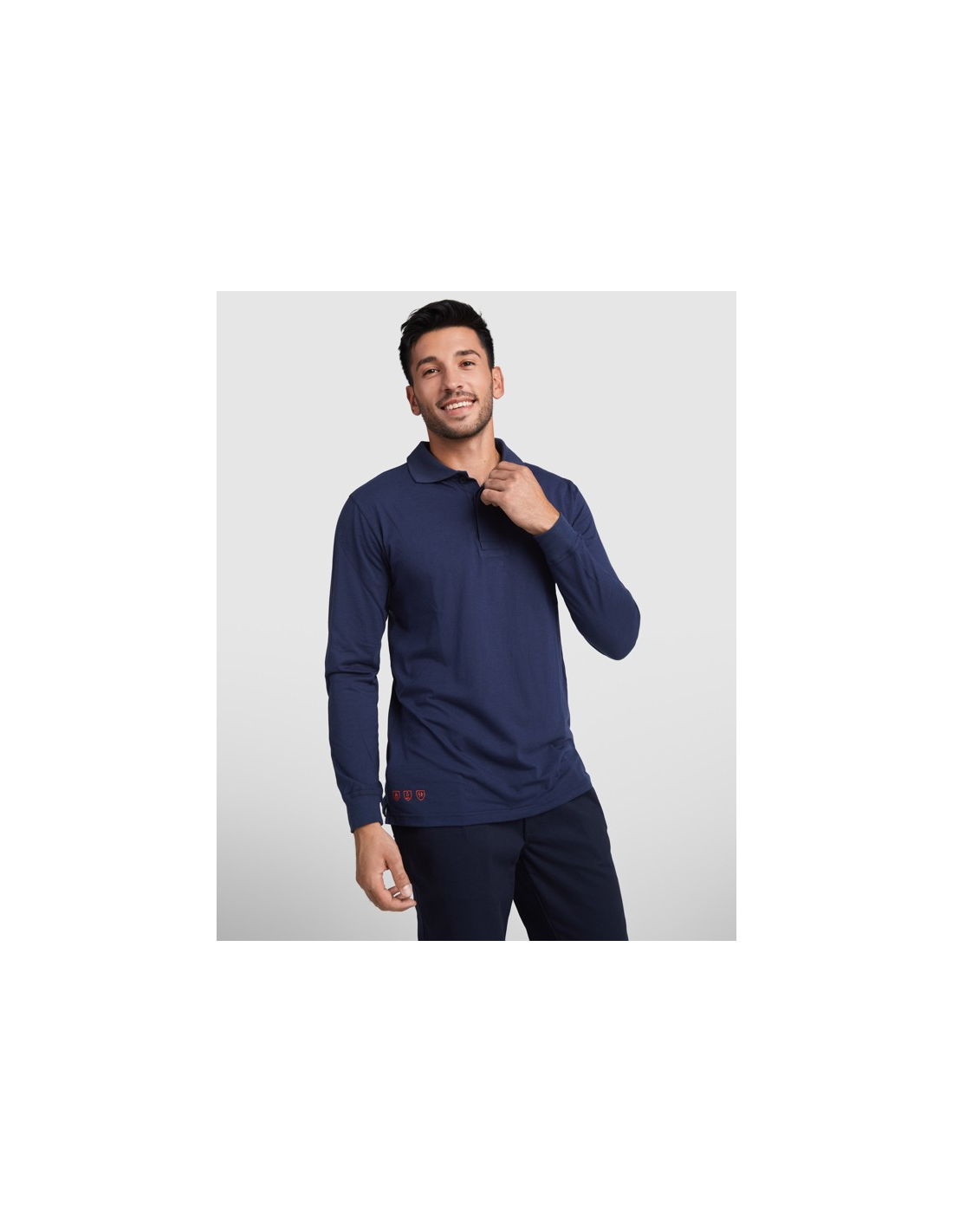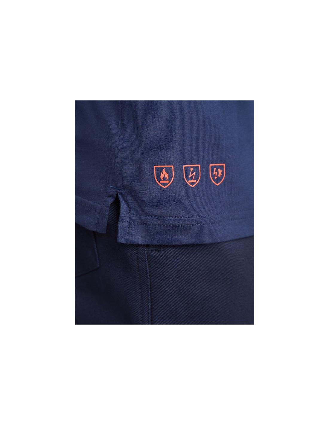 Polo z długimi rękawami z materiału trudnopalnego. · Kołnierz i zakończenia rękawów z dzianiny prążkowanej 1x1. · Klapa z 3 schowanymi guzikami. · Obwódka wzmocniona przy kołnierzu. · Otwarte boki na dole.