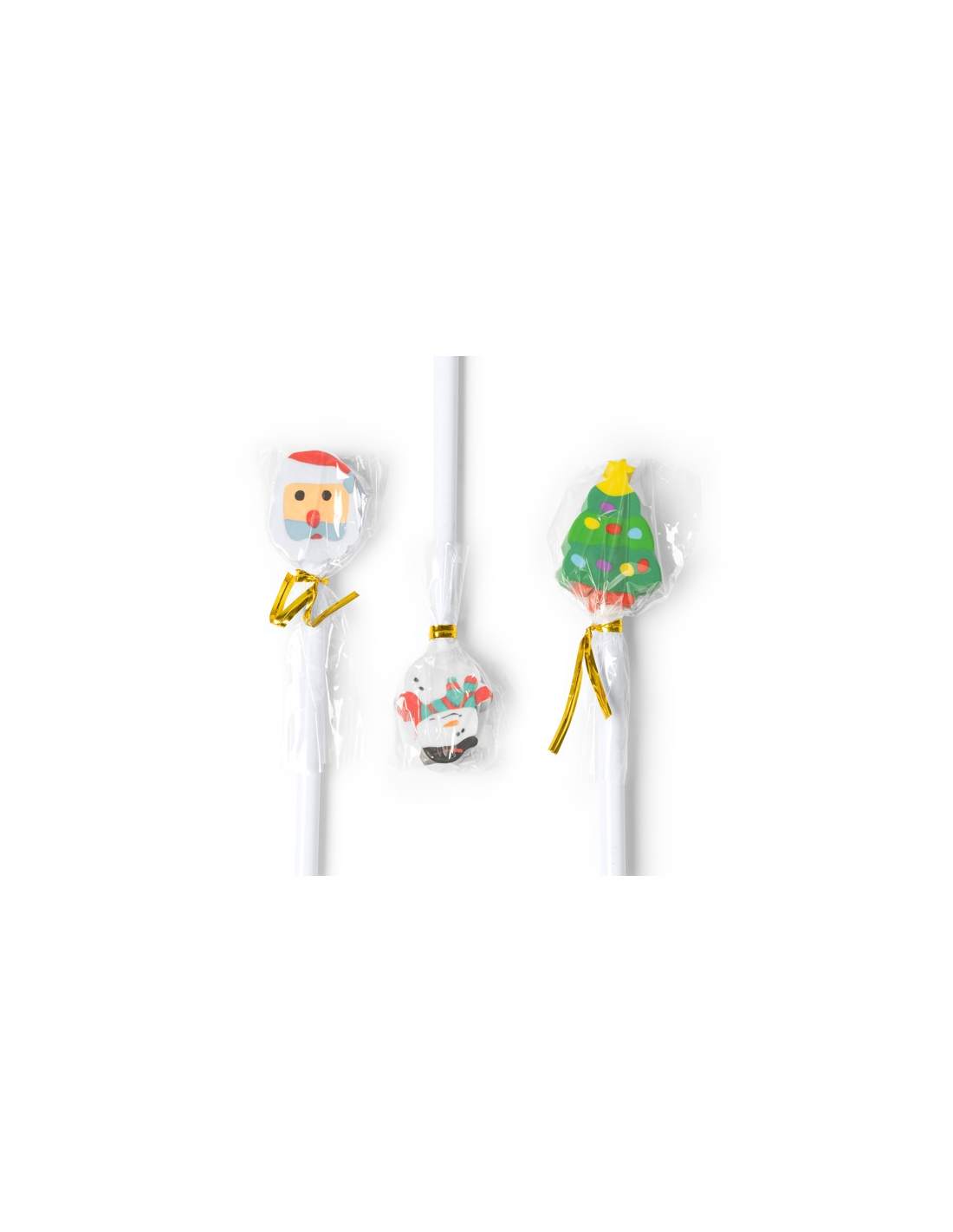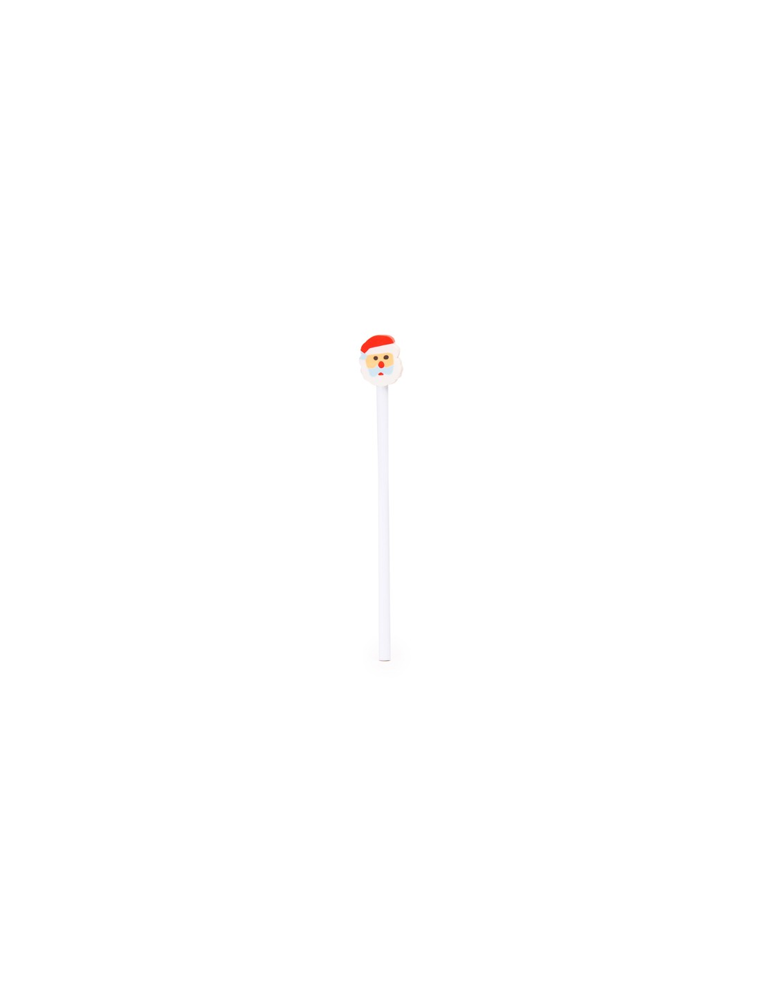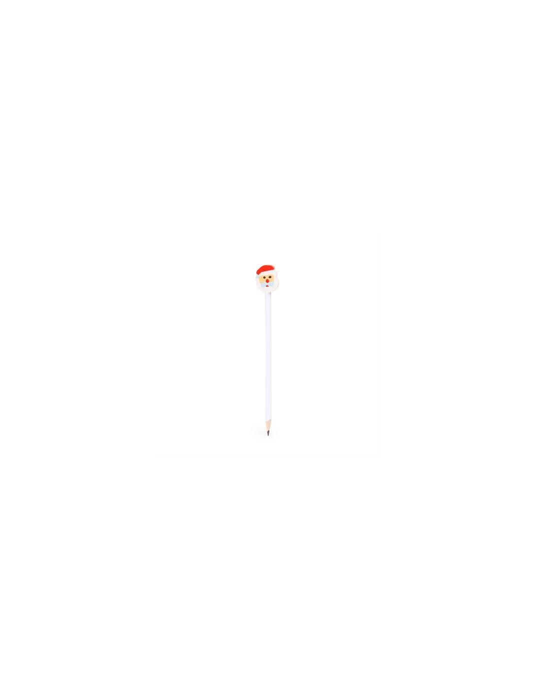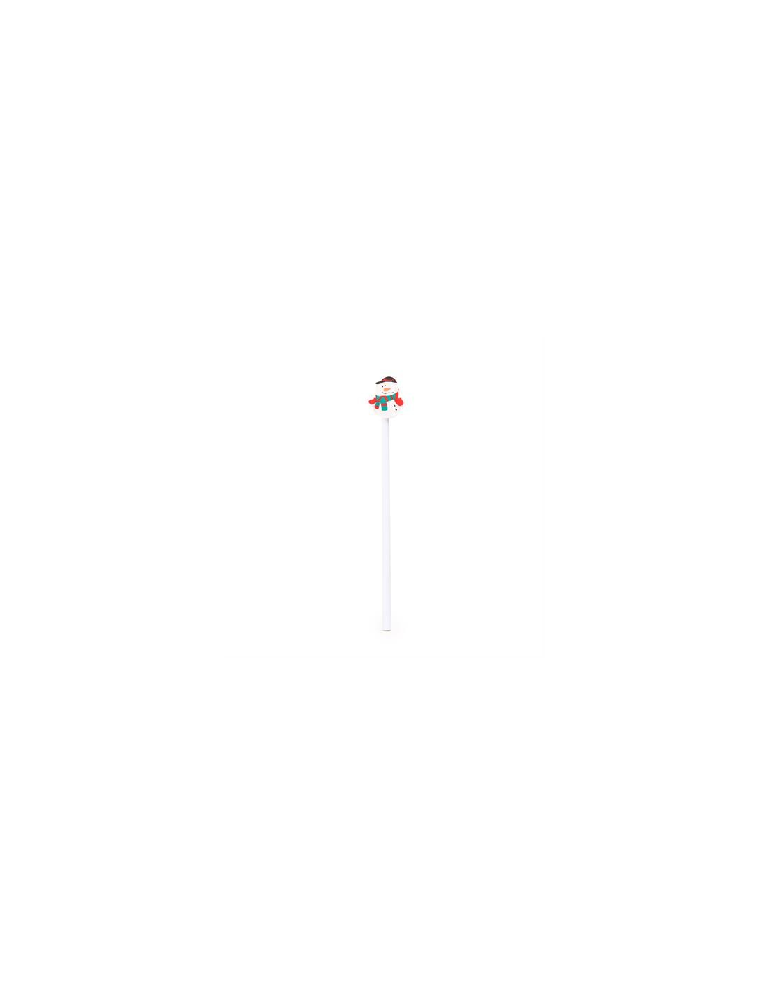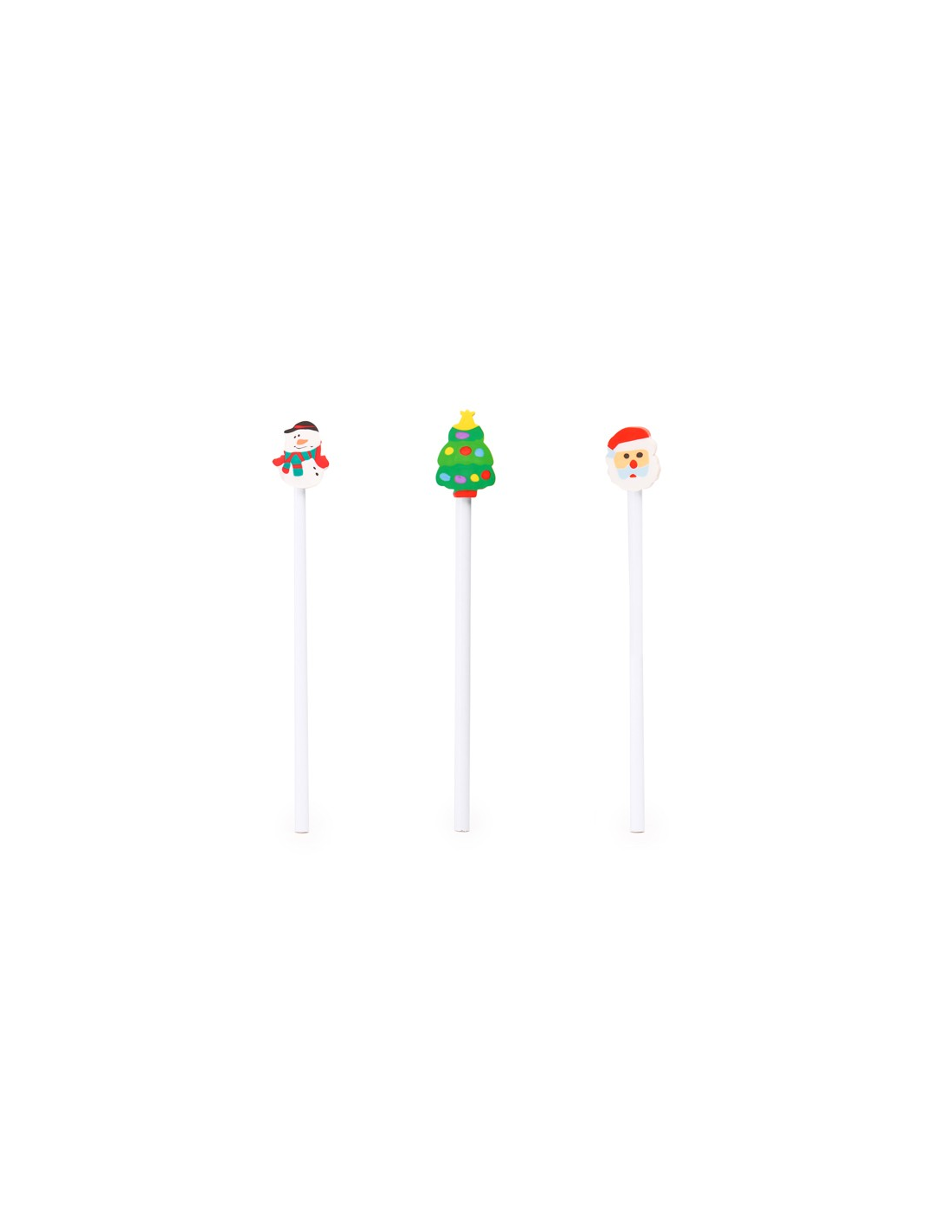 Okrągły biały drewniany ołówek z gumką dostępny w trzech świątecznych wzorach: choinka, mikołaj i bałwanek.