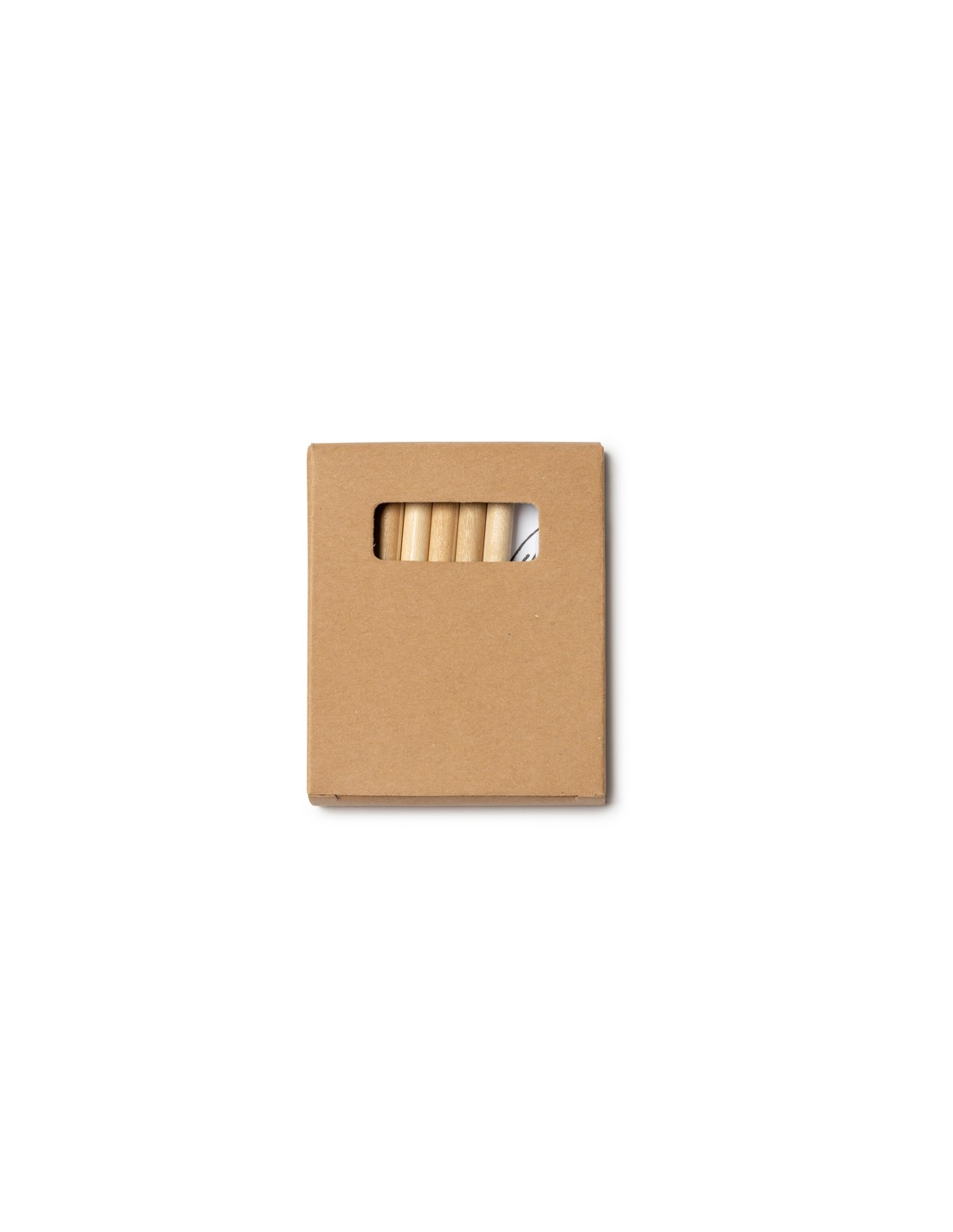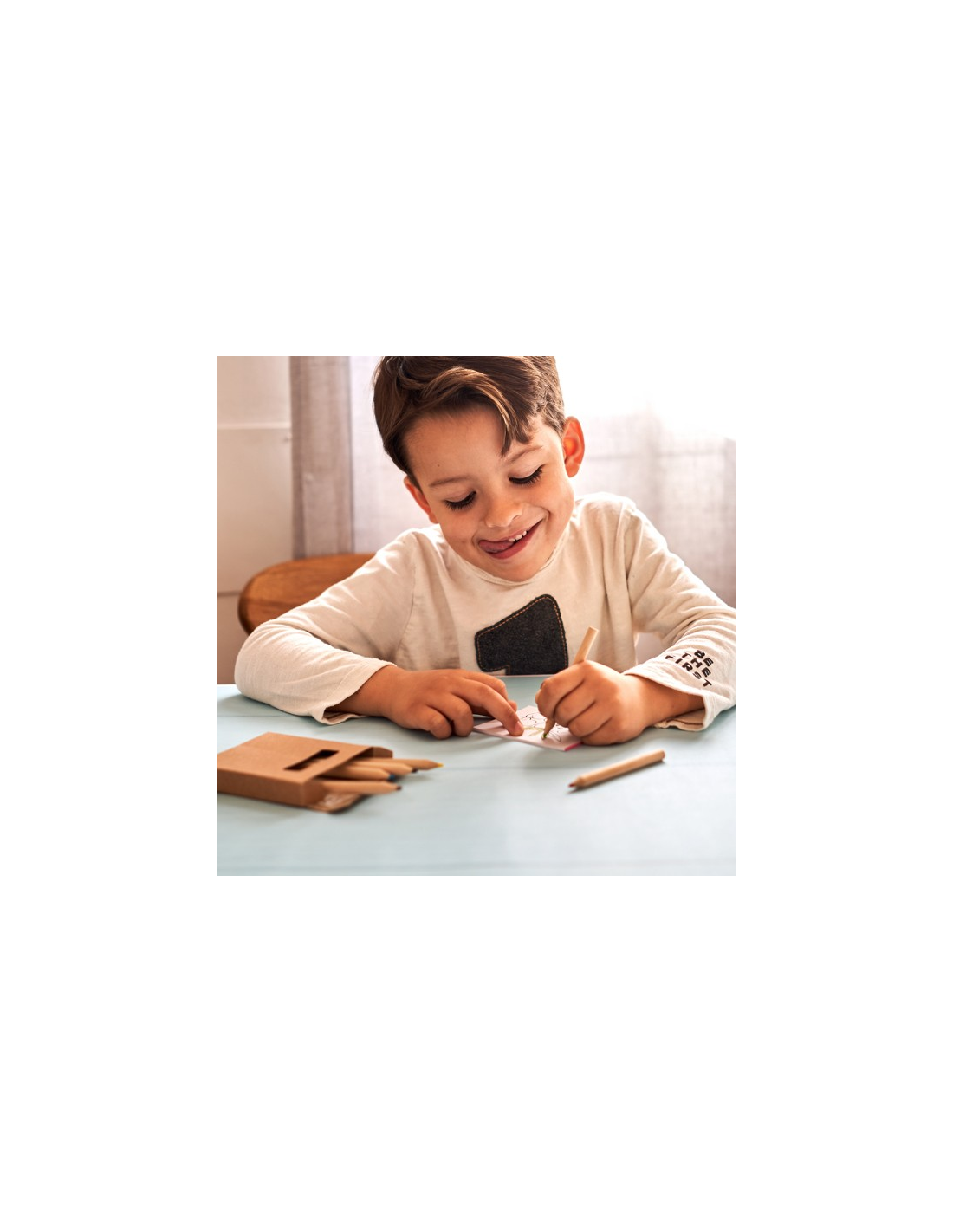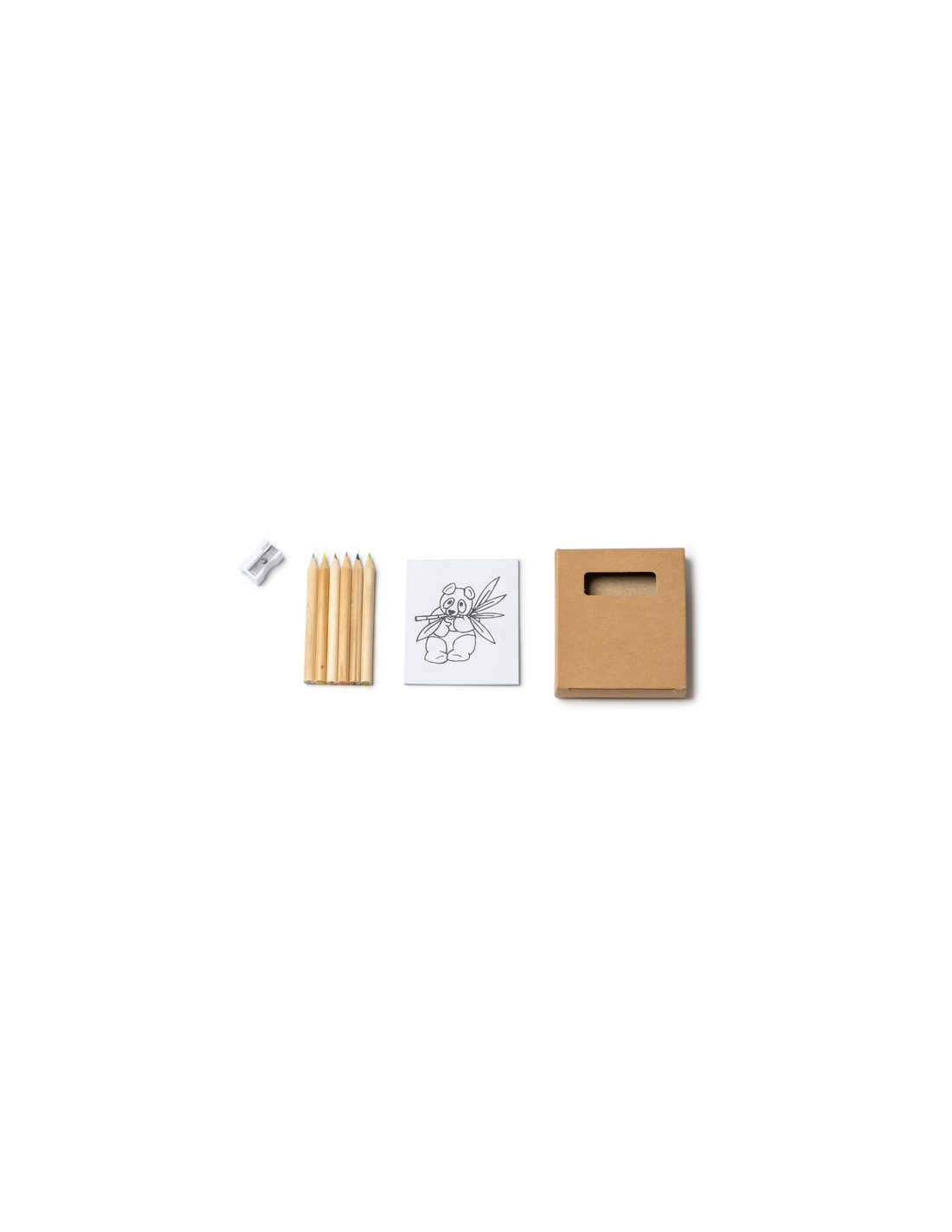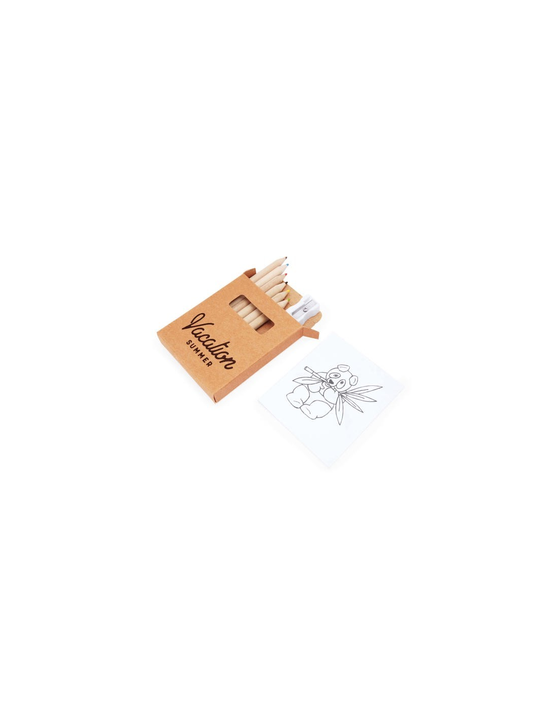 Zestaw do kolorowania dla dzieci. Zawiera podkładkę z rysunkami, 6 kolorowych kredek i temperówkę. Prezentowane w pudełku z kartonu pochodzącego z recyklingu.