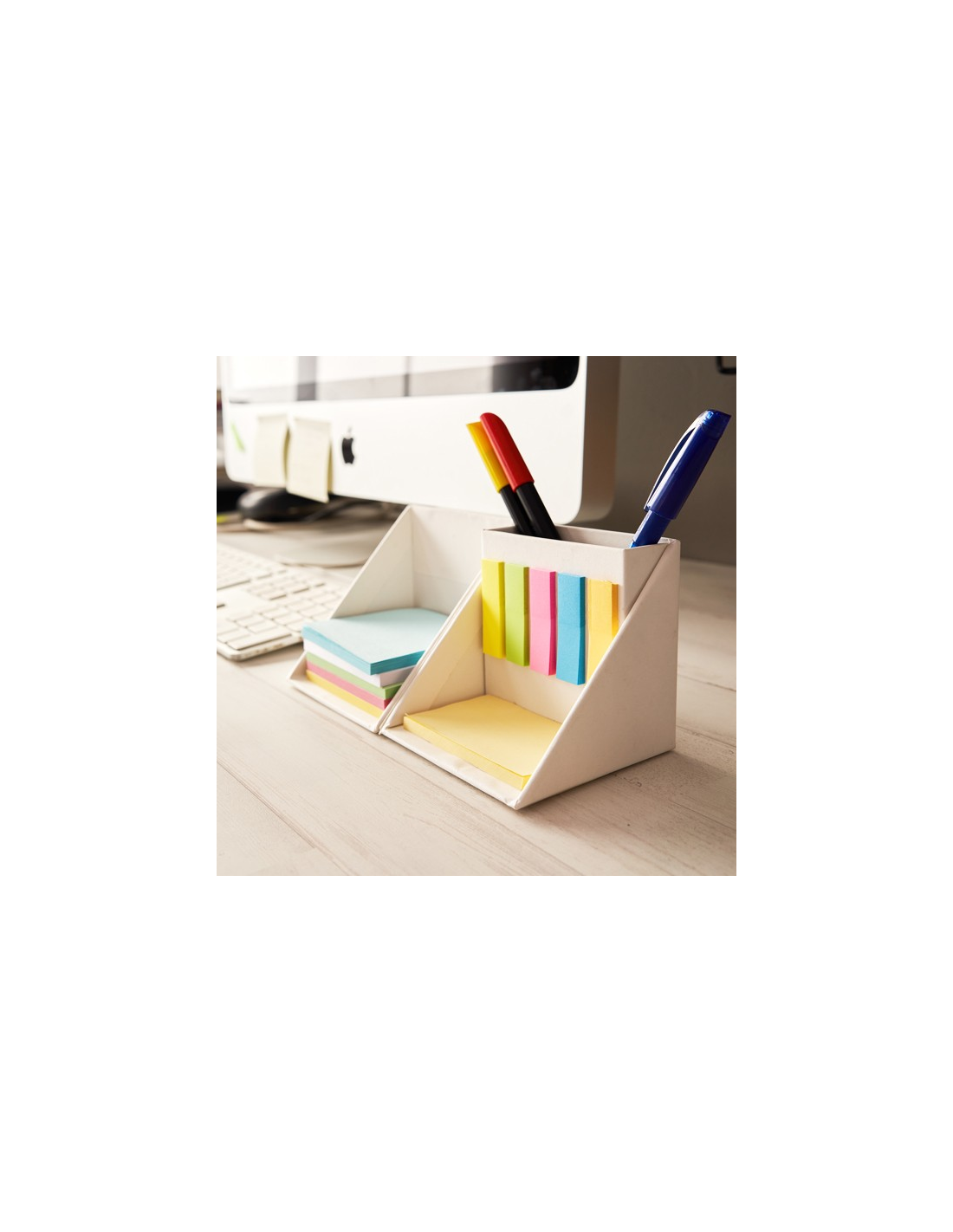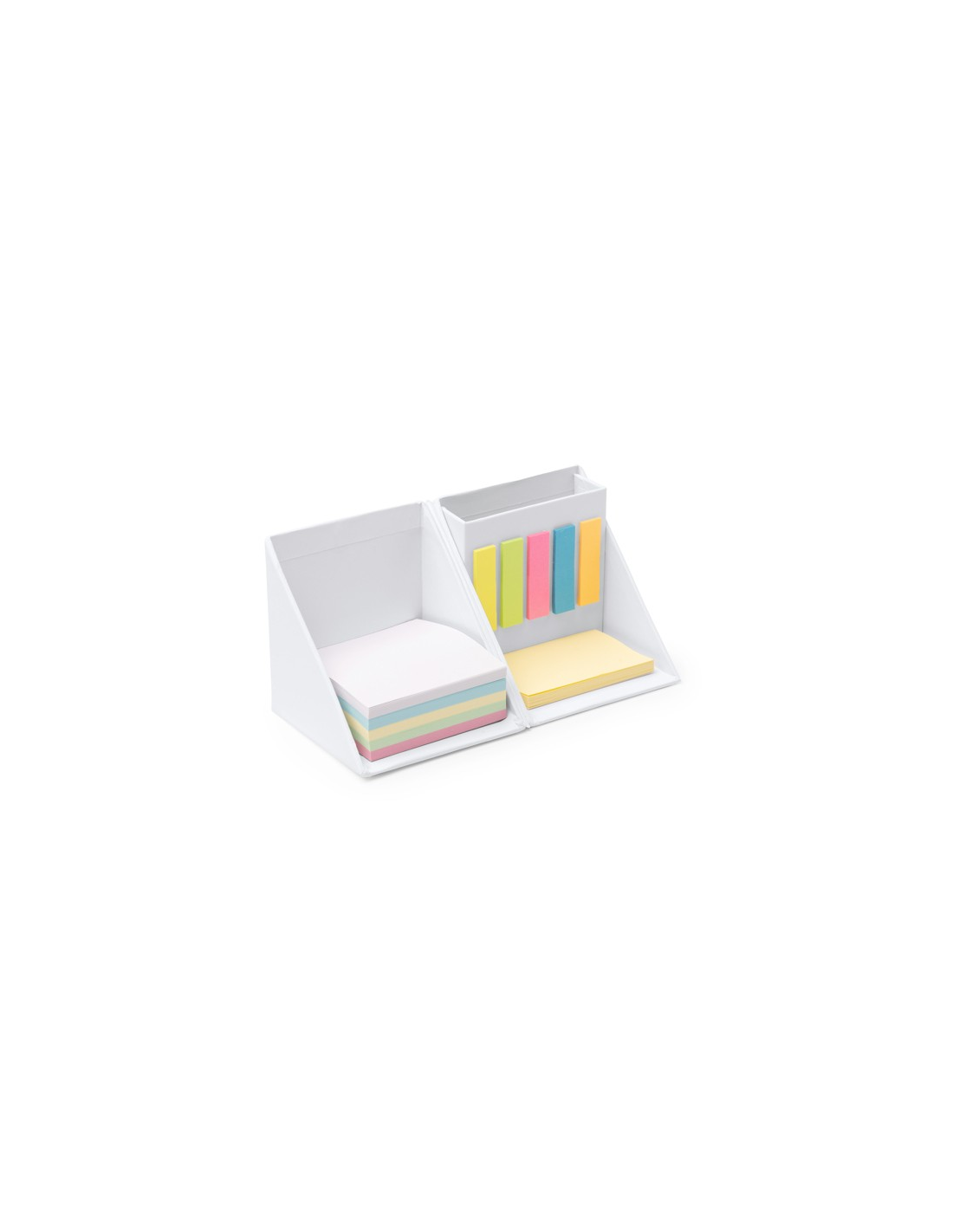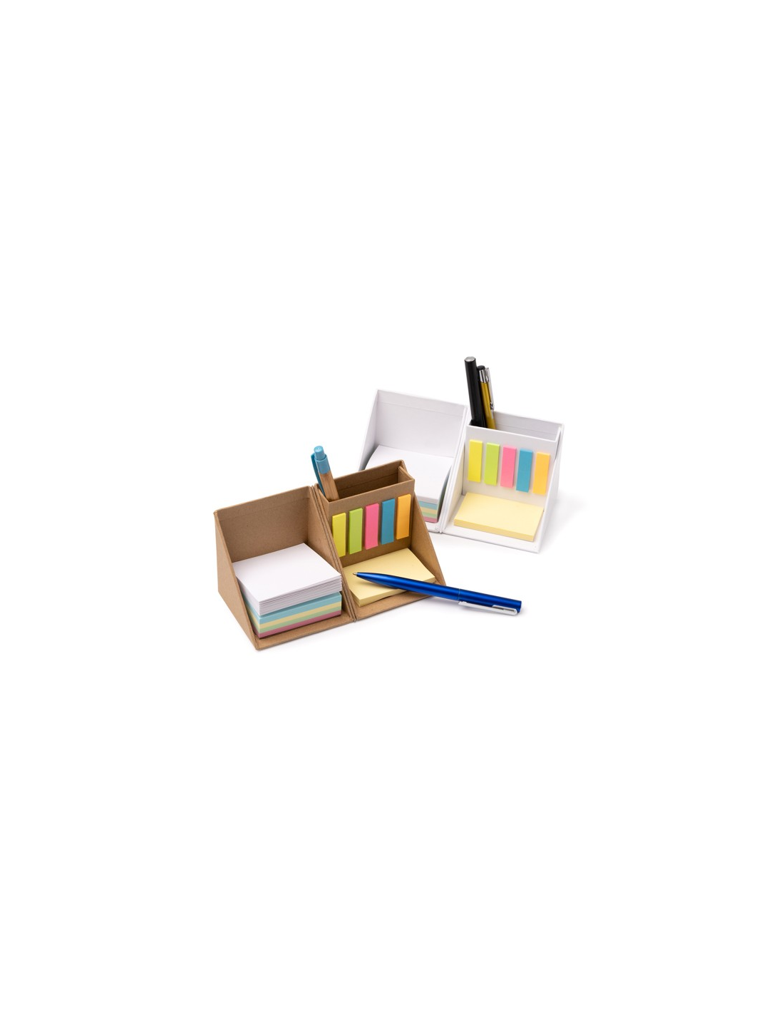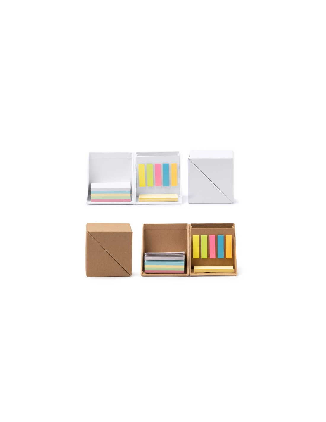 Tekturowy zestaw na biurko w kształcie sześcianu składający się z ołówka, notatnika (250 kartek) i 180 karteczek samoprzylepnych w różnych kolorach.