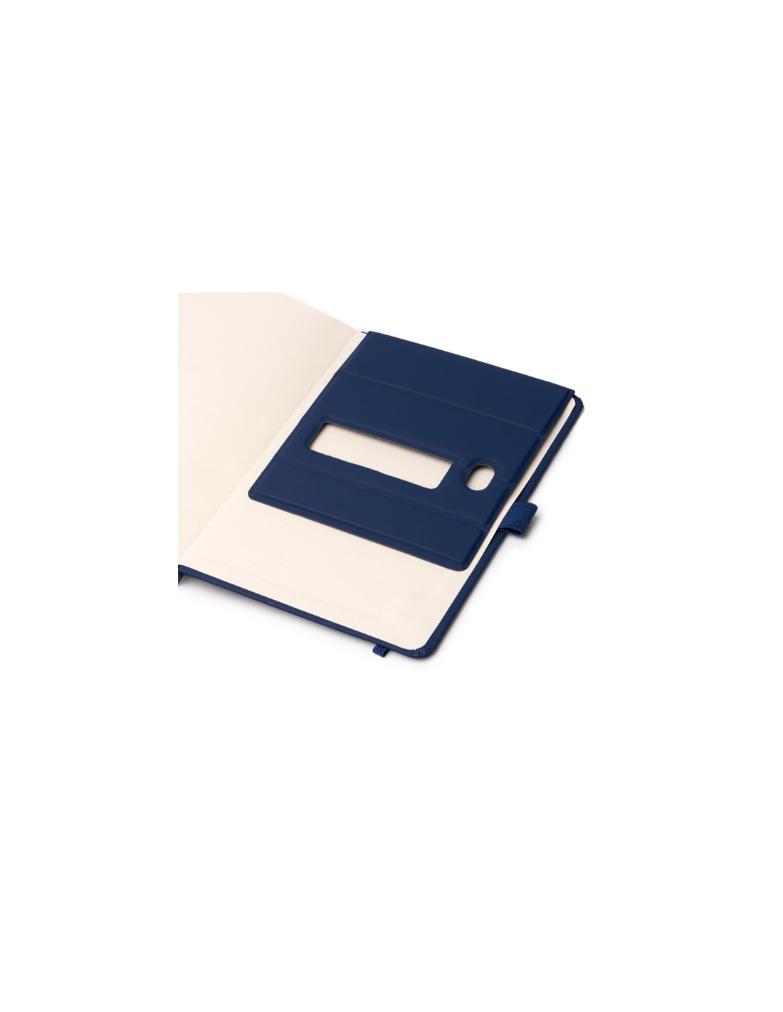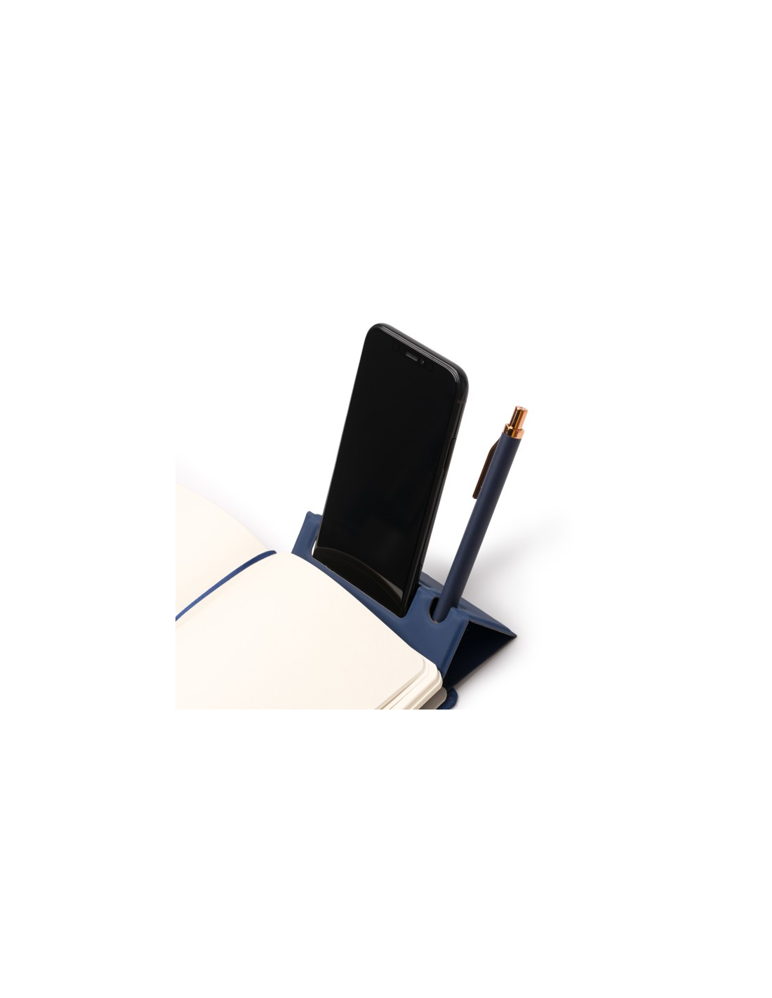 Notatnik A5 ze skóry PU pochodzącej z recyklingu z pustymi stronami i magnetycznym wsparciem dla smartfona i długopisem. Zakładka, elastyczne zamknięcie i uchwyt na długopis pasujący do okładki w zestawie.