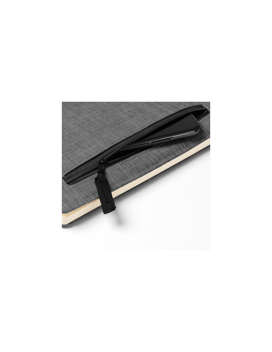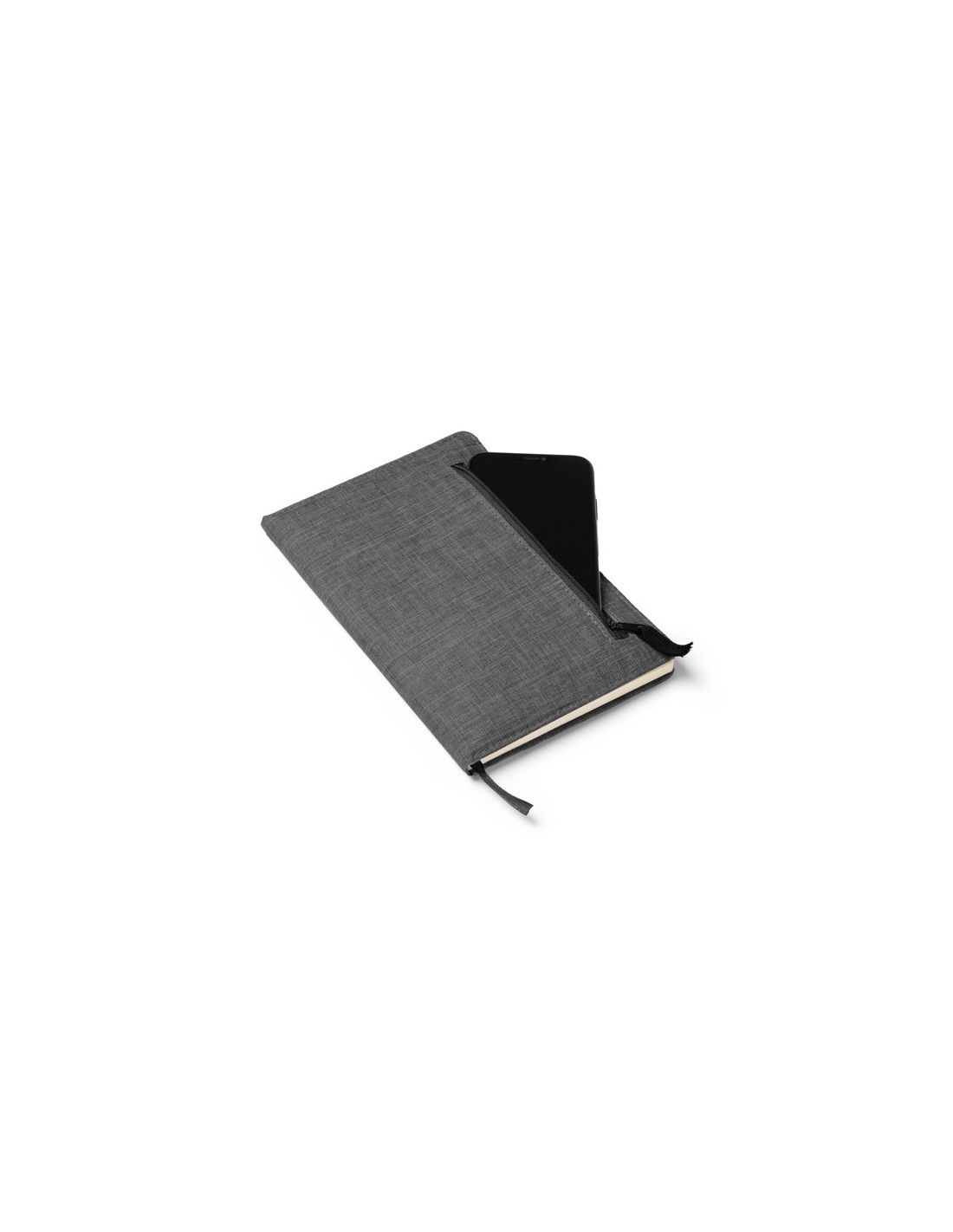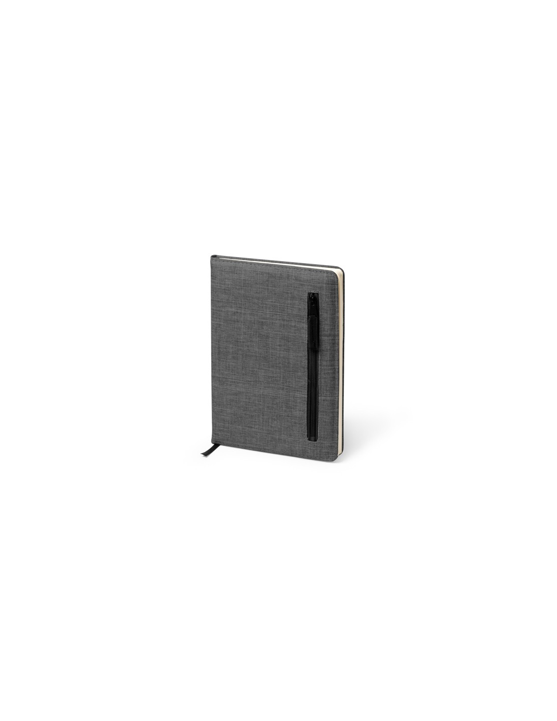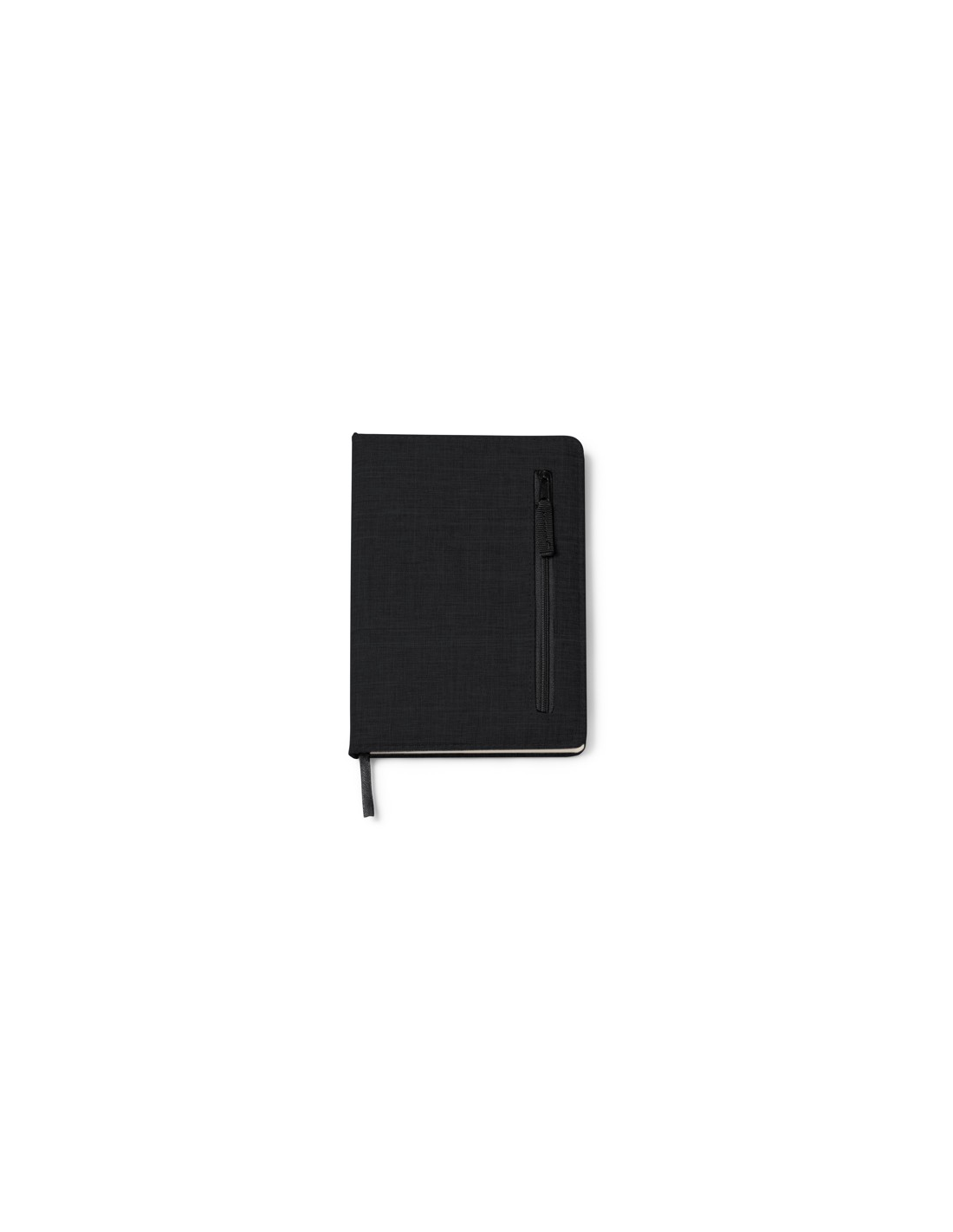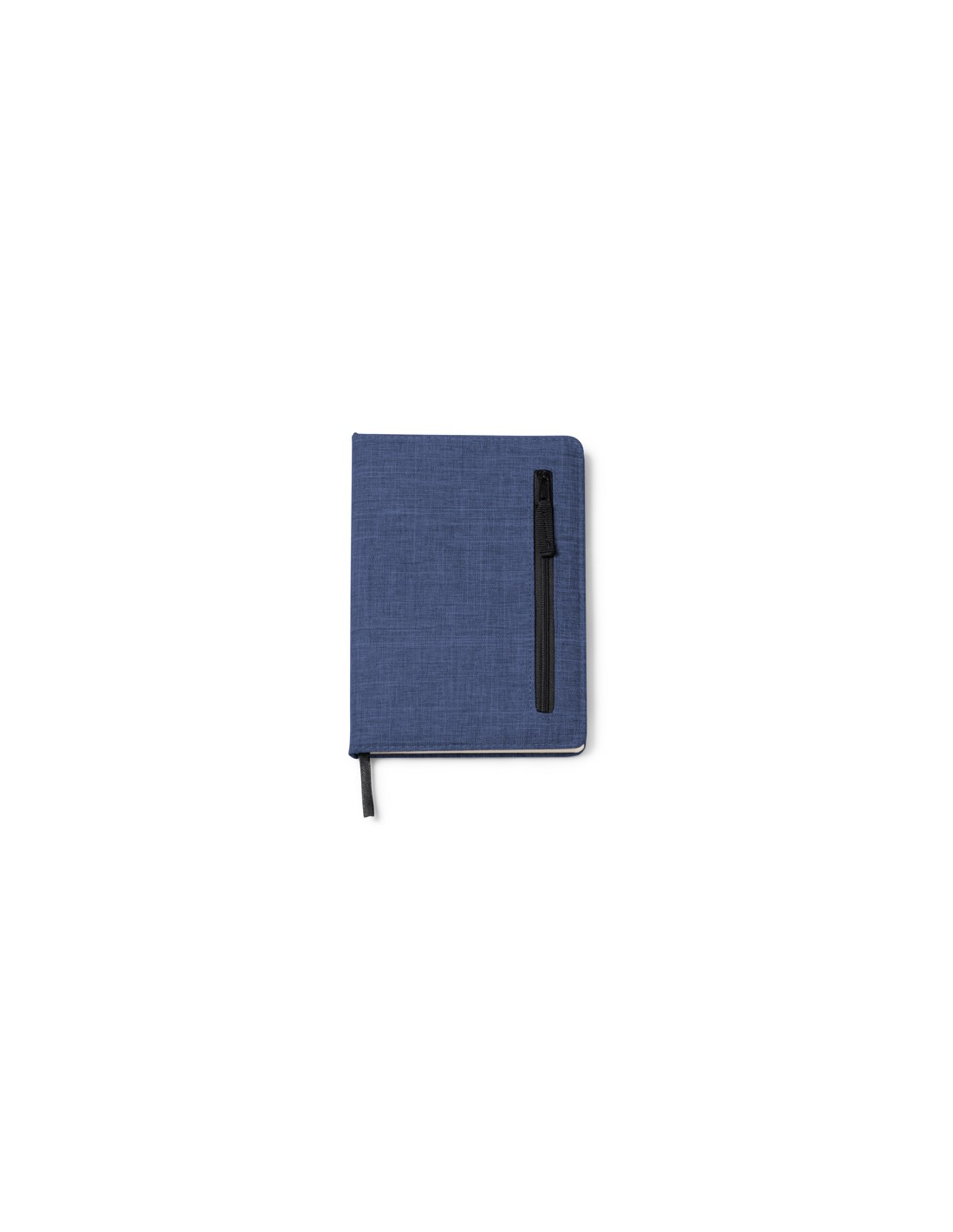 Zeszyt A5 wykonany w tkaniny RPET. Zewnętrzna kieszeń z zapięciem na zamek błyskawiczny. Zakładka w zestawie. 80 kartek w linie.