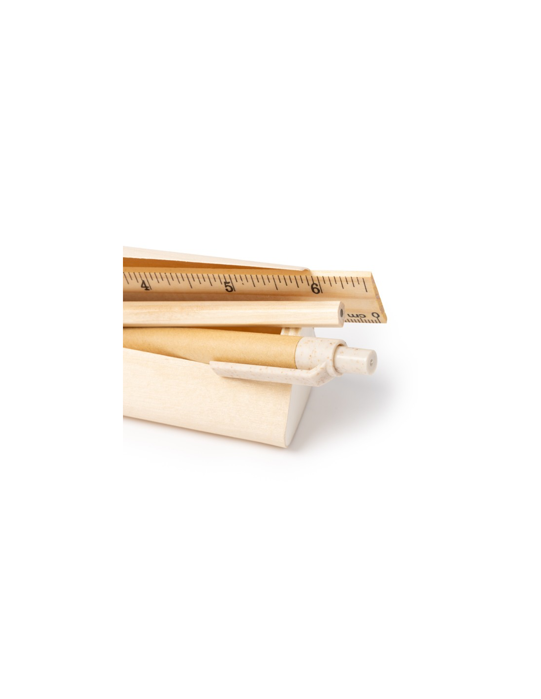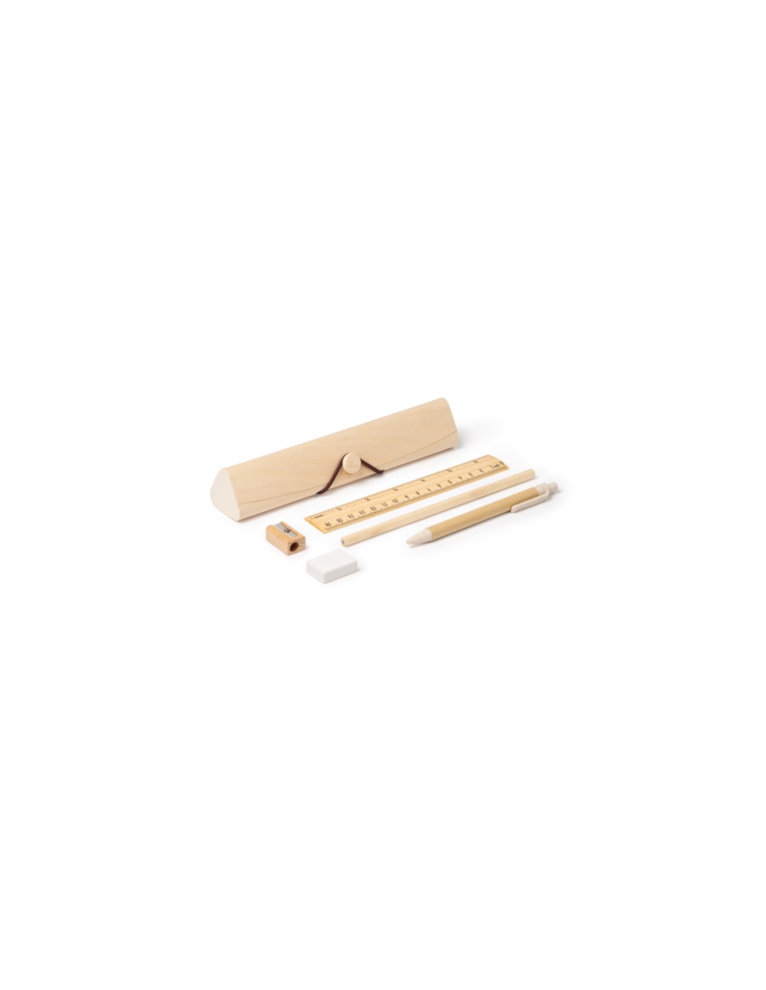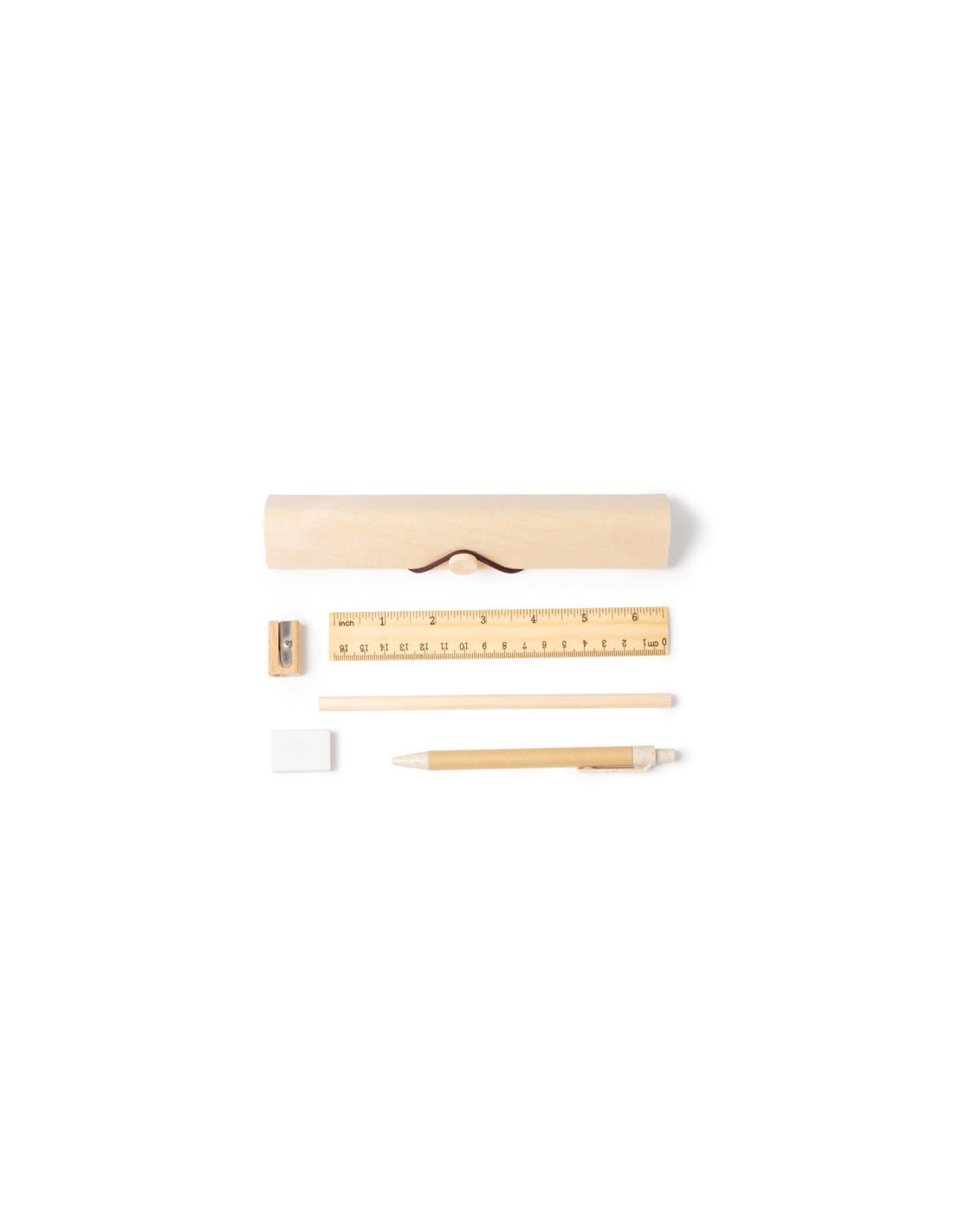Zestaw piśmienniczy z naturalnego drewna w drewnianym etui. Zawiera 5 podstawowych produktów: linijkę, ołówek, długopis z tektury pochodzącej z recyklingu z przyciskiem, gumkę i temperówkę.