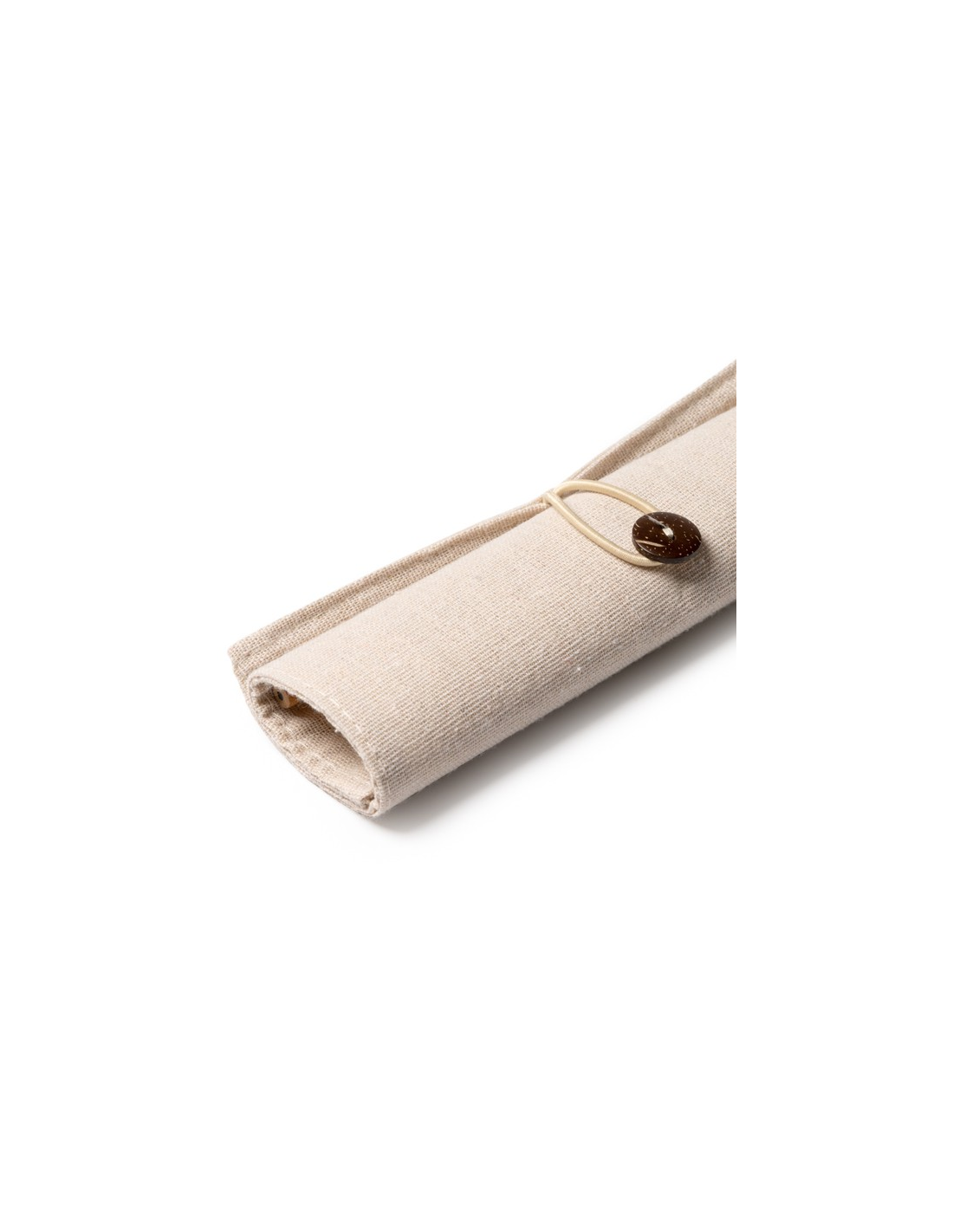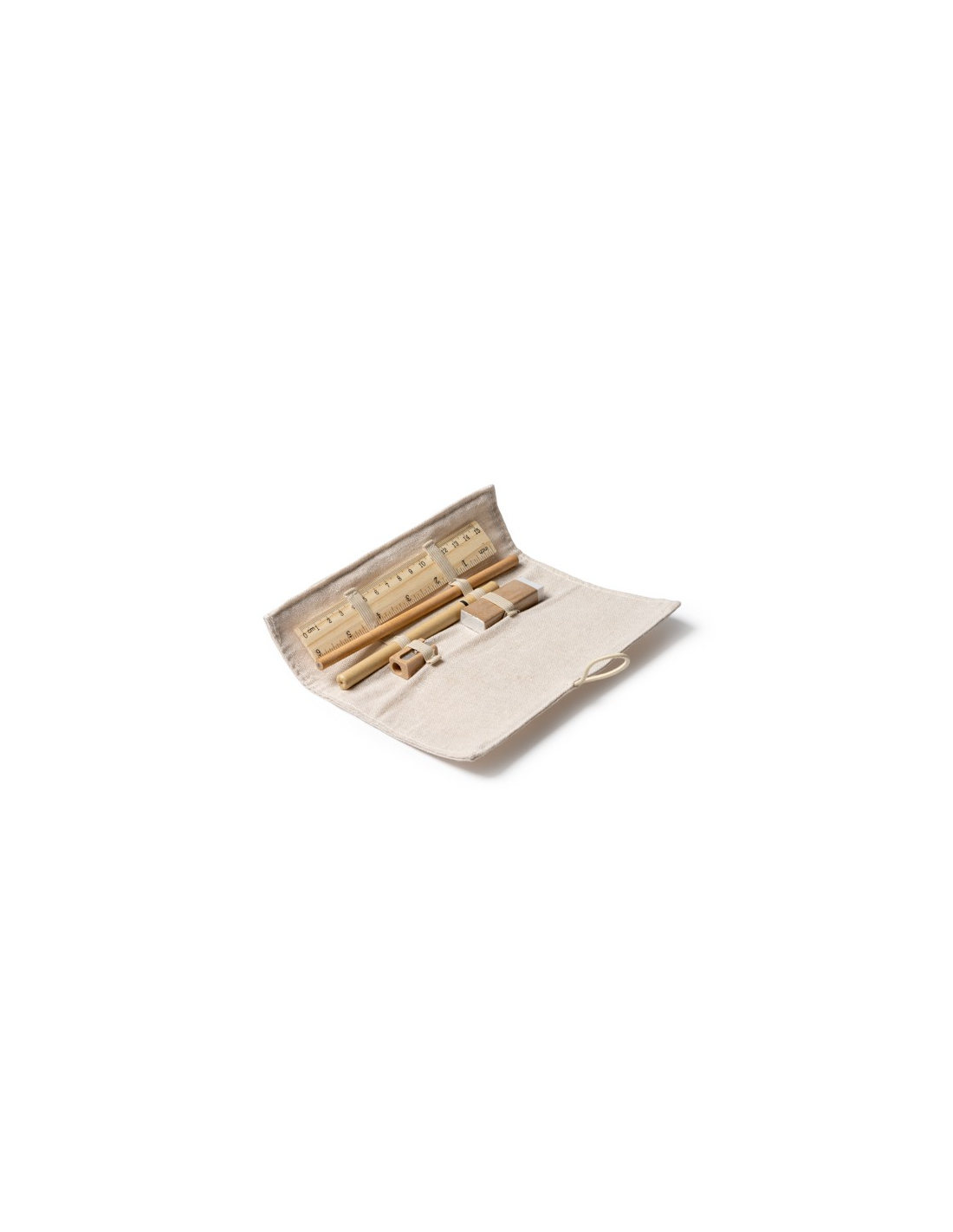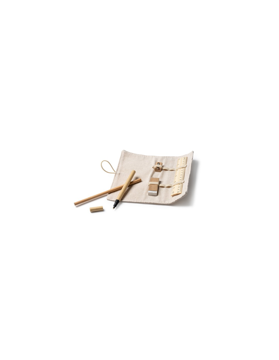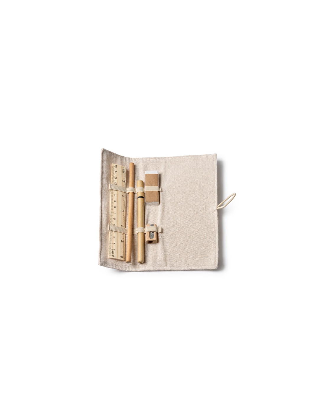 Zestaw do pisania z linijką wykonaną z bambusa, ołówkiem wykonanym z papieru, długopisem wykonanym z tektury, drewnianą temperówką i gumką. Zapakowany w etui z juty i bawełny.