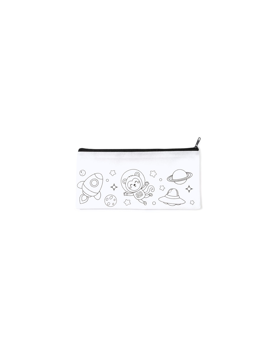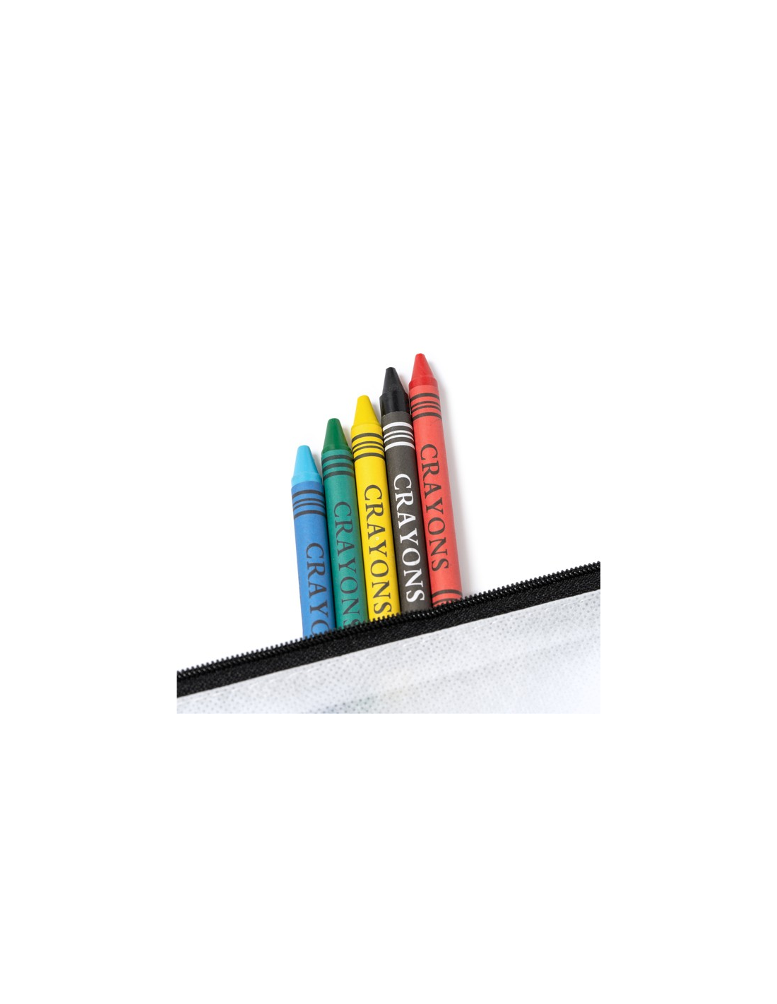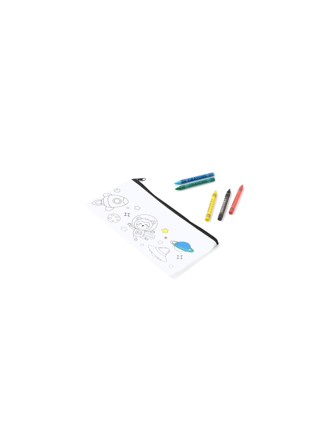 Pencil case in non-woven for kids, with design for colouring. 5 crayons in assorted colours included.