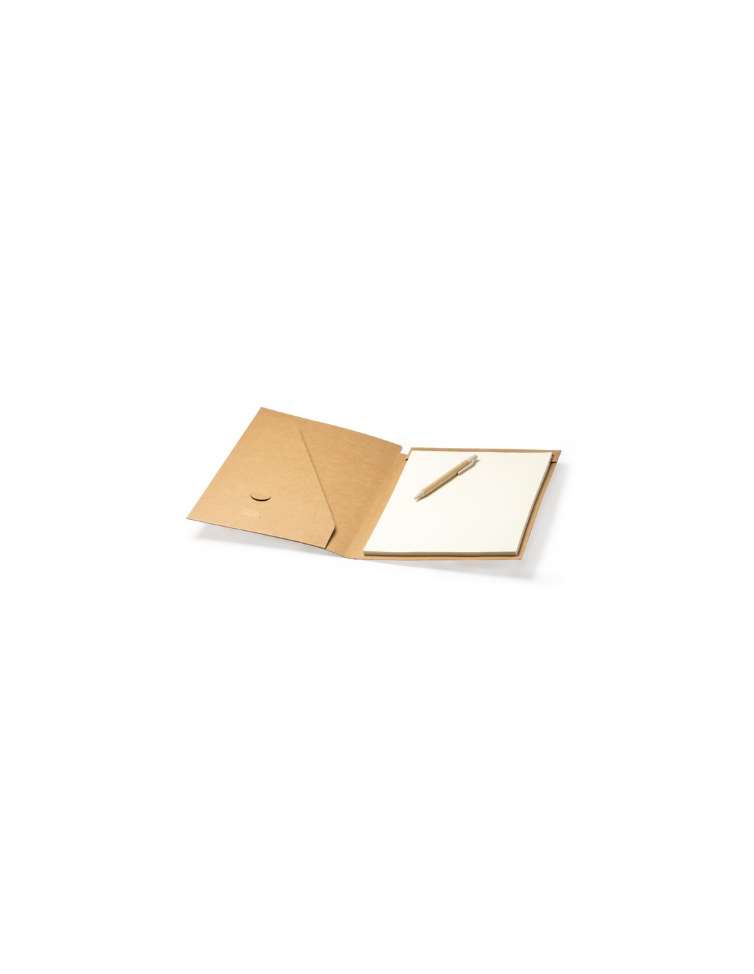Teczka z tektury pochodzącej z recyklingu. Odczepiana gładka podkładka z 20 arkuszami, pasujące pióro wykonane z włókna pszennego, kieszeń wewnętrzna i uchwyt na kartę w zestawie.
