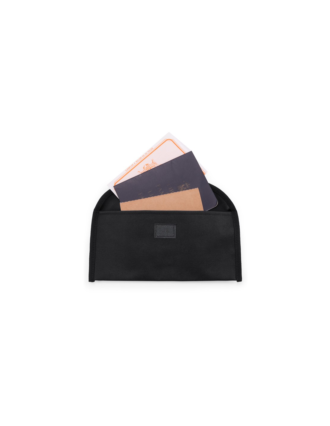 Podróżna saszetka na dokumenty zapinana na rzep i z praktycznym uchwytem na pasek.Poliester 600D.