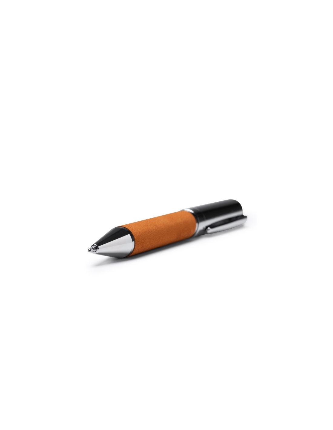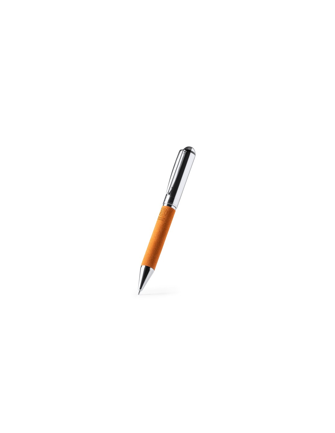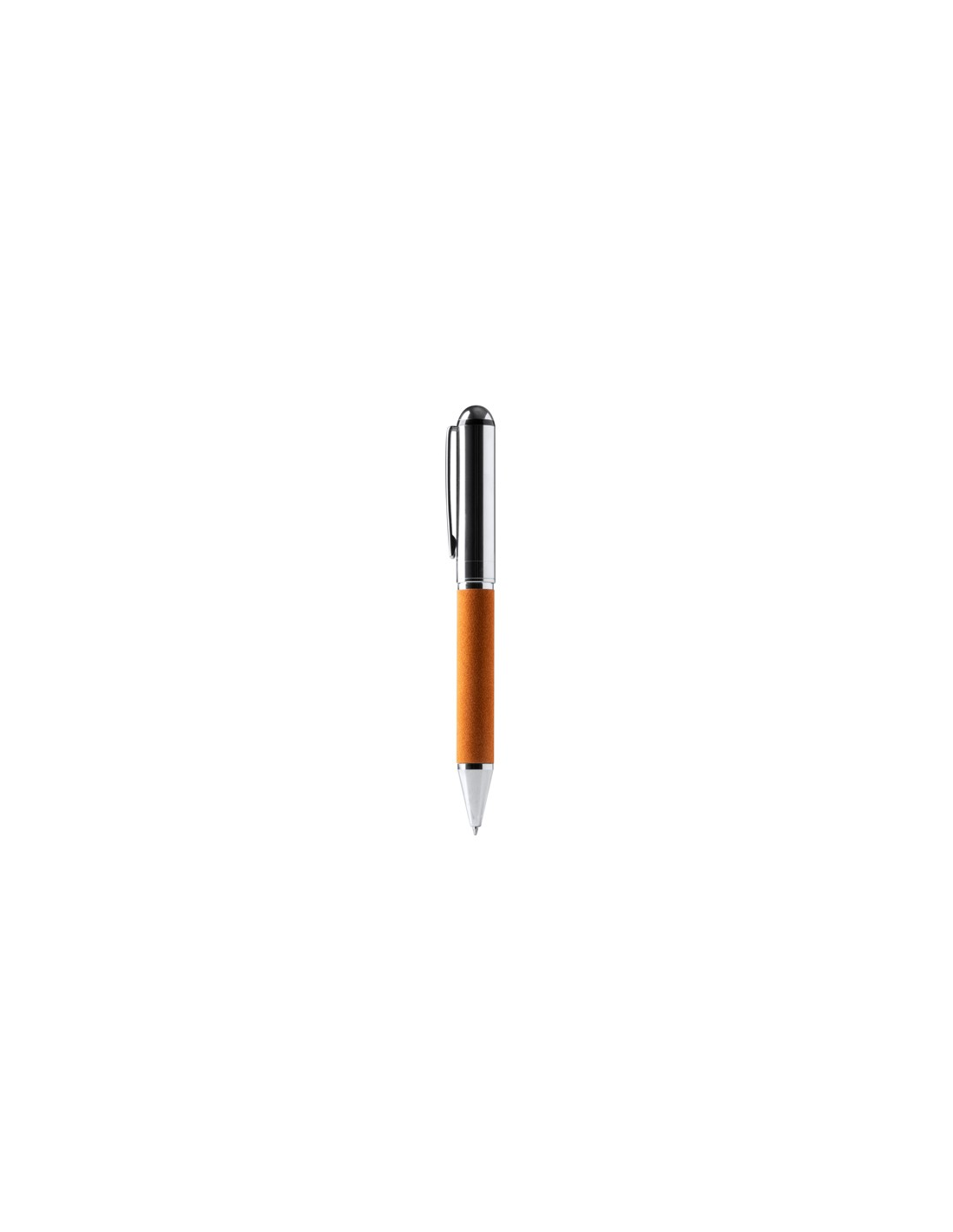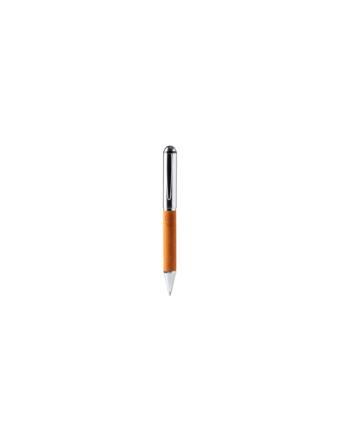 Przekręcany długopis z główną konstrukcją wykonaną z metalu i skóry pochodzącej z recyklingu. Niebieski atrament. Prezentacja w eko pudełku.