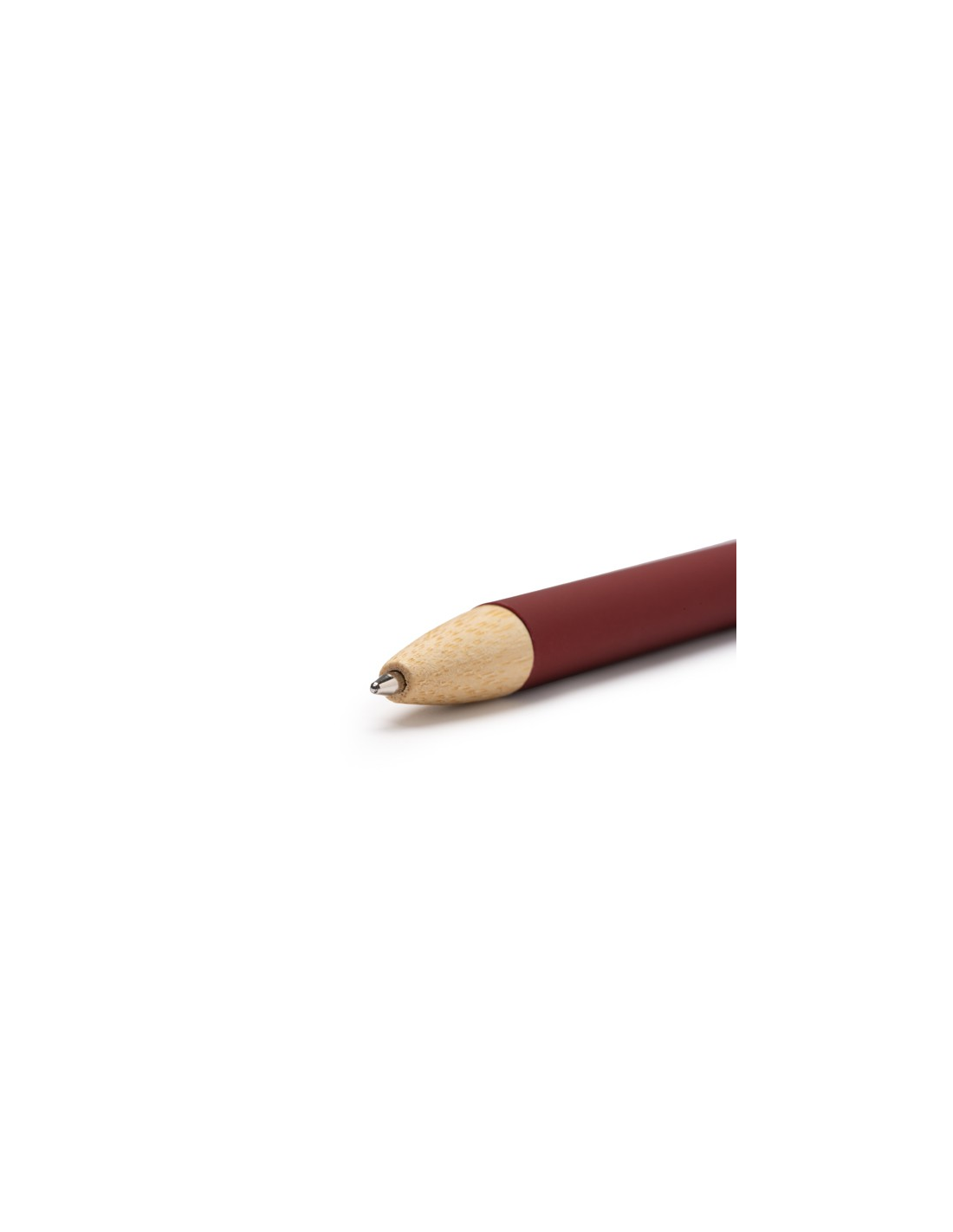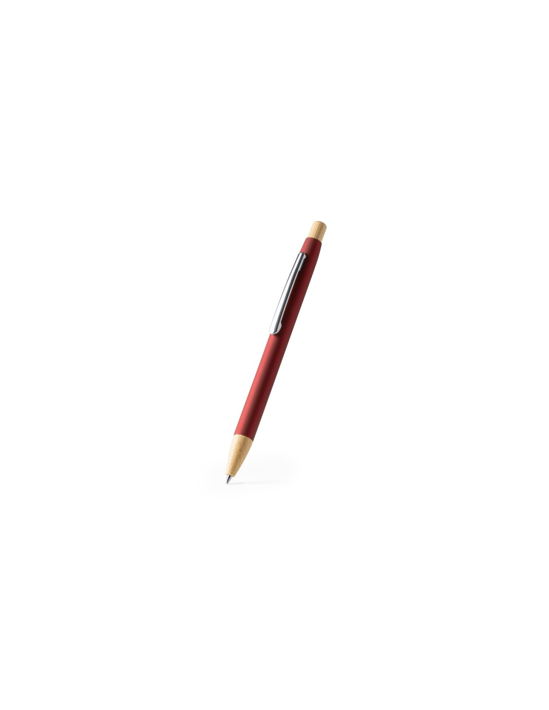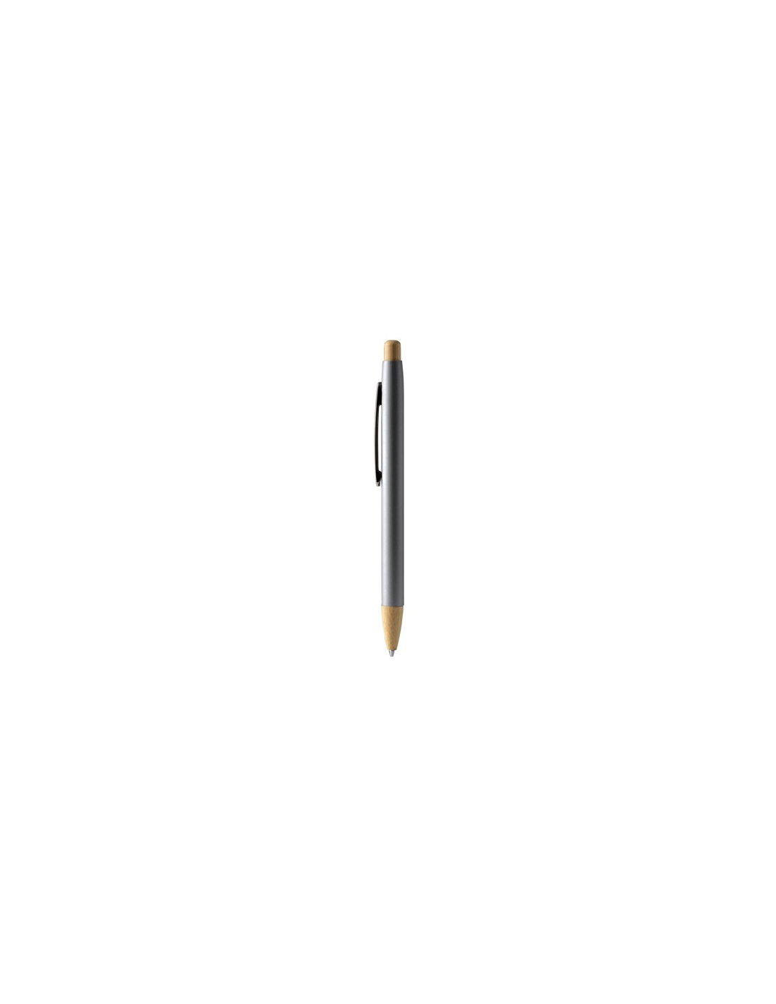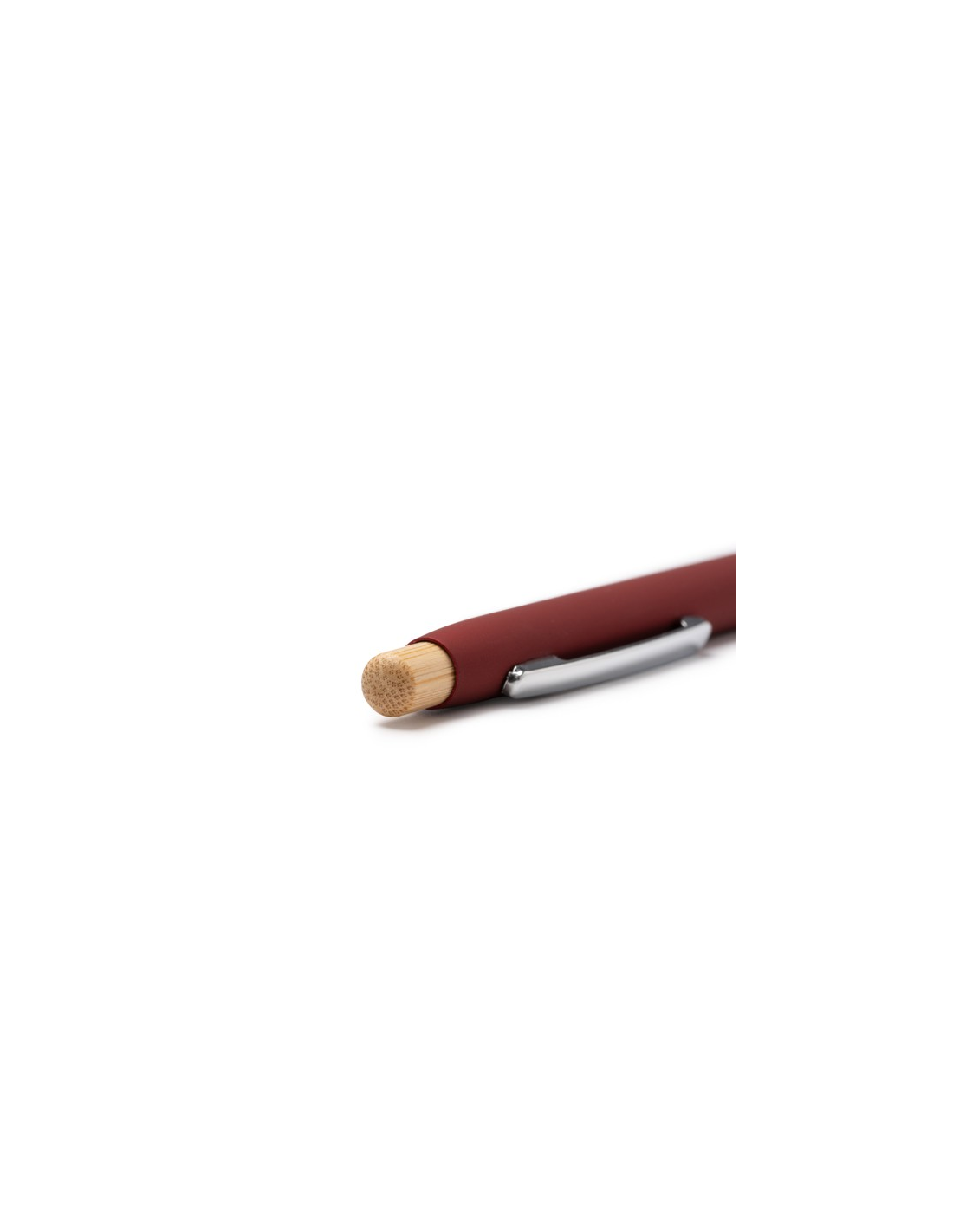 Gumowany metalowy długopis z przyciskiem i bambusowymi detalami, oferujący naturalny i zrównoważony design. Chromowany klips dodaje elegancji i funkcjonalności. Niebieski wkład Jumbo.