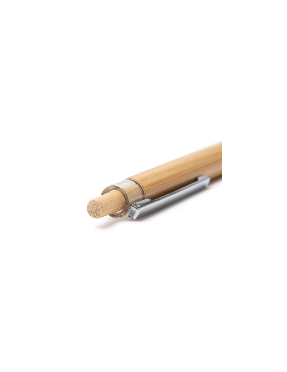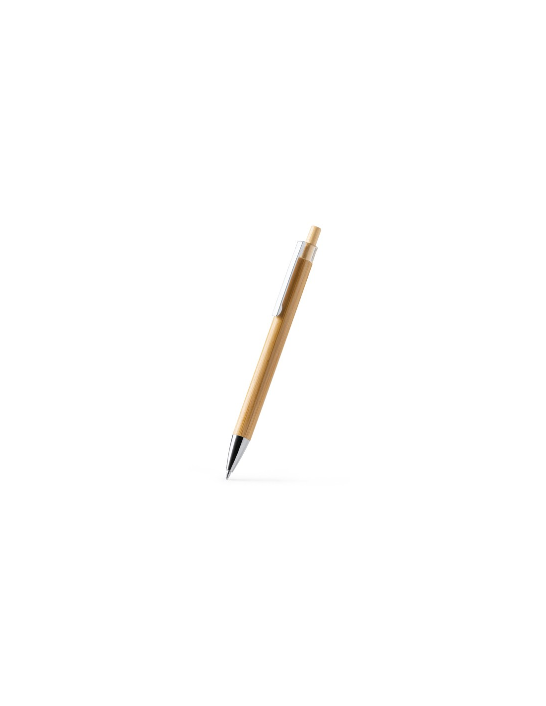Długopis z bambusowym korpusem i przyciskiem, metalowym klipsem i chromowanymi detalami. Niebieski tusz.