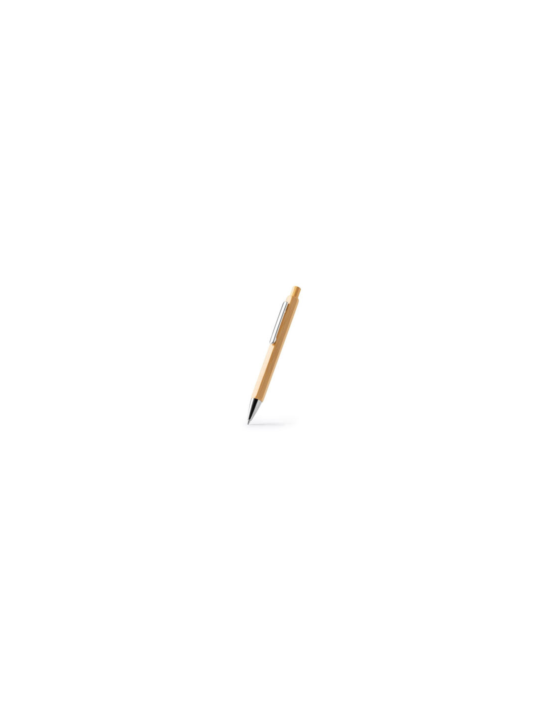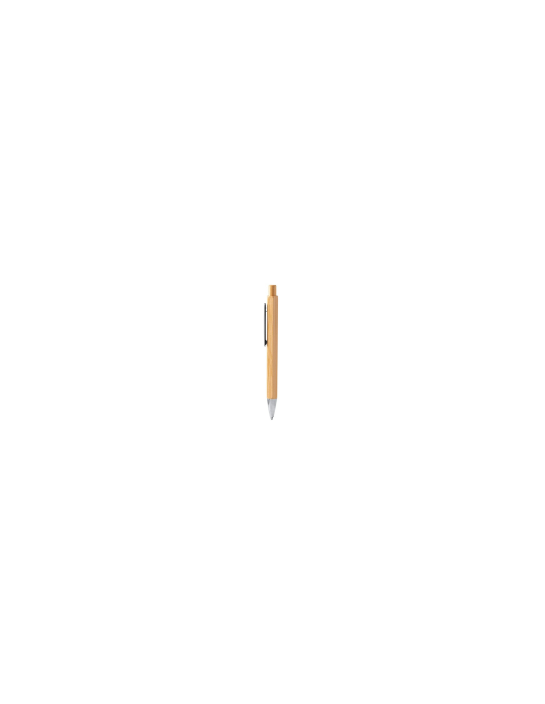 Sześciokątny długopis z metalowym korpusem i bambusowym przyciskiem. Chromowane detale. Niebieski tusz.