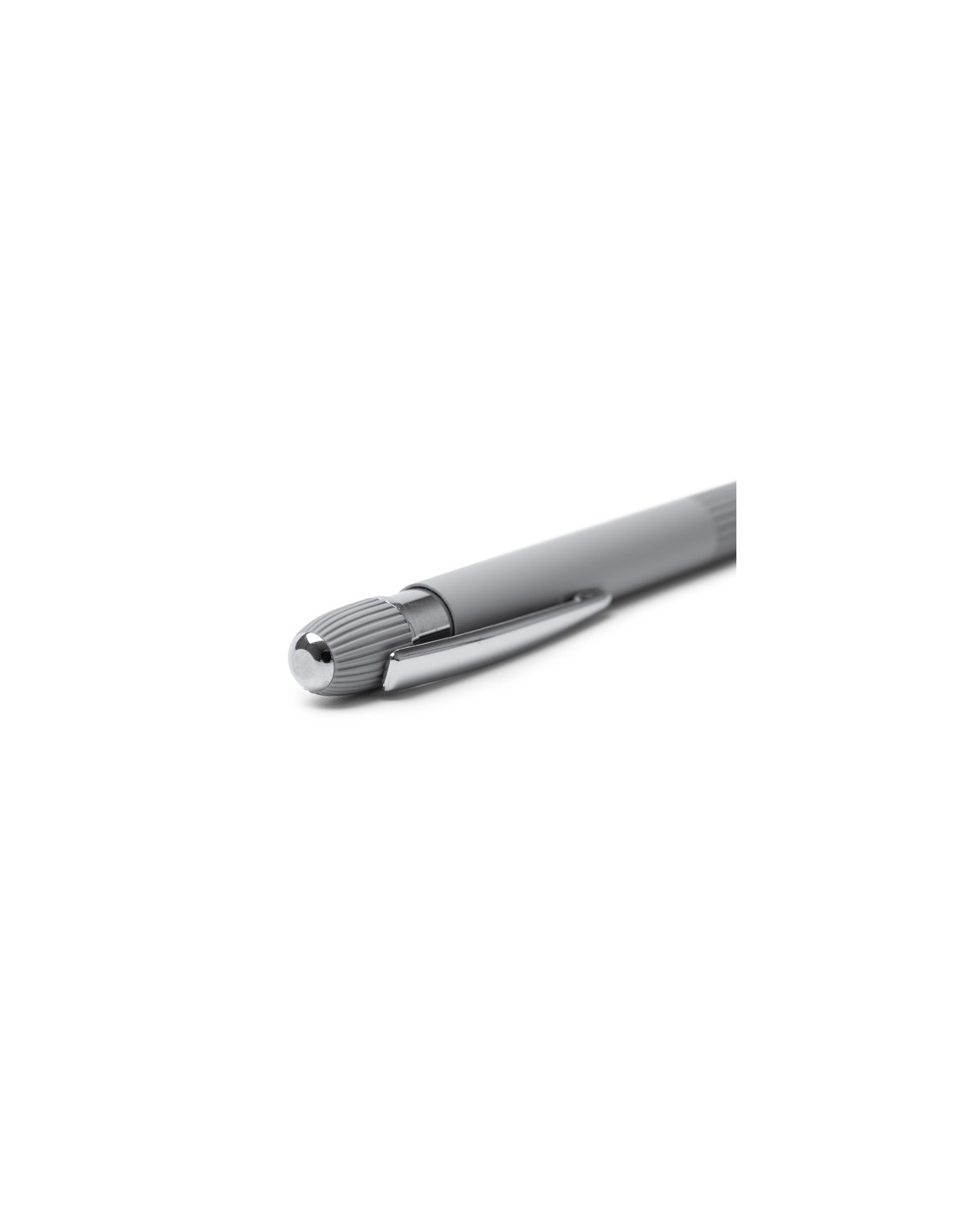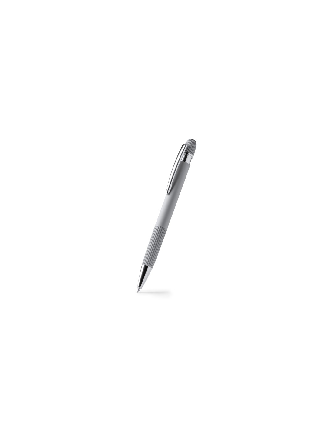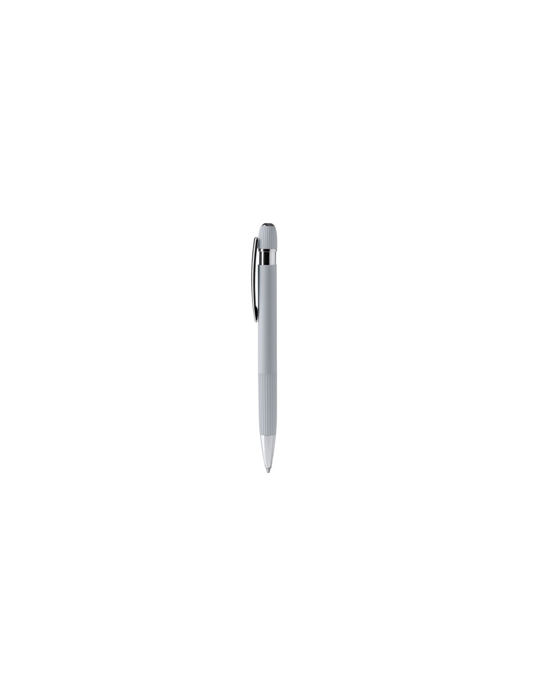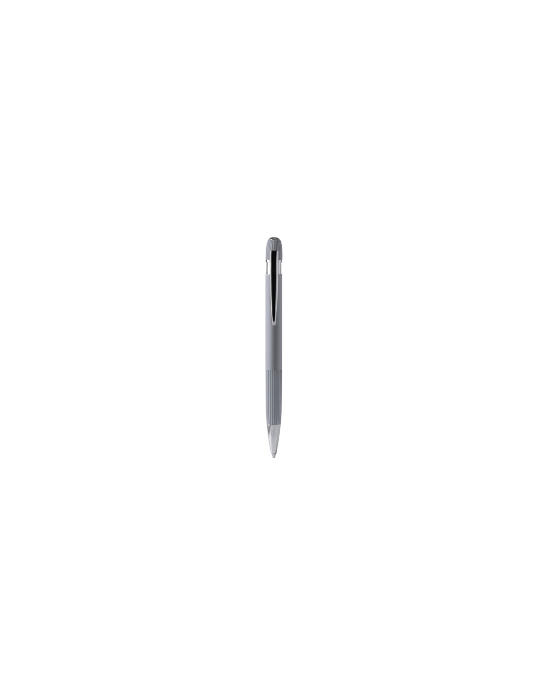 Długopis z korpusem w paski wykonanym z aluminium pochodzącego z recyklingu o matowym, gumowym wykończeniu. Detale o chromowanym wykończeniu. Wkład Jumbo z tuszem w kolorze niebieskim.