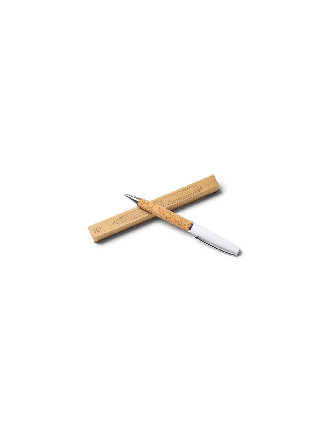 Przekręcany długopis z korpusem wykonanym z naturalnego korka i stali. Chromowane elementy szczegółowe. Niebieski atrament.