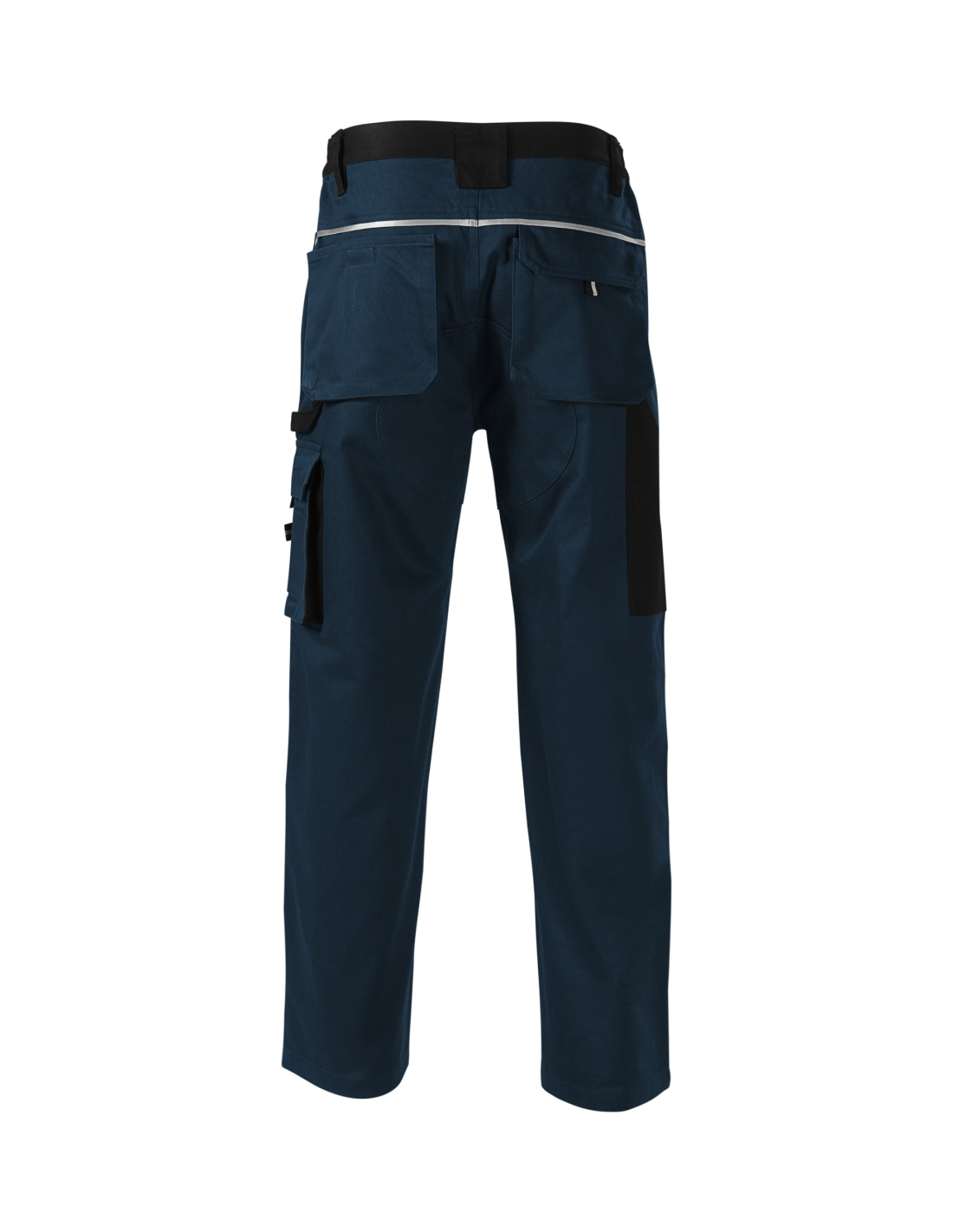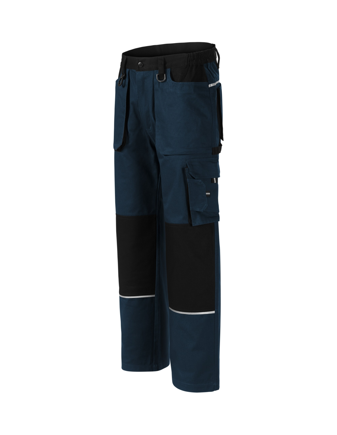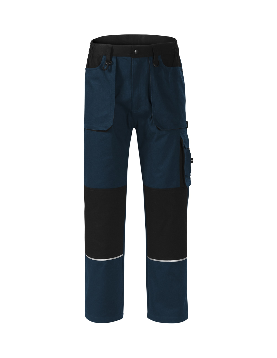 gumka wszyta w pasie na bokach, 7 wielofunkcyjnych kieszeni, wzmocniony materiał na kolanach i tylnej części, plastikowa zawieszka w kształcie litery D i wieszaczek na klucze i identyfikator, pętla na młotek, podwójne szwy dla większej trwałości, elementy refleksyjne